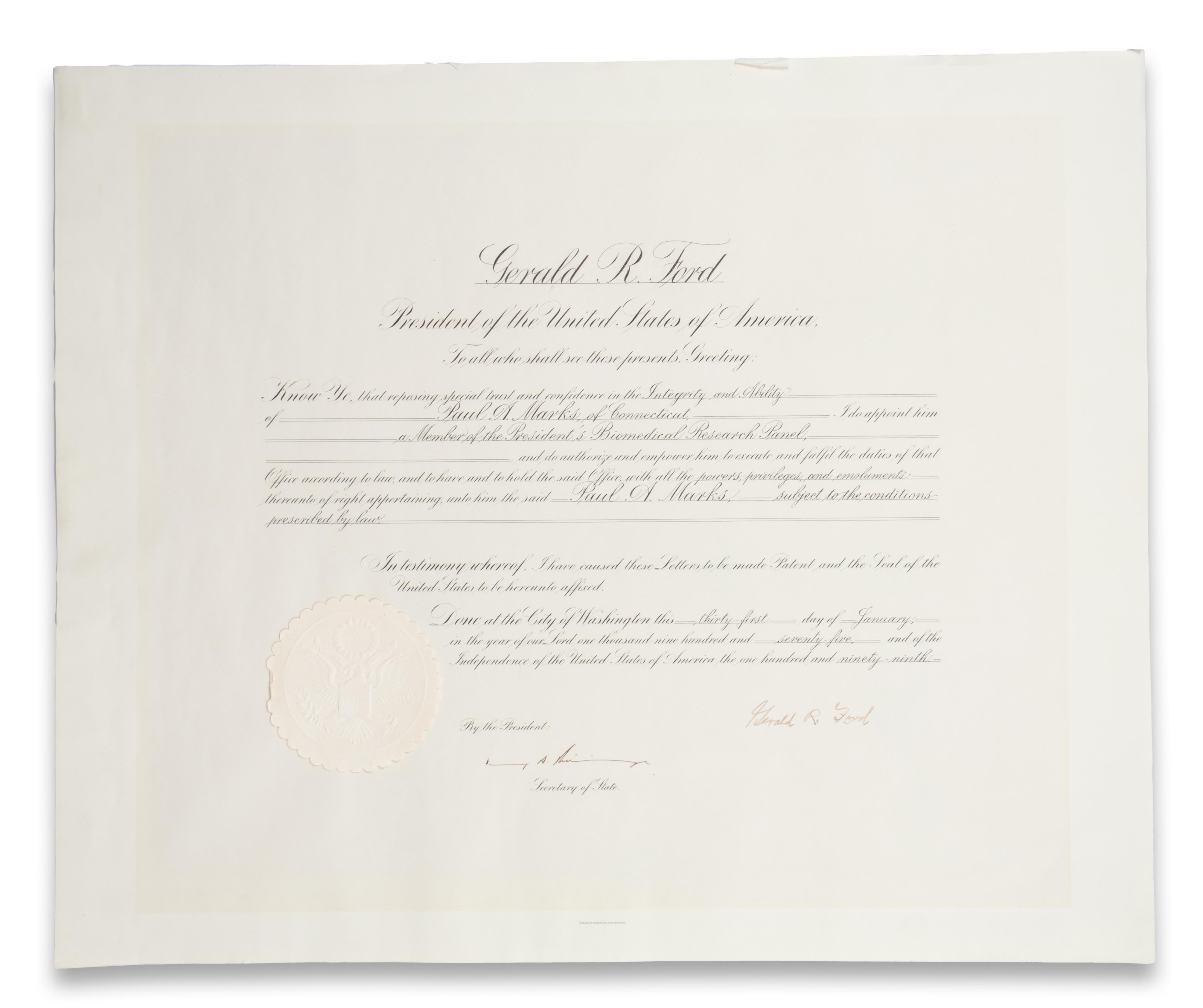 Paul A. Marks kinevezése az elnöki orvosbiológiai kutatócsoport tagjává. Egy nyomtatott oldal, papírfelzetes szárazpecséttel. Gerald Ford, az Egyesült Államok harmincnyolcadik elnökének autográf aláírása jobbra alul, mellette Henry Kissinger ellenjegyzésével. Kelt: Washington, 1975. január 31. Mérete: 400 x 450 mm.