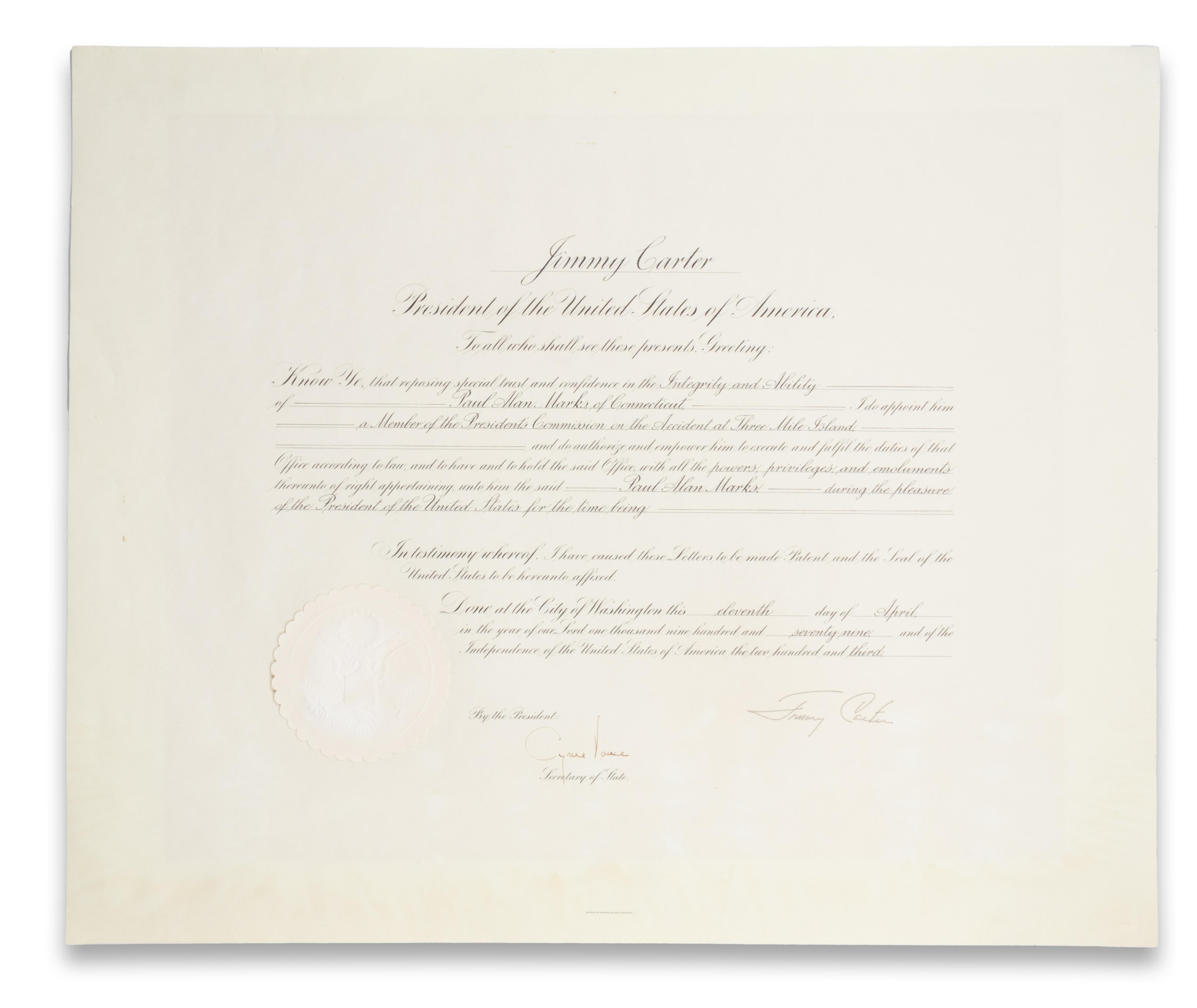 Paul Alan Marks kinevezése a Three Mile Island-i balesetet vizsgáló elnöki bizottság tagjává. Egy nyomtatott oldal, papírfelzetes szárazpecséttel. Jimmy Carter, az Egyesült Államok harminckilencedik elnökének autográf aláírása jobbra alul, mellette Cyrus Vance ellenjegyzésével. Kelt: Washington, 1979. április 11. Mérete: 400 x 450 mm.
