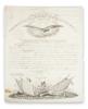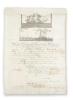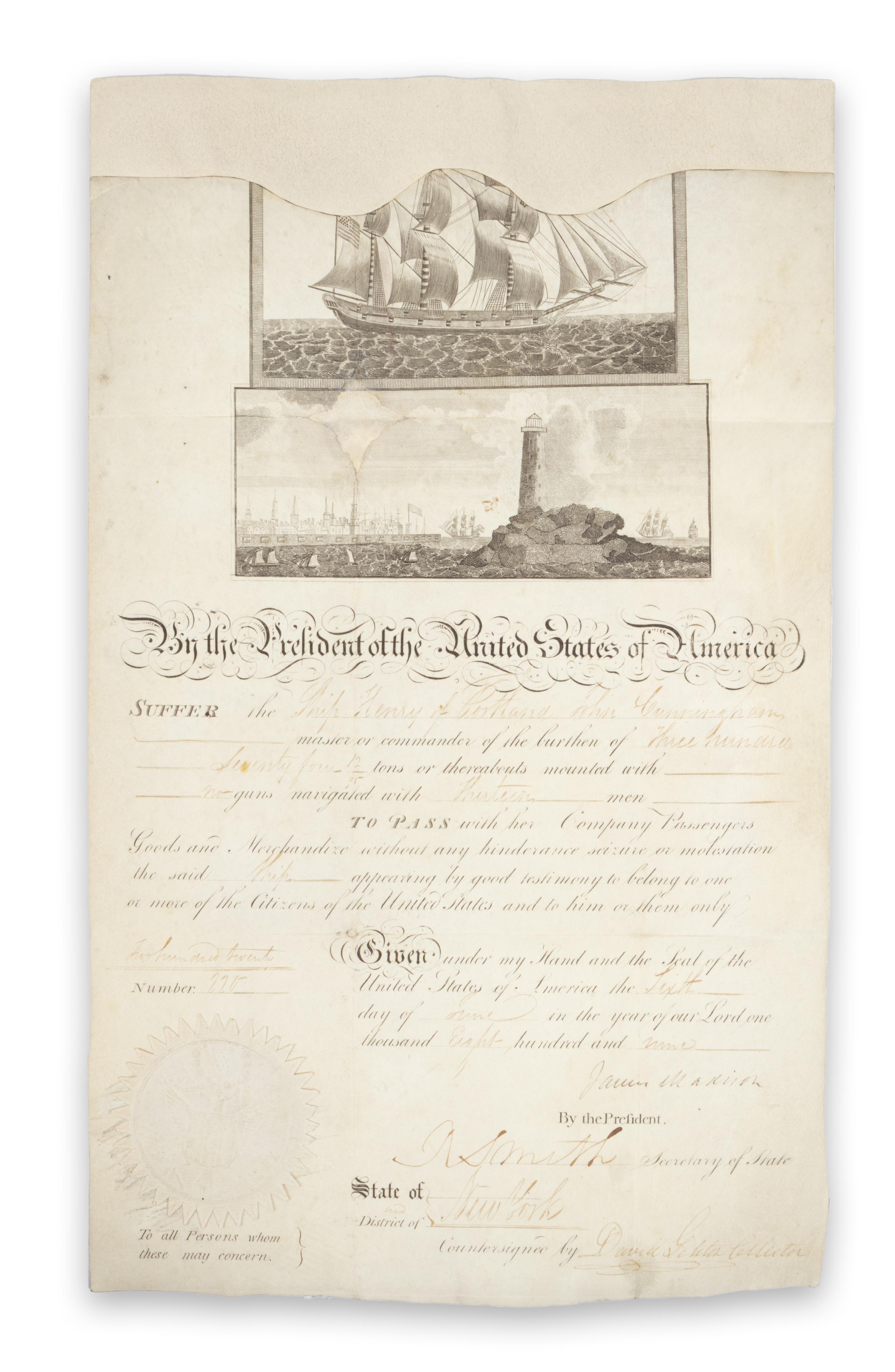 Ship's passport issued to John Cunningham, captain of the Henry, of Portland. Featuring a scalloped upper edge, with copper-engraved vignettes of a sailing ship and a coastal landscape. One printed page with a white paper seal. Signed by James Madison, fourth President of the United States, countersigned by Robert Smith, Secretary of State. Place and date: Washington, June 6, 1809. Dimensions: 405 x 265 mm.