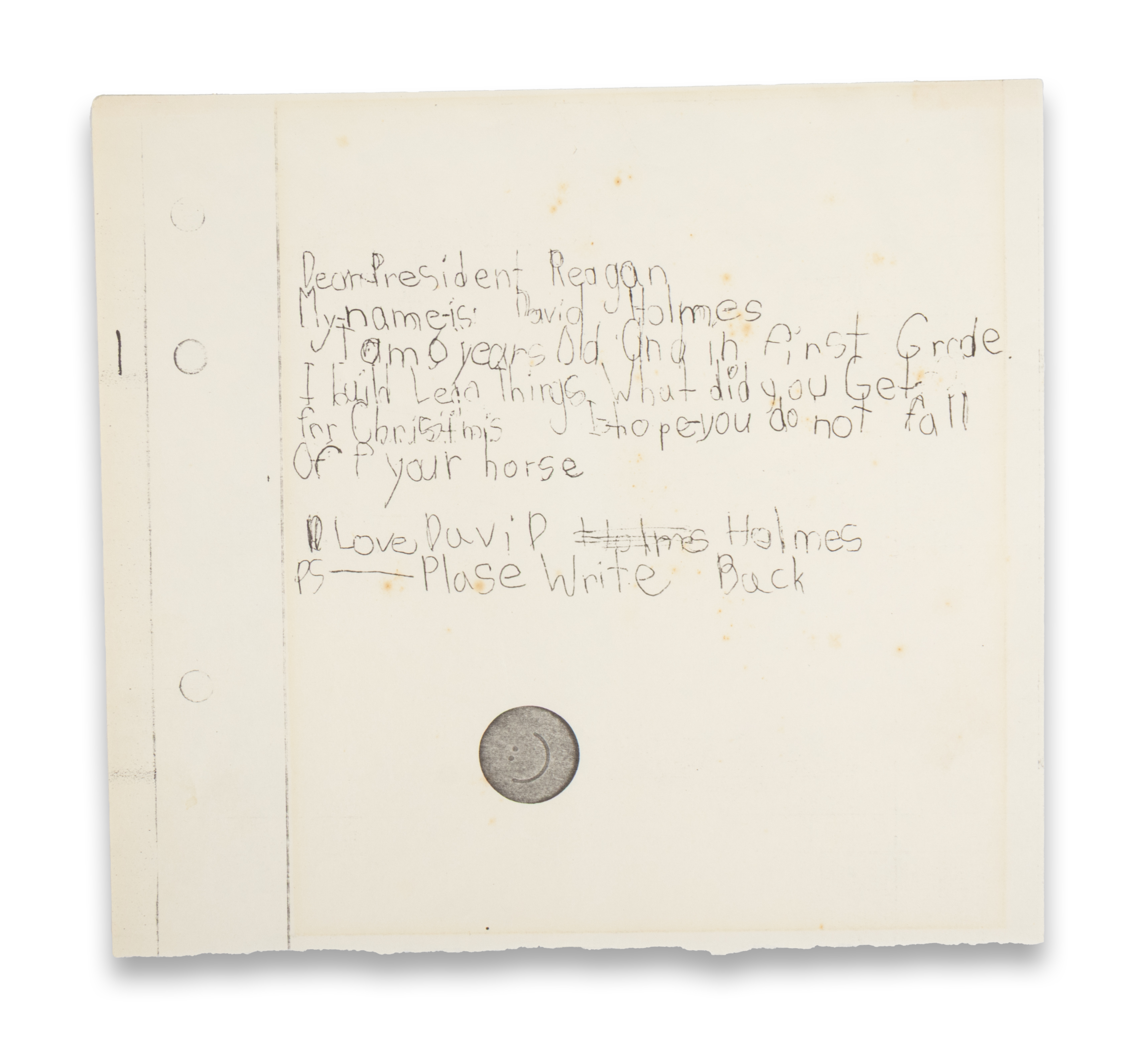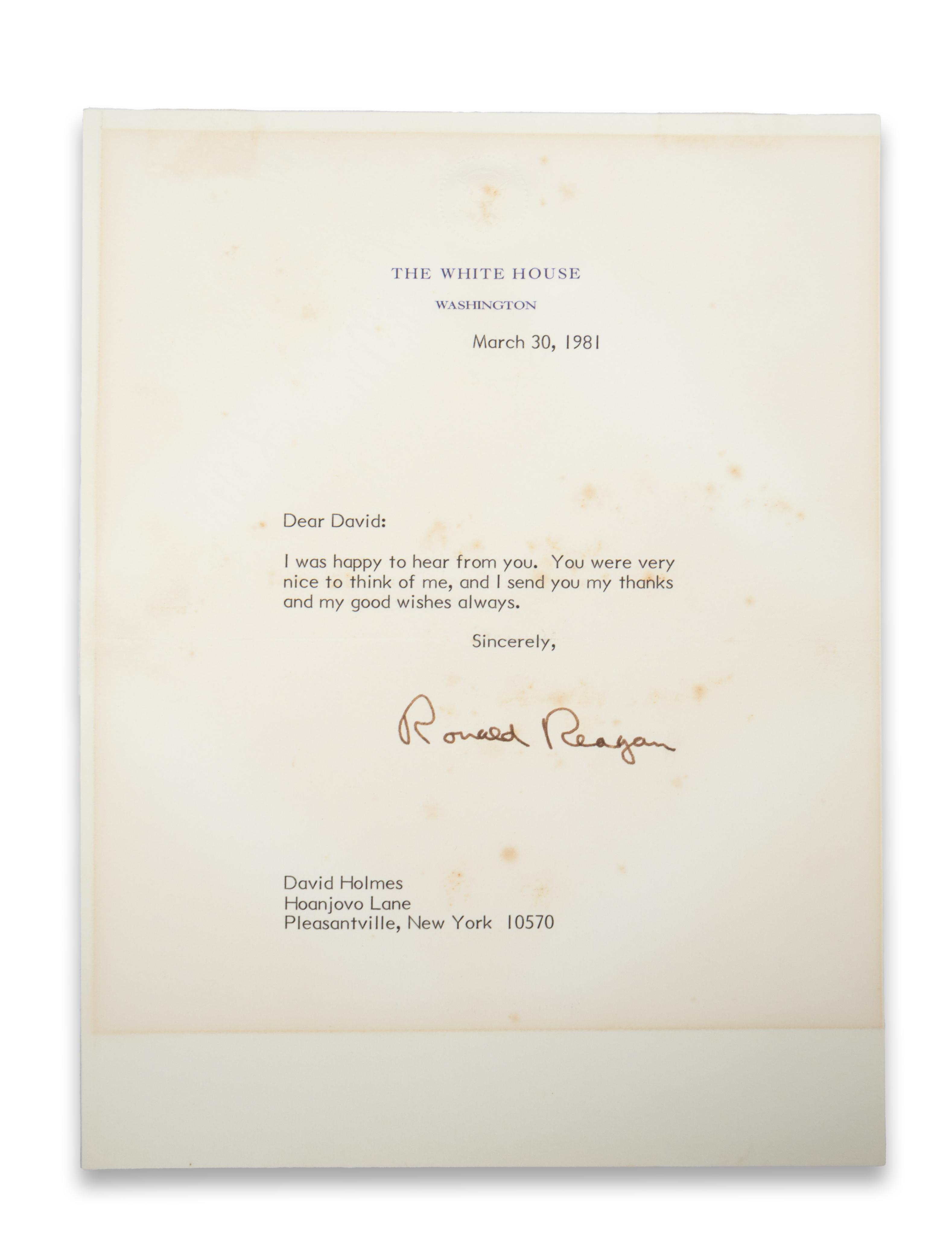 Kedves válaszlevél a hatéves David Holmes-nak, aki érdeklődött, mit kapott karácsonyra, és reményét fejezte ki, hogy az elnök nem esik le a lováról. Egy gépelt oldal, a Fehér Ház fejléces levélpapírján. Ronald Reagan, az Egyesült Államok negyvenedik elnökének autográf aláírásával. Kelt: Washington, 1981. március 30. Mérete: 225 x 170 mm.