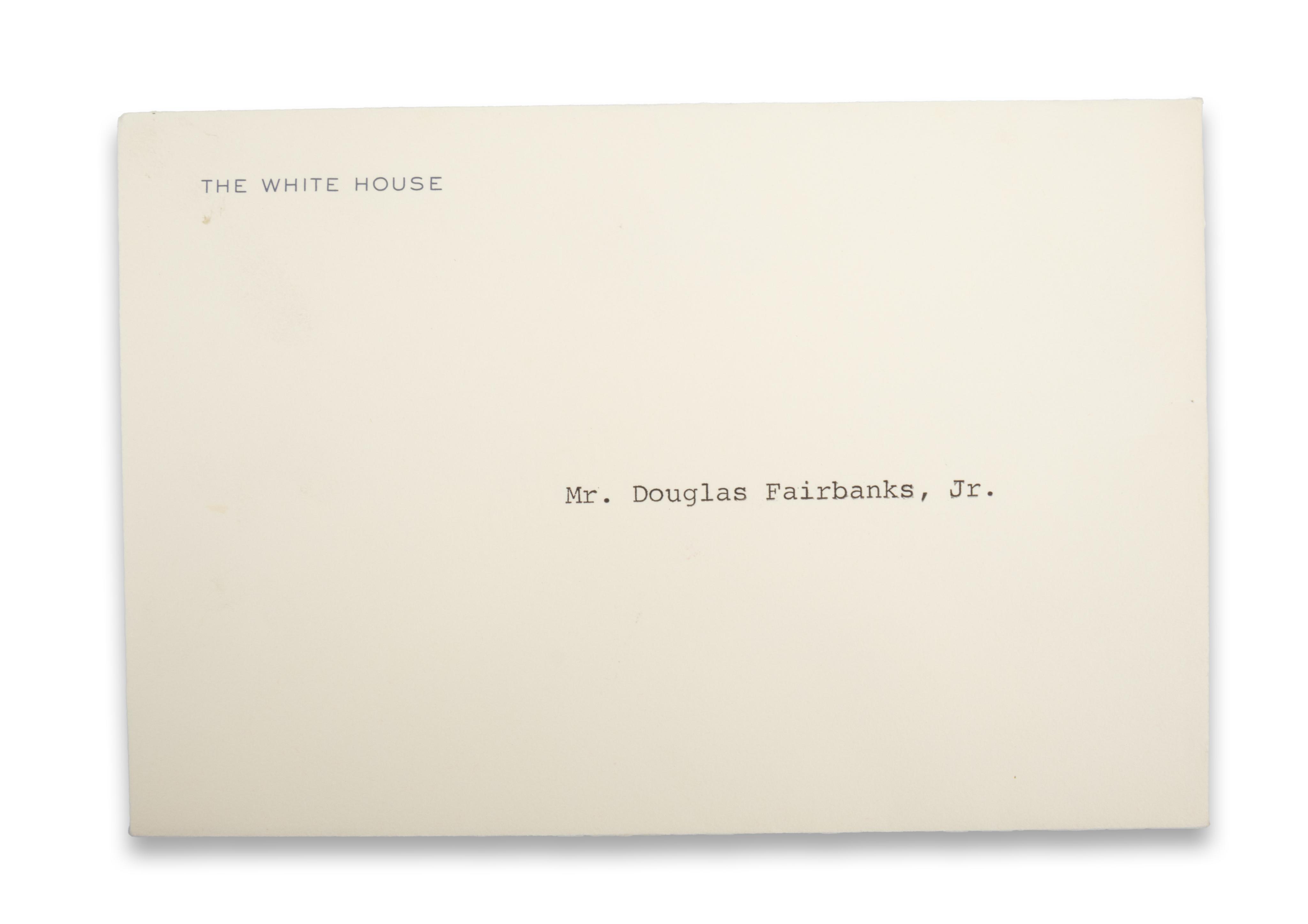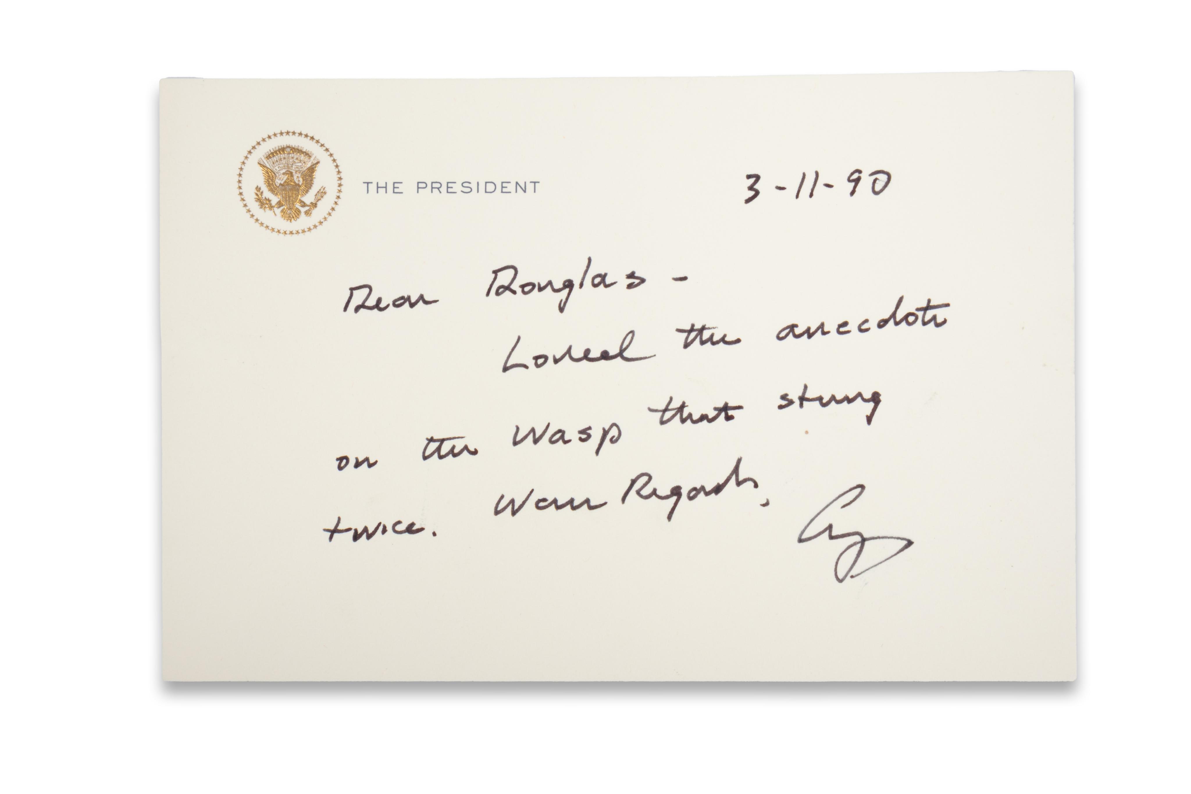 Baráti hangvételű köszönő kártya Douglas Fairbanks Jr. színésznek címezve. Egy kézzel írt oldal, „The President” fejléccel. Boríték mellékelve. Kelt: Washington, 1990. november 3. Mérete: 105 x 160 mm.