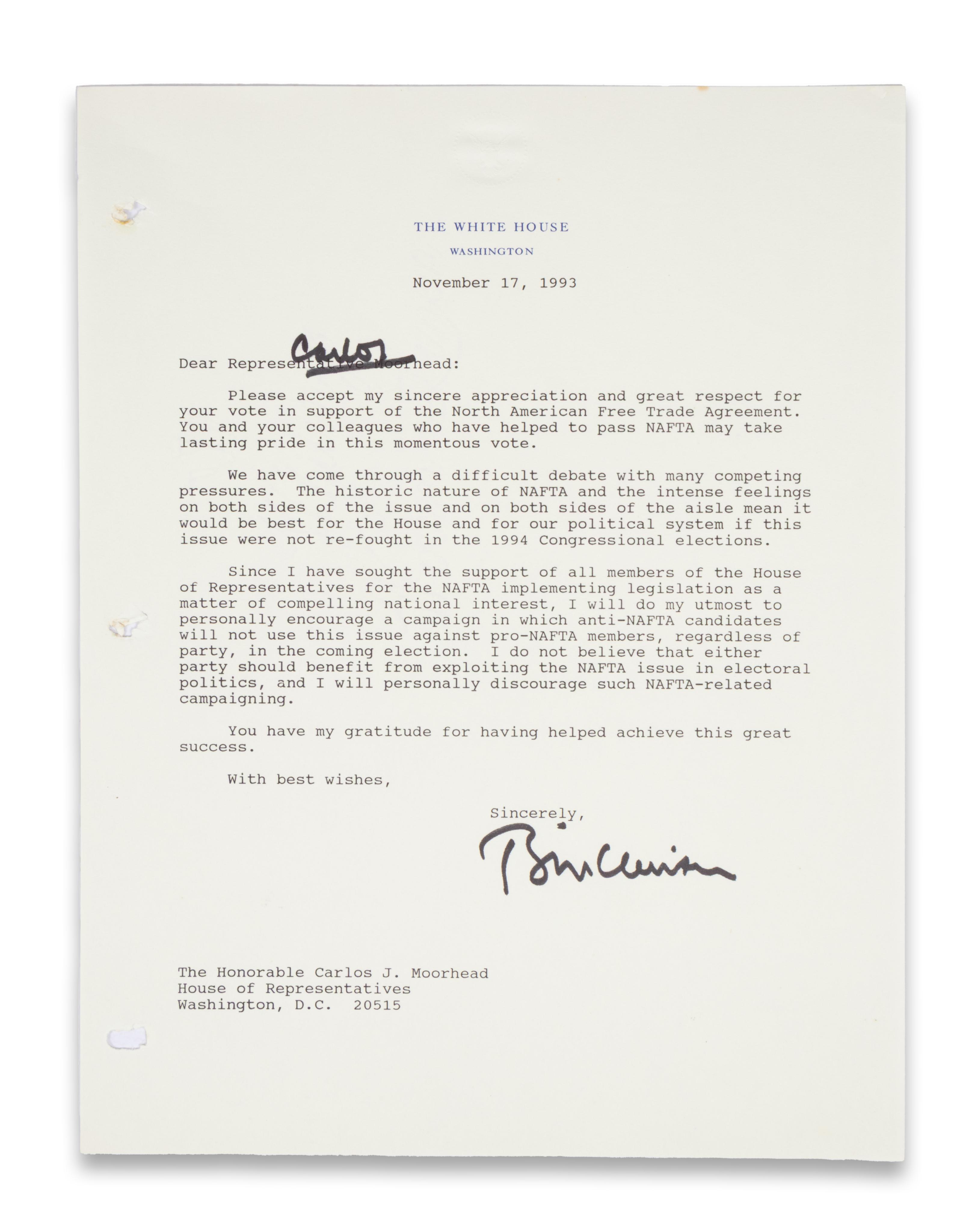 Levél Carlos J. Moothead kaliforniai képviselőnek a következő év elején életbe lépő Észak-amerikai Szabadkereskedelmi Egyezményről (NAFTA). Bill Clinton, az Egyesült Államok negyvenkettedik elnökének saját kezű javításával és aláírásával. Egy gépelt oldal, a Fehér Ház fejléces levélpapírján. Kelt: Washington, 1993. november 17. Mérete: 280 x 215 mm.