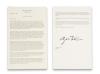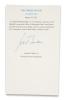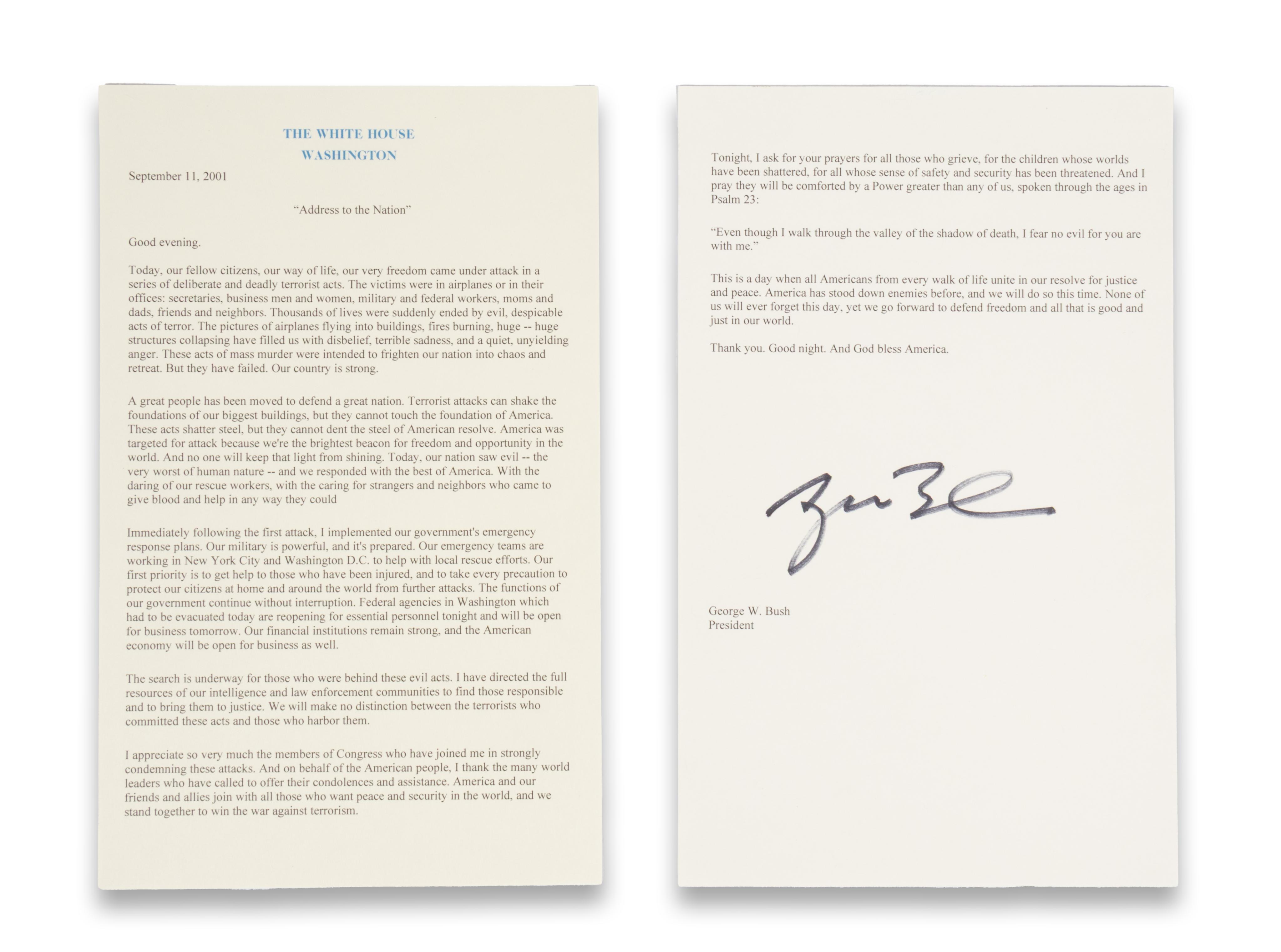 A signed copy of the President’s address to the nation on the evening of the 9/11 attacks. Two pages on White House stationery. Place and date: Washington, September 11, 2001. Dimensions: 210 x 130 mm.