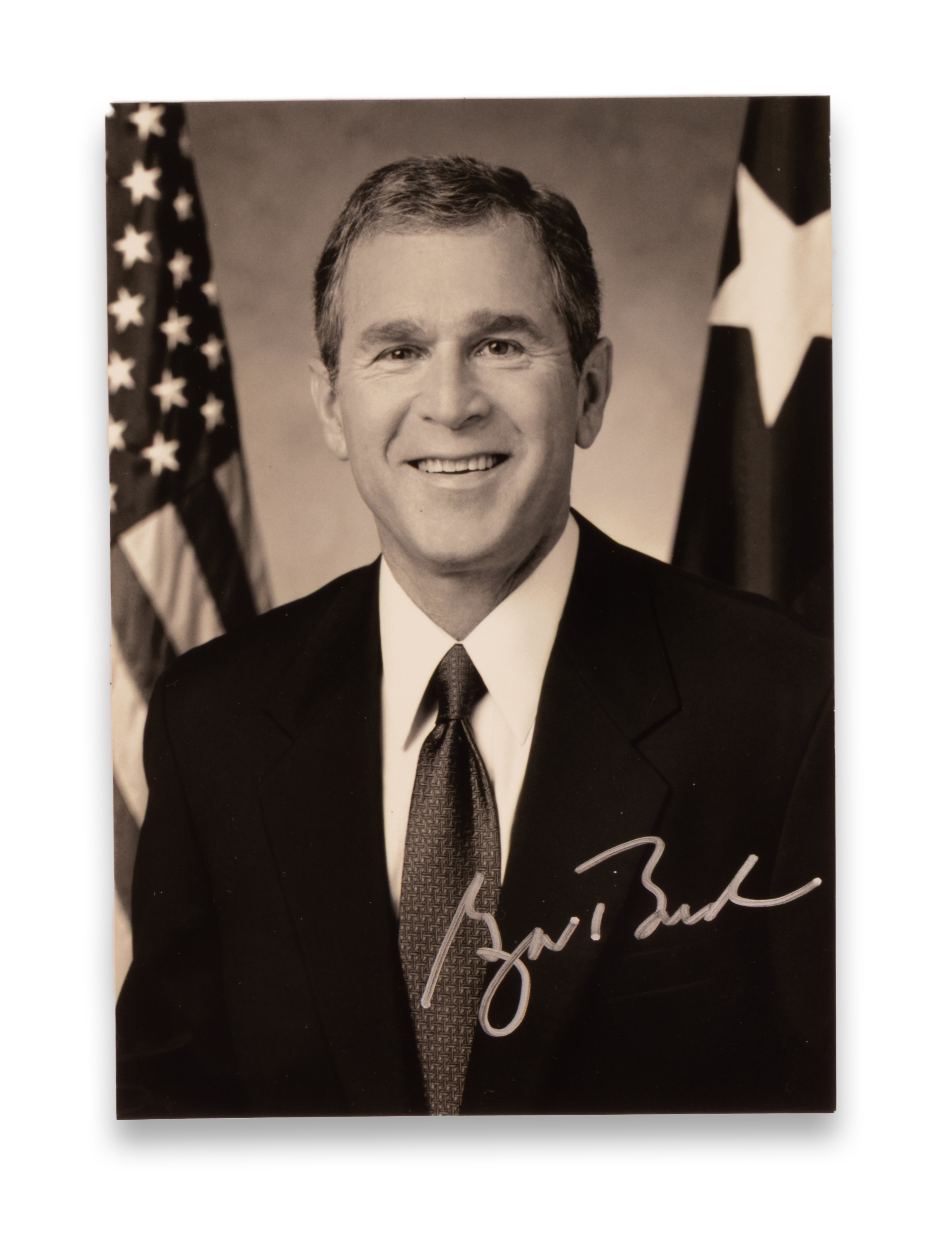 A 9/11-es terrortámadások estéjén az Amerikai Egyesült Államok népéhez intézett híres kiáltvány, több példányban készült, az elnök autográf aláírásával. Két gépelt (nyomtatott) oldal, a Fehér Ház fejléces papírján. Kelt: Washington, 2001. szeptember 11. Mérete: 210 x 130 mm.