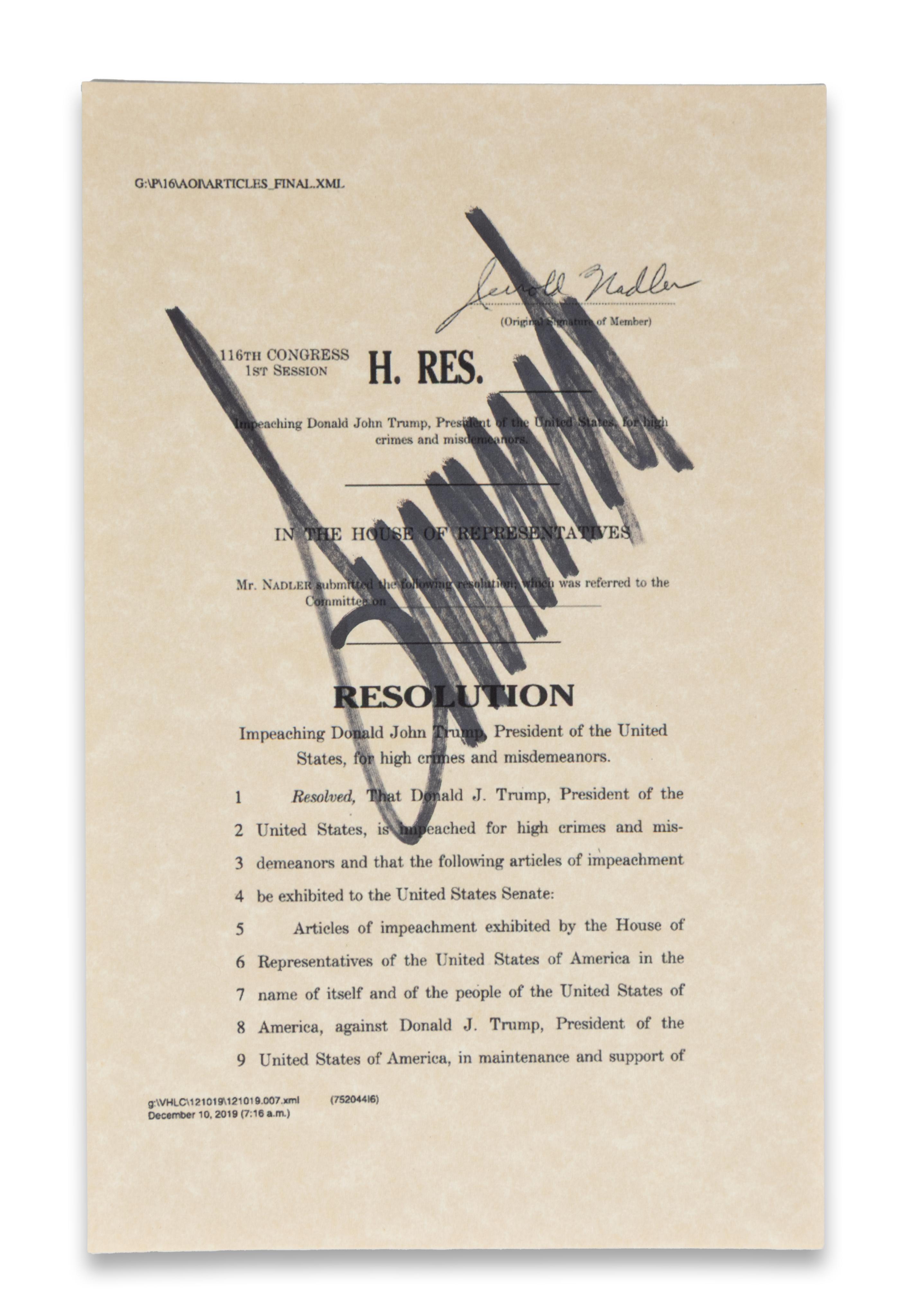 A signed copy of the first page of the Articles of Impeachment against the President, from the congressional session in which the Democrats voted to impeach him. One printed page. Place and date: s.l., after December 18, 2019. Dimensions: 146 x 232 mm.