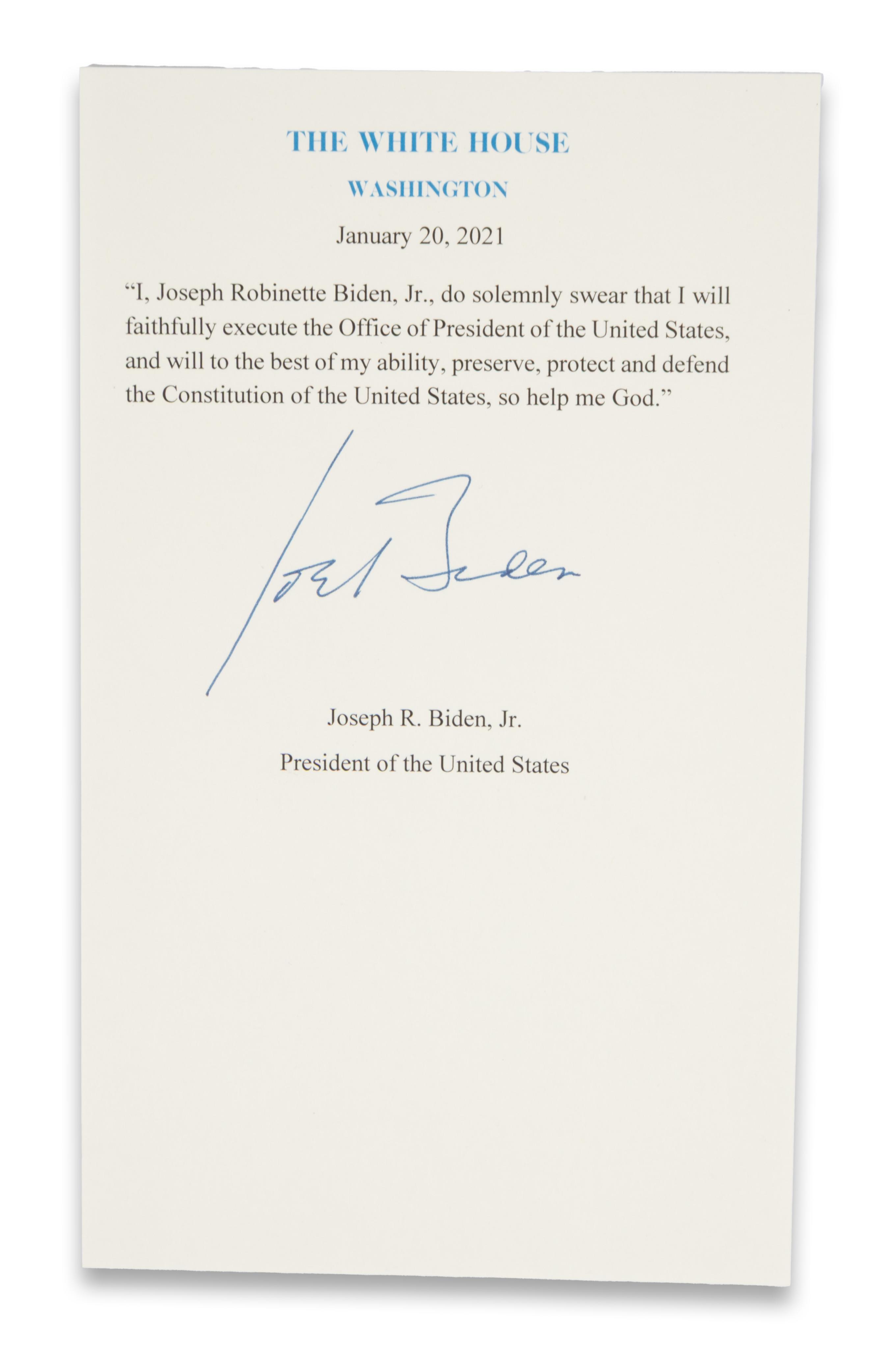 A signed copy of the first sentence of the Presidential Oath of Office. One printed page on White House stationery. Date: 20 January 2021. Dimensions: 210 x 125 mm.