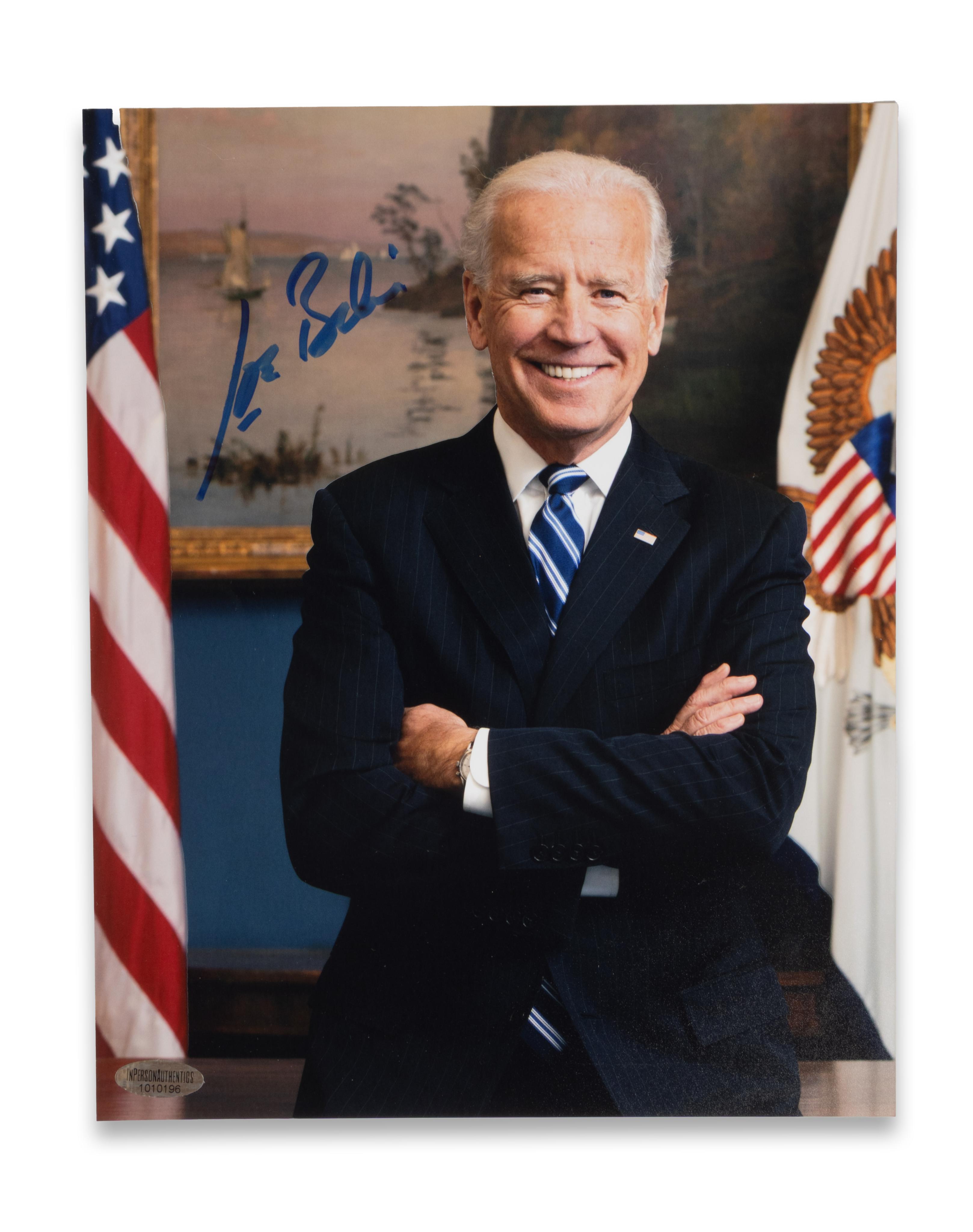 Az elnök autográf aláírása a beiktatási eskü első mondatának sokszorosított példányán. Egy nyomtatott oldal, a Fehér Ház fejléces papírján. Kelt: Washington, 2021. január 20. Mérete: 210 x 125 mm.