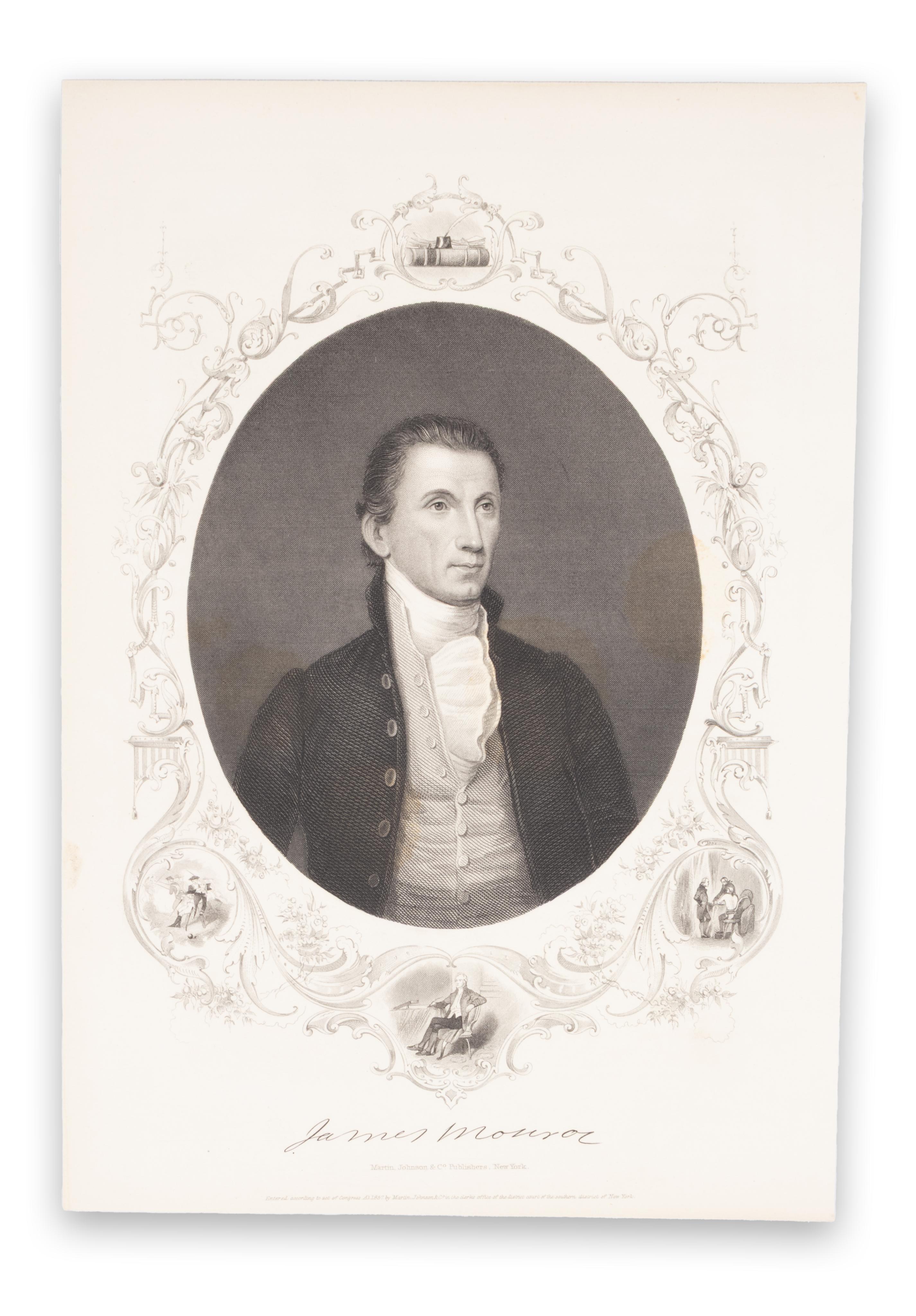 Land grant issued to two veterans in the valley of the Ohio River. One printed page with a white paper wafer seal. Signed by James Monroe, 5th President of the United States, countersigned by Josiah Meigs, Commissioner of the General Land Office. Place and date: Washington, October 7, 1819. Dimensions: 455 x 285 mm. With: Steel engraving of the President. Dimensions: 270 x 190 mm.