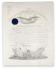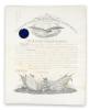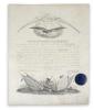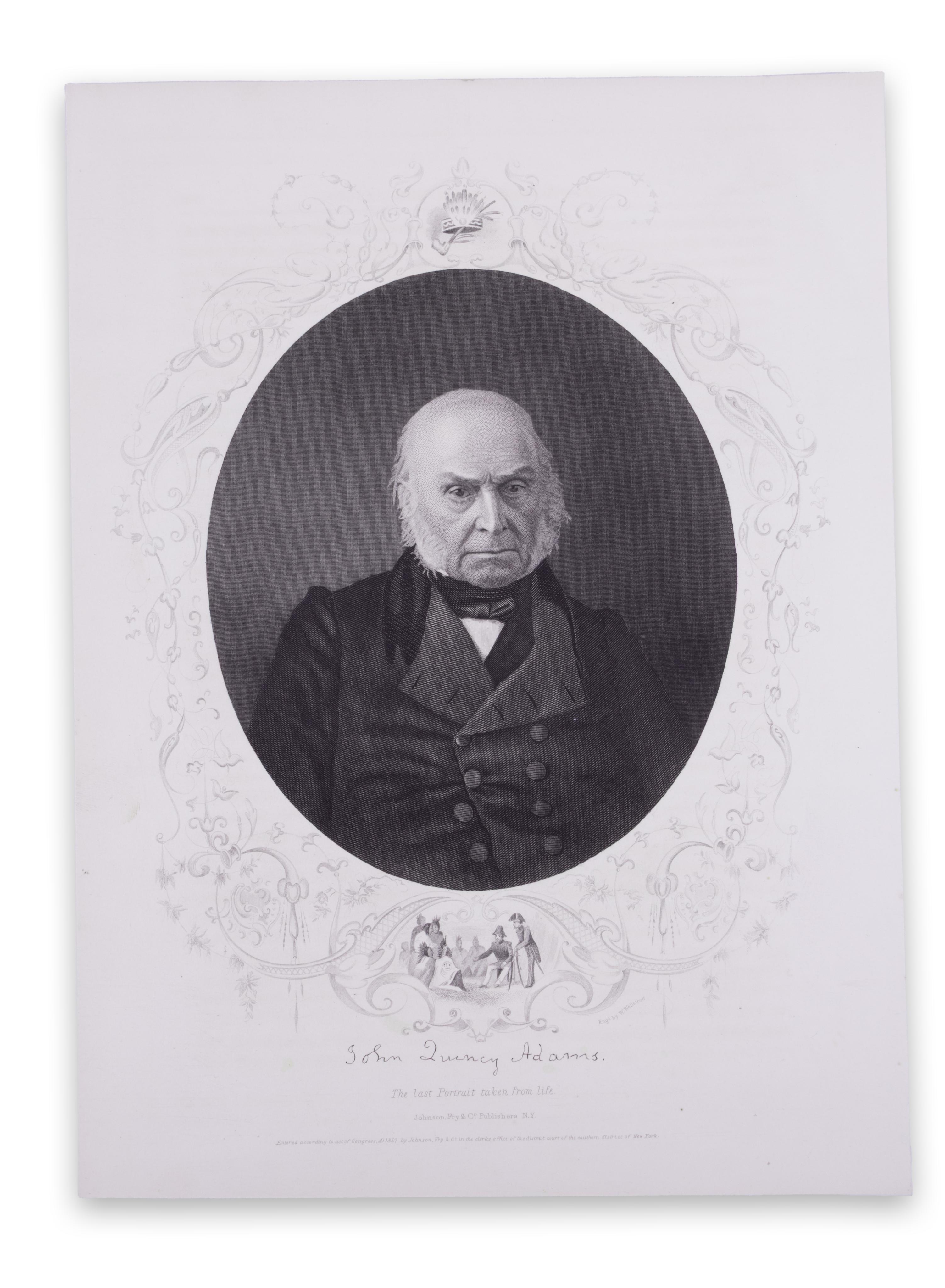 Ship's passport issued to the brig called Quito. Featuring a scalloped upper edge, with copper-engraved vignettes of a sailing ship and a coastal landscape. One printed page with a white paper wafer seal. Signed by John Quincy Adams, 6th President of the United States, countersigned by Henry Clay, Secretary of State. Place and date: New York, February 13, 1826. Dimensions: 385 x 290 mm.