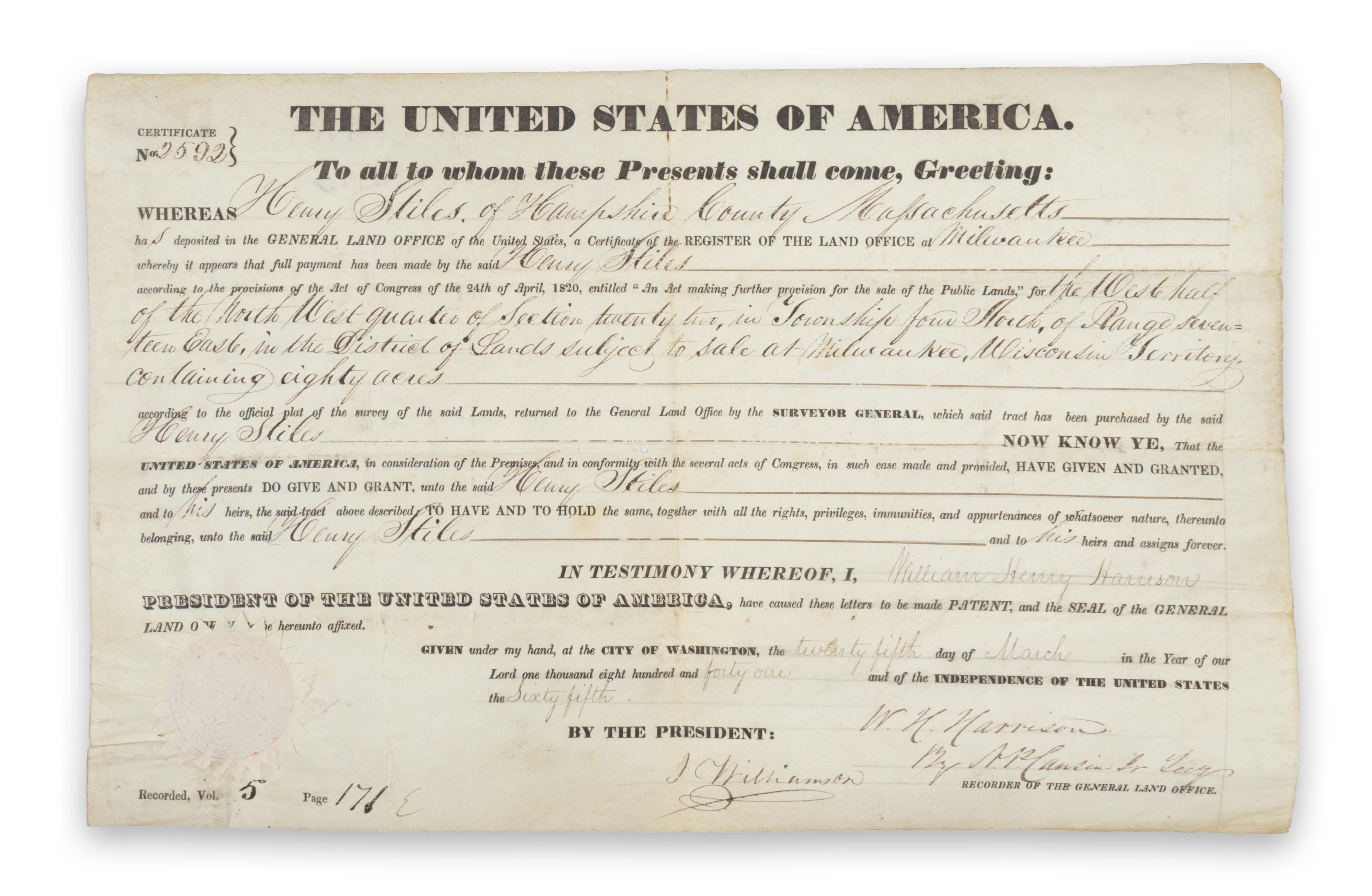 Land grant issued to Henry Stiles of Massachusetts. Due to the President's illness, most presidential documents from this period – including this one – were signed by his secretary on his behalf. One printed page with a paper wafer seal. Countersigned by J. Williamson, Recorder of the General Land Office. Place and date: Washington, March 25, 1841. Dimensions: 260 x 415 mm