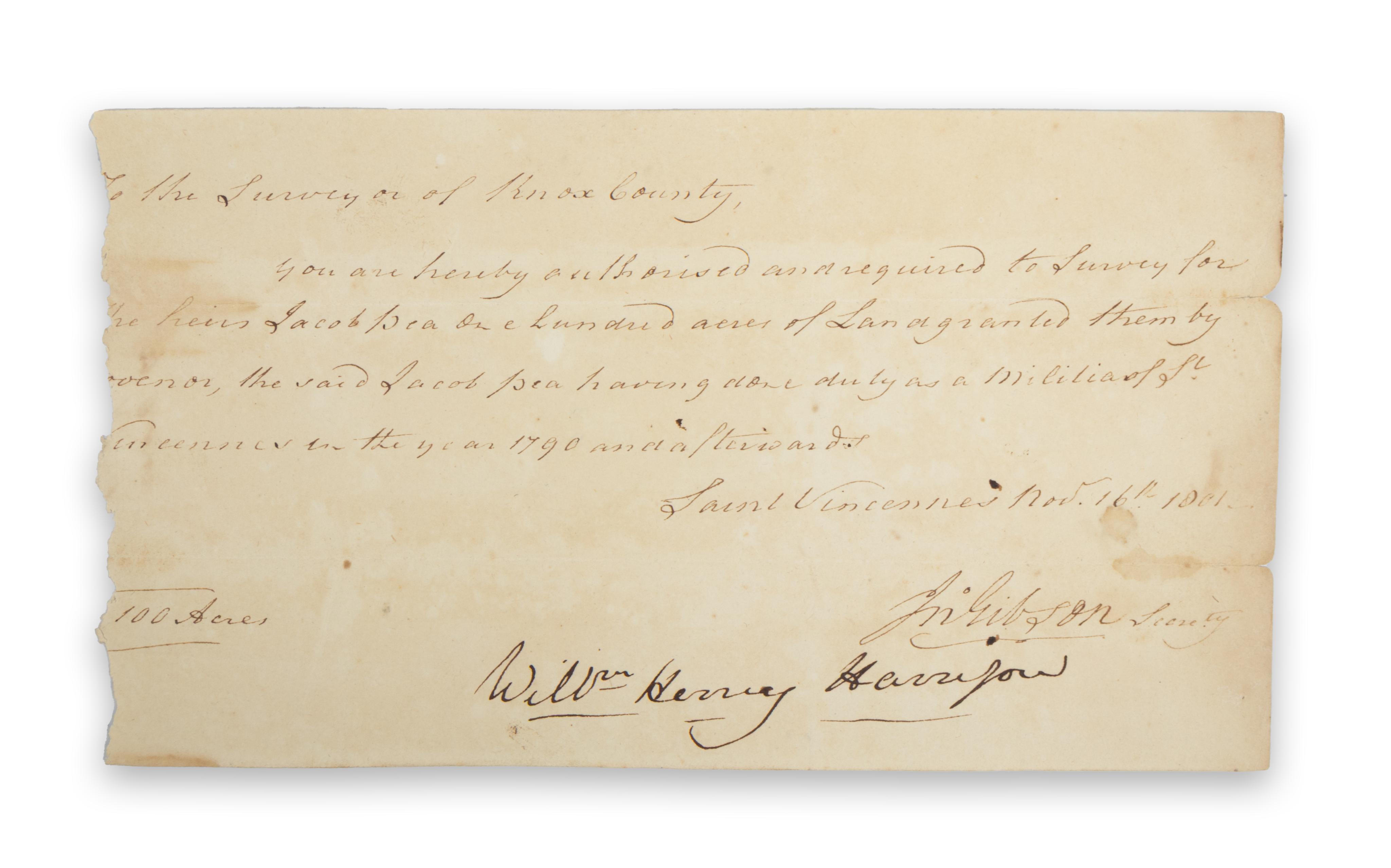 With: An official document addressed to the Surveyor of Knox County, bearing the autograph signature of William Henry Harrison as Governor of Indiana Territory. Place and date: Saint Vincennes, November 16, 1801. Dimensions: 108 x 185 mm.
