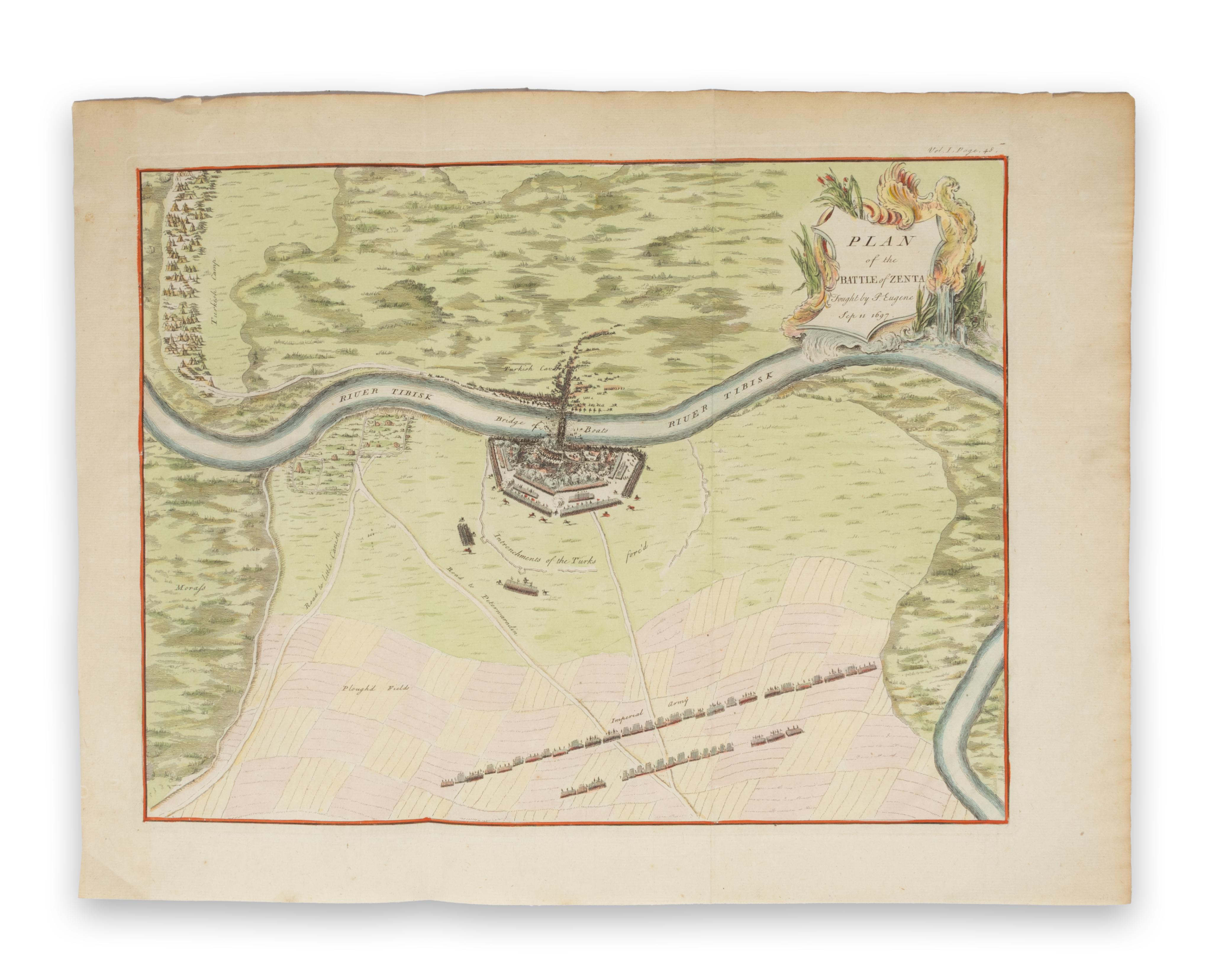 A zentai csata színezett, rézmetszetű látképe, amely Jean Dumont és Jean Rousset de Missy „Savoyai Jenő herceg és John, Marlborough hercege hadtörténete” című (John Campbell által fordított) művében jelent meg. A metsző, Claude du Bosc, a várost és környezetét a török és a keresztény csapatok állásaival együtt ábrázolta; a címkartus a jobb felső részben látható. Jelen példány 1737 után látott napvilágot (az első kiadás még nem tartalmazott oldalszámot).