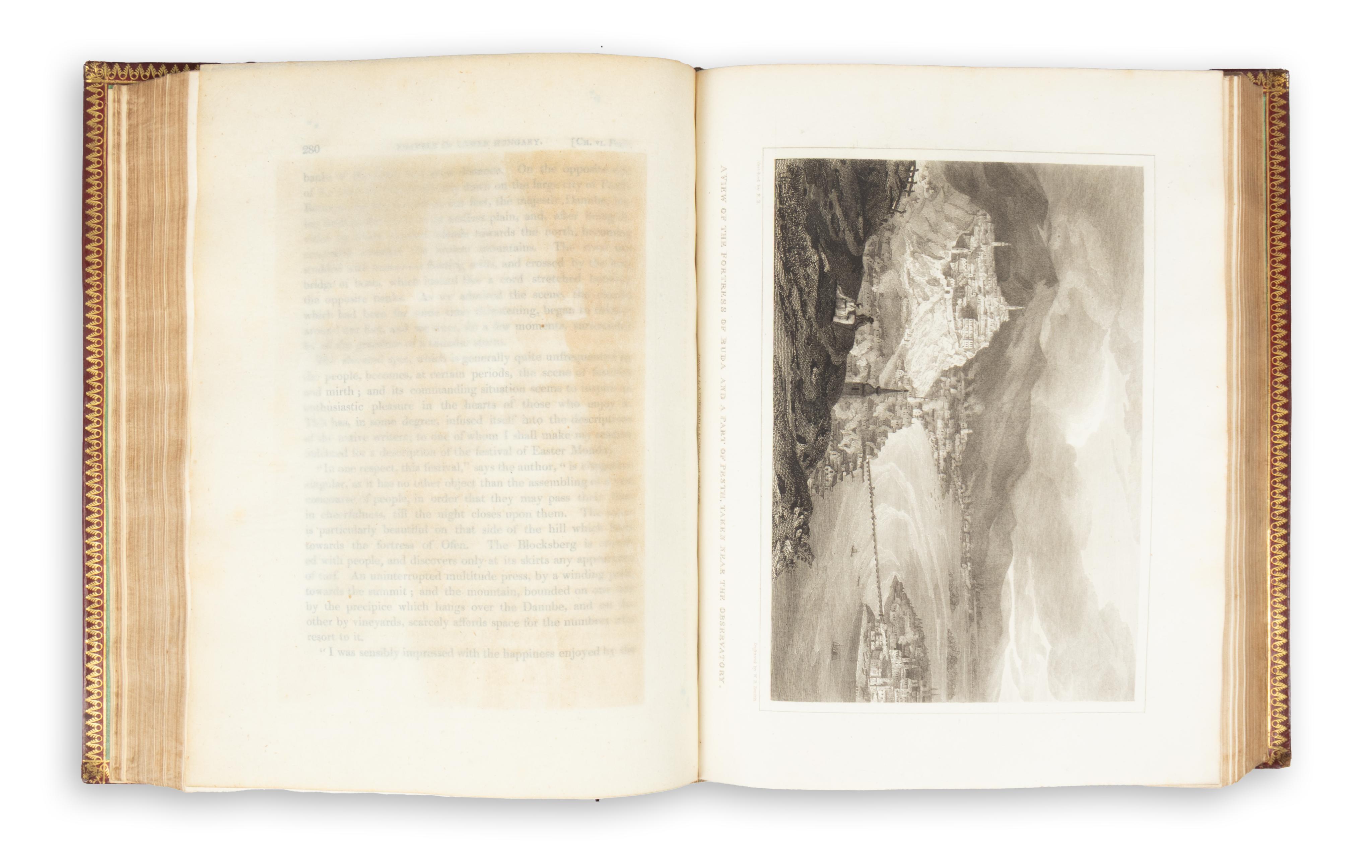 Bright’s thorough work contains 10 engraved plates executed after his own drawings. The illustrations include, among others, fine views of Pécs, Varaždin, Keszthely, Vác with the Danube, and Buda–Pest. The engravers were Pye, Milton, Byrne, Middiman, Smith, and Hobson. The two maps are reduced versions of János Lipszky’s earlier map of Hungary. Size: 41 × 27 cm. The author personally dedicated one copy of the work — now preserved in the Helikon Library in Keszthely — to Count György Festetics, one of his hosts.