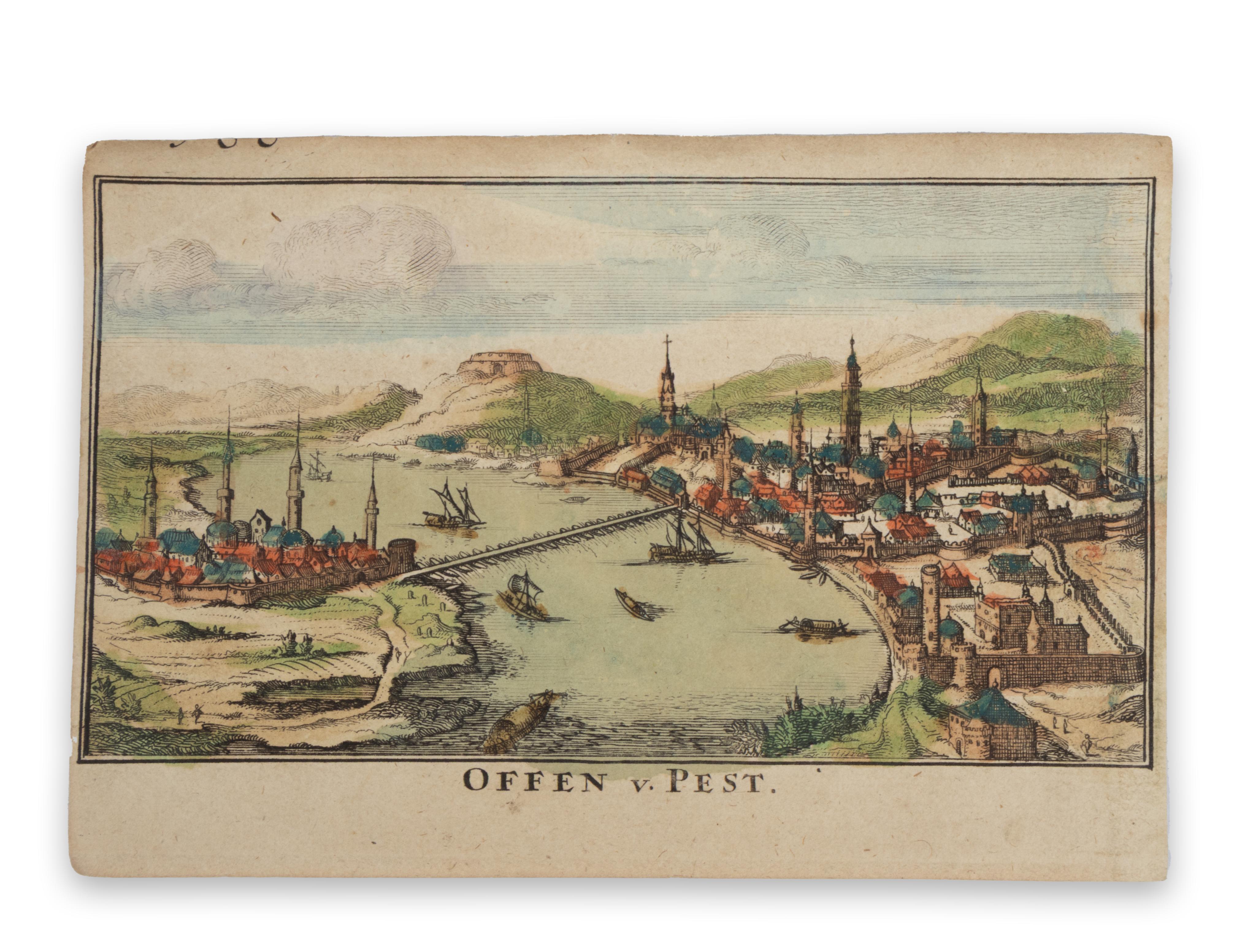 Amsterdam, [1692.]Pest - Buda színezett, részletgazdag, impozáns látképe Justus Danckerts D'Voornaamste Fortressen van Hungaria címmel kiadott rézmetszetű lapján jelent meg.