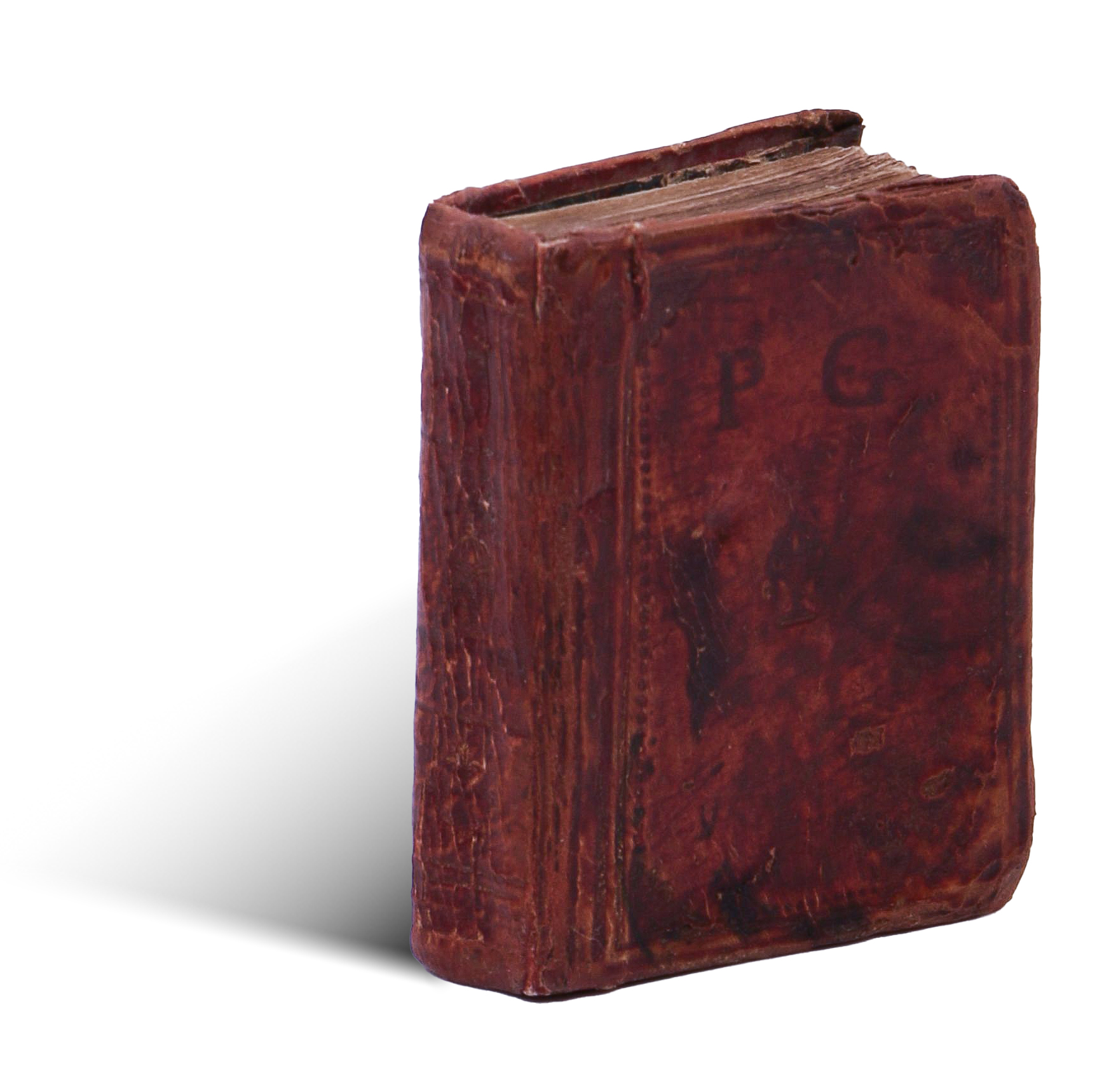 Contemporary, somewhat worn leather binding, with the monogram P. G. on the cover and blind-stamped frame decoration on the inside of the boards. The title page and the last leaf have been replaced with copies.