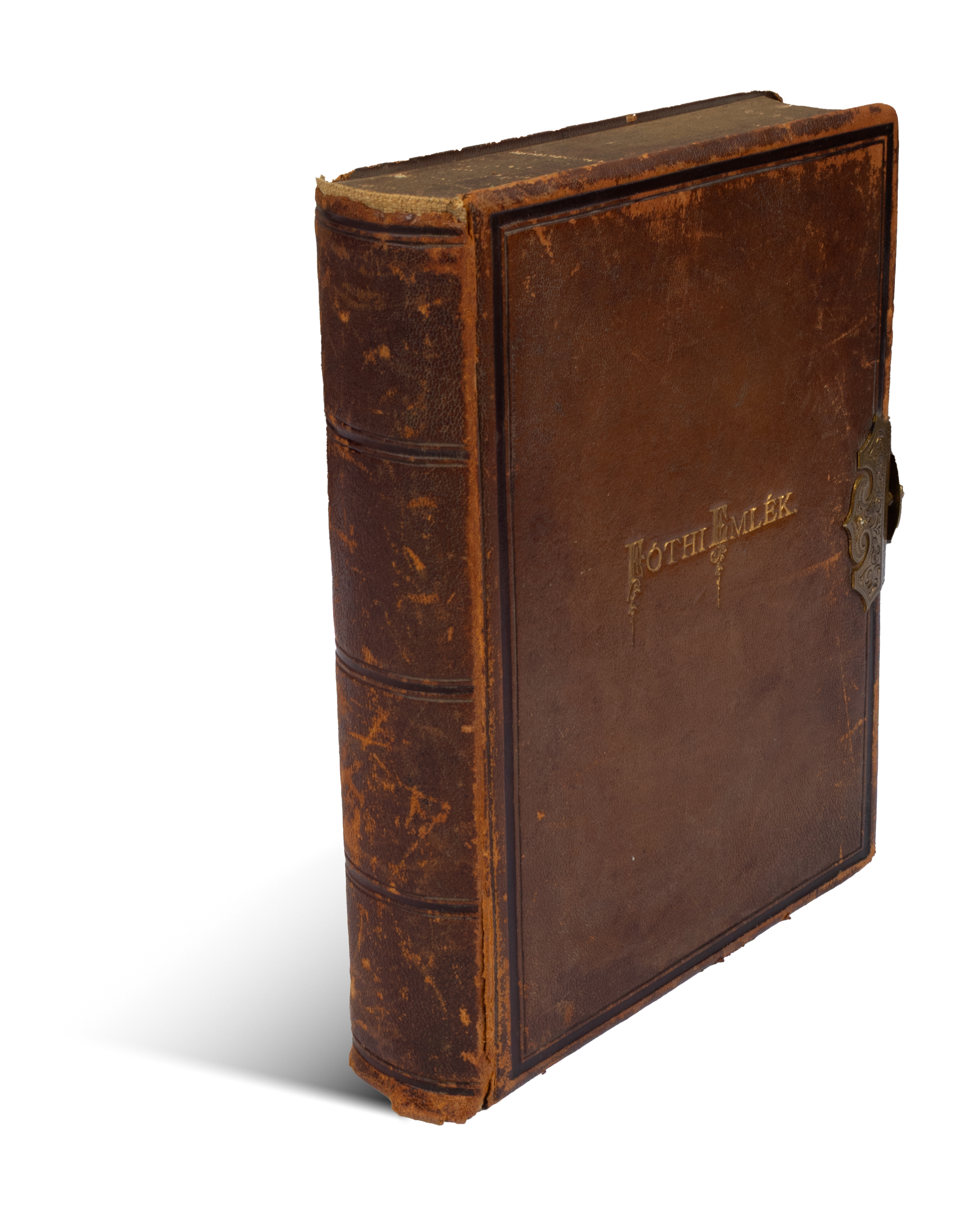 The excellent condition, but slightly concave recordings are in a unique wooden box made for them. The book-imitating form is covered in full leather, with a gilded title on the board, and closes with an ornate copper clasp. The imitated page edges are gilded around. Marked inside: Varsányi J. Koronaherczeg utcza. A little worn, but together with the exceptional recordings, it is a valuable collector's item.