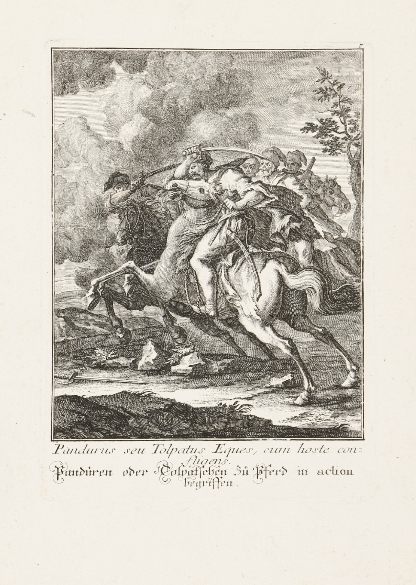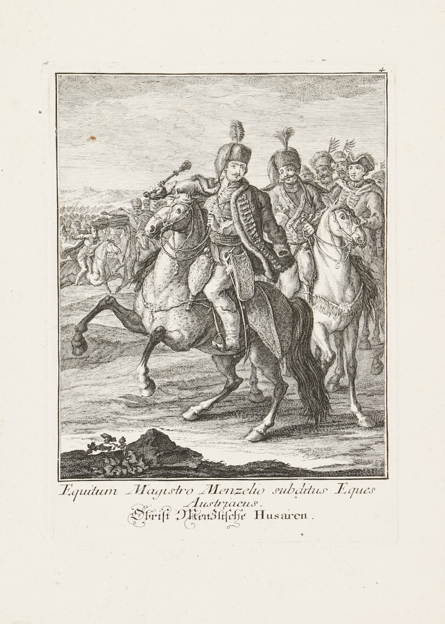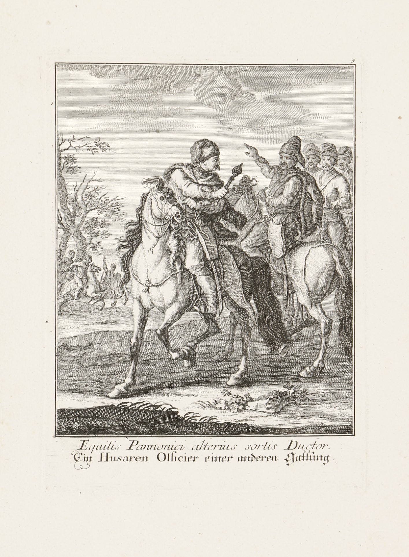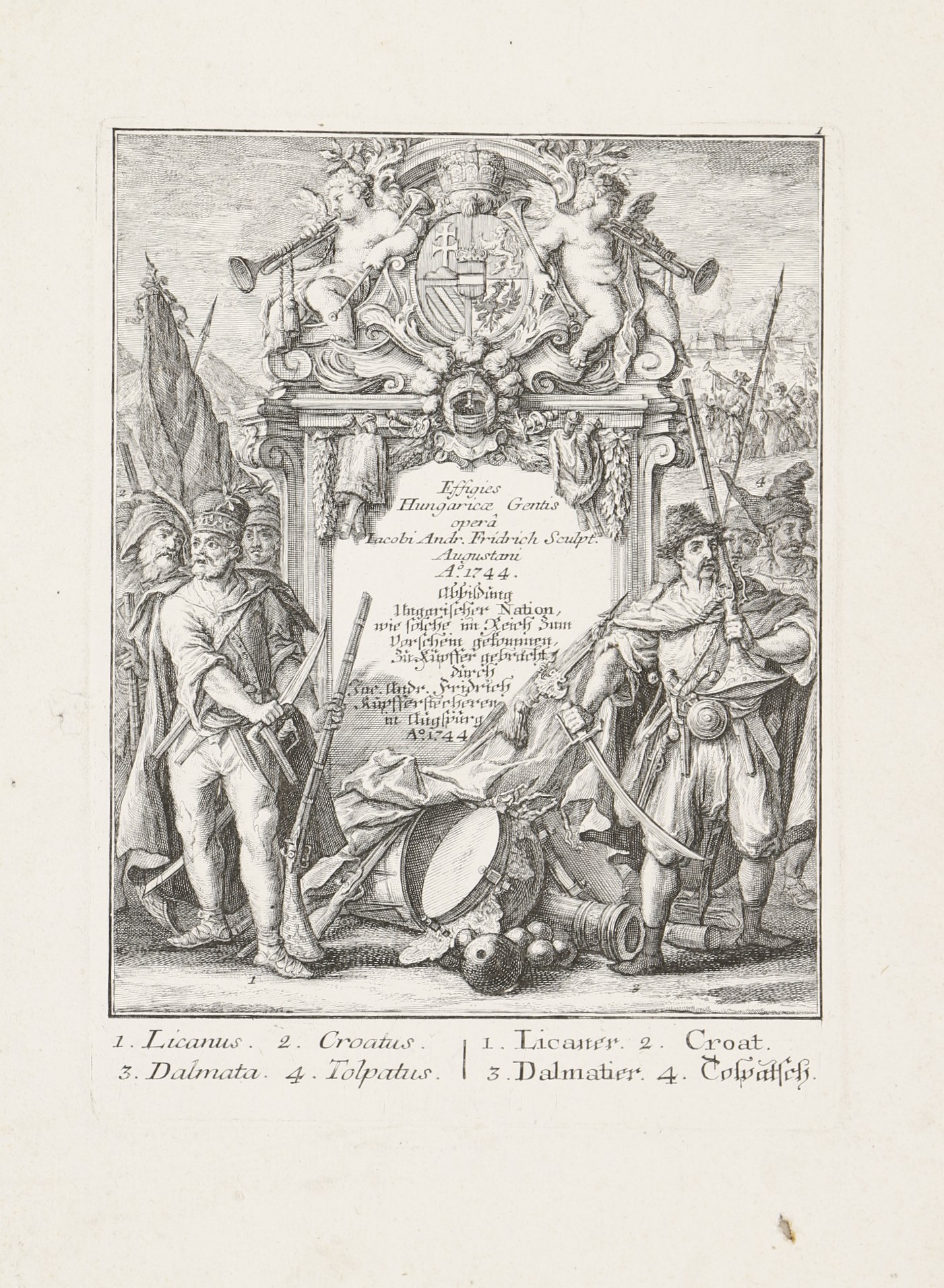 1744 AugsburgA 8 rézmetszetű lap Jakob Andreas Fridrich (1684-1751) Effigies Hungaricae Gentis opera, (Abbildung Ungarischer Nation. . .) című munkája. A címlap és a 7 metszetes lap latin és német nyelvű felirattal. A Martin Engelbrecht-féle, két évvel korábban megjelent sorozat figuráiból szabadon komponált többalakos ábrázolások a katonaéletről: a Habsburg Monarchia határvidékéről származó katonák, mindenekelőtt a kegyetlenségükről hírhedt szláv pandúrok, magyar huszárok és talpasok, gyalogos katonák (tolpácsok), valamint horvát és dalmát "gerilla stílusú" zsoldosok. Némelyikük néven nevezve, mint Menzel Dániel huszárezredes, Harum Baschsa (János) vagy jó nemes származású huszártiszt a XVIII. század első feléből.