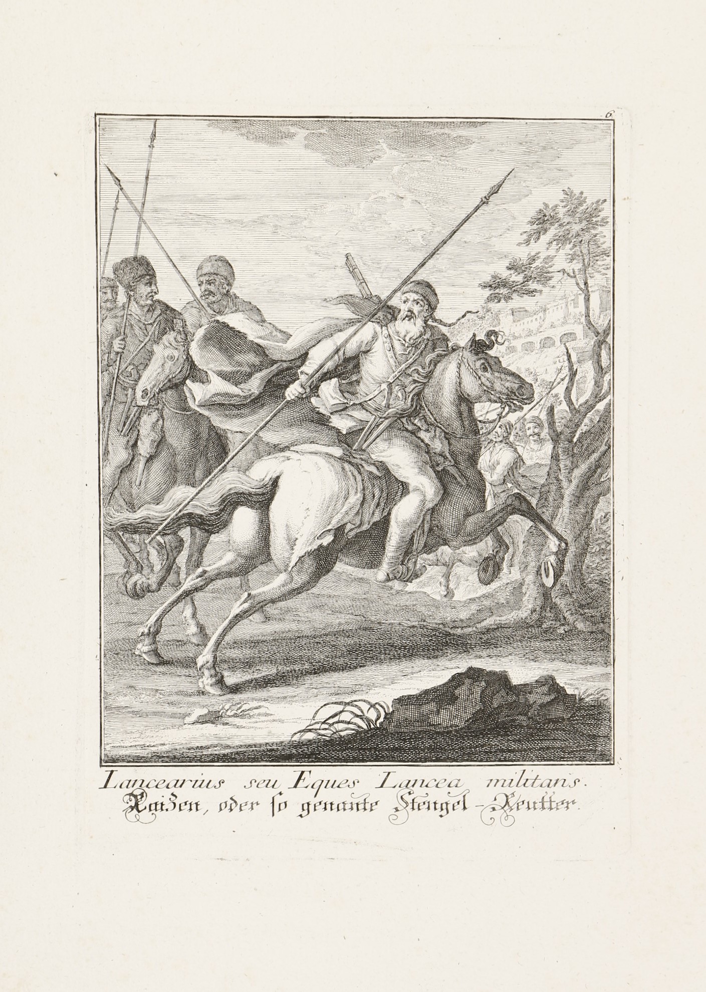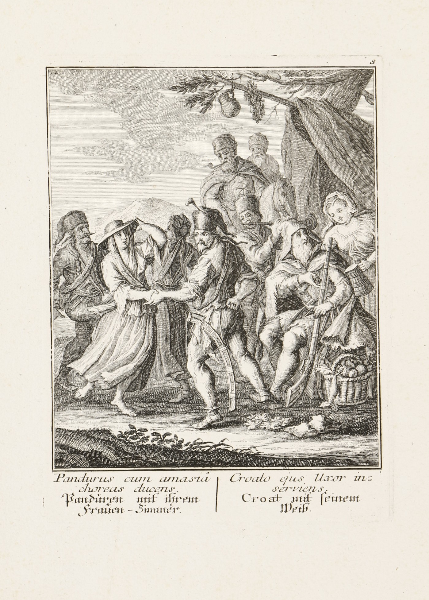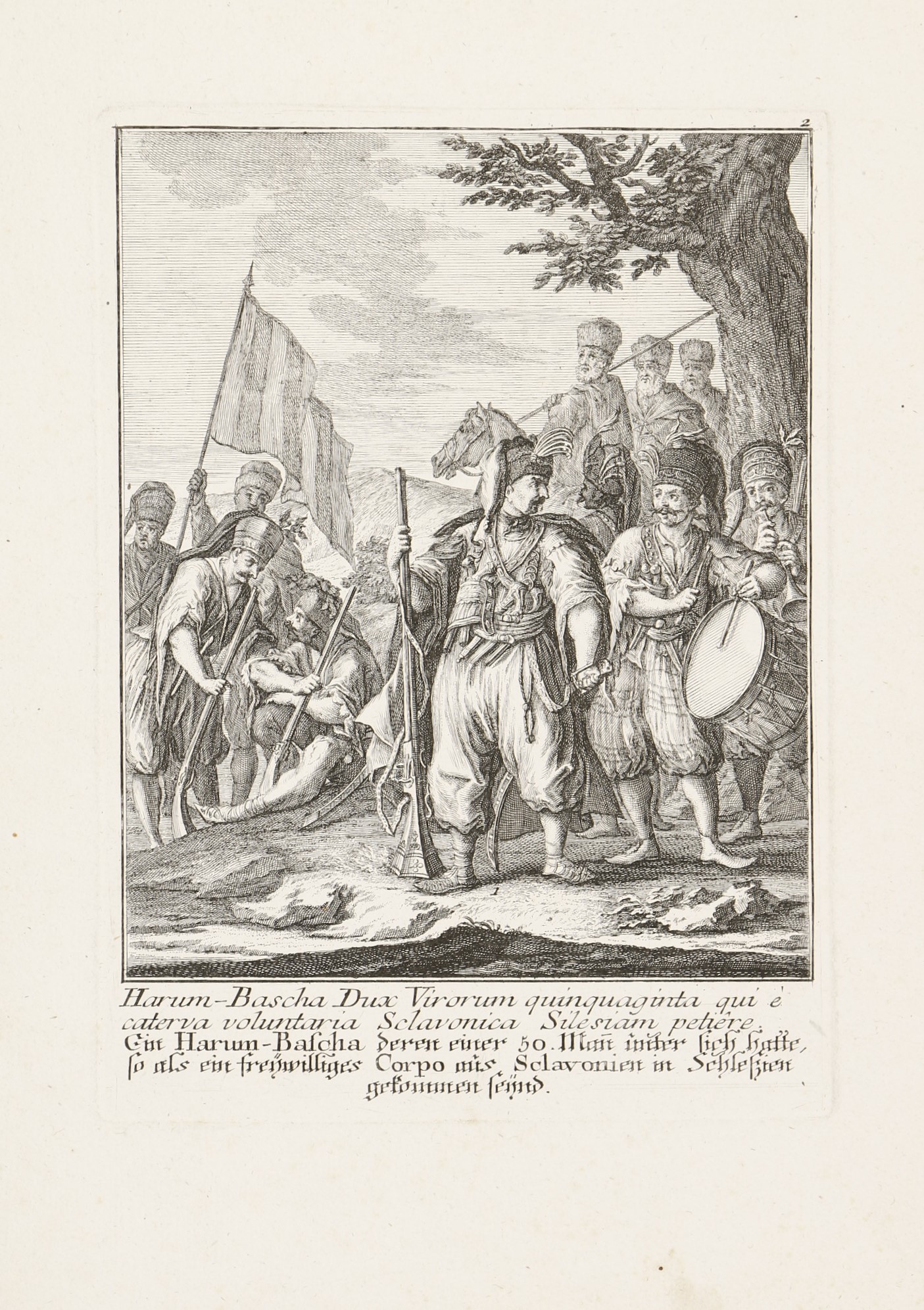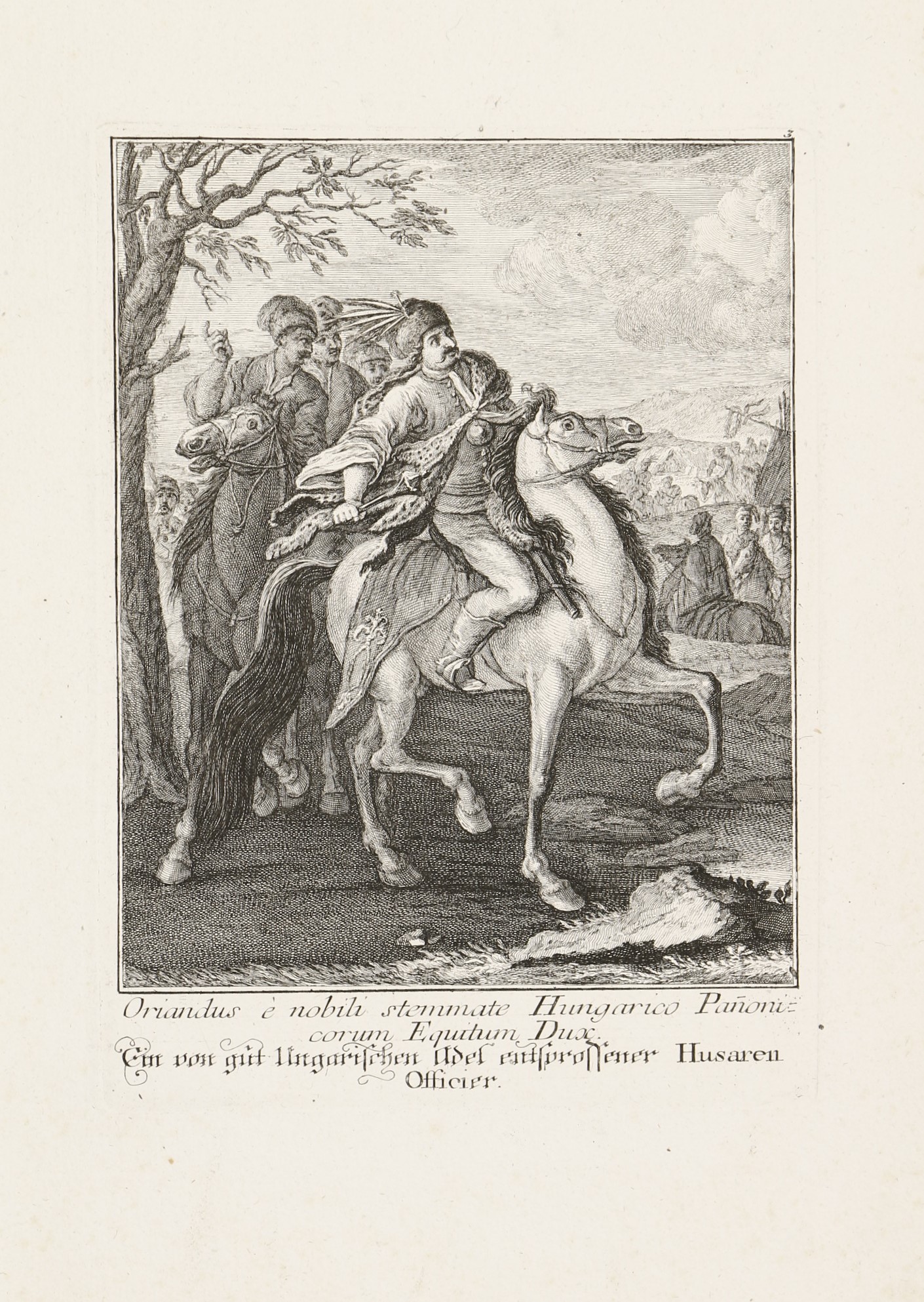 1744 AugsburgA 8 rézmetszetű lap Jakob Andreas Fridrich (1684-1751) Effigies Hungaricae Gentis opera, (Abbildung Ungarischer Nation. . .) című munkája. A címlap és a 7 metszetes lap latin és német nyelvű felirattal. A Martin Engelbrecht-féle, két évvel korábban megjelent sorozat figuráiból szabadon komponált többalakos ábrázolások a katonaéletről: a Habsburg Monarchia határvidékéről származó katonák, mindenekelőtt a kegyetlenségükről hírhedt szláv pandúrok, magyar huszárok és talpasok, gyalogos katonák (tolpácsok), valamint horvát és dalmát "gerilla stílusú" zsoldosok. Némelyikük néven nevezve, mint Menzel Dániel huszárezredes, Harum Baschsa (János) vagy jó nemes származású huszártiszt a XVIII. század első feléből.