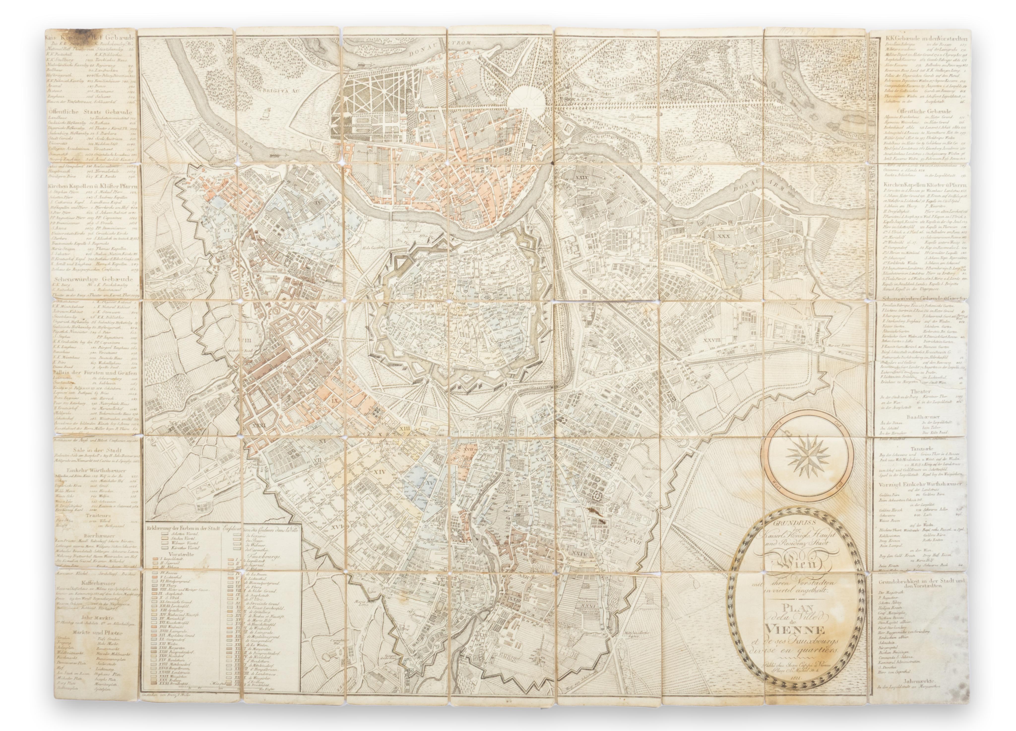 Copper-engraved map, partly colored with watercolors. Plan of the imperial and royal capital of Vienna according to the land registry division. On both sides, a list of notable places in the city, churches, institutions, markets, theater, baths, etc. M: 82×61 cm.