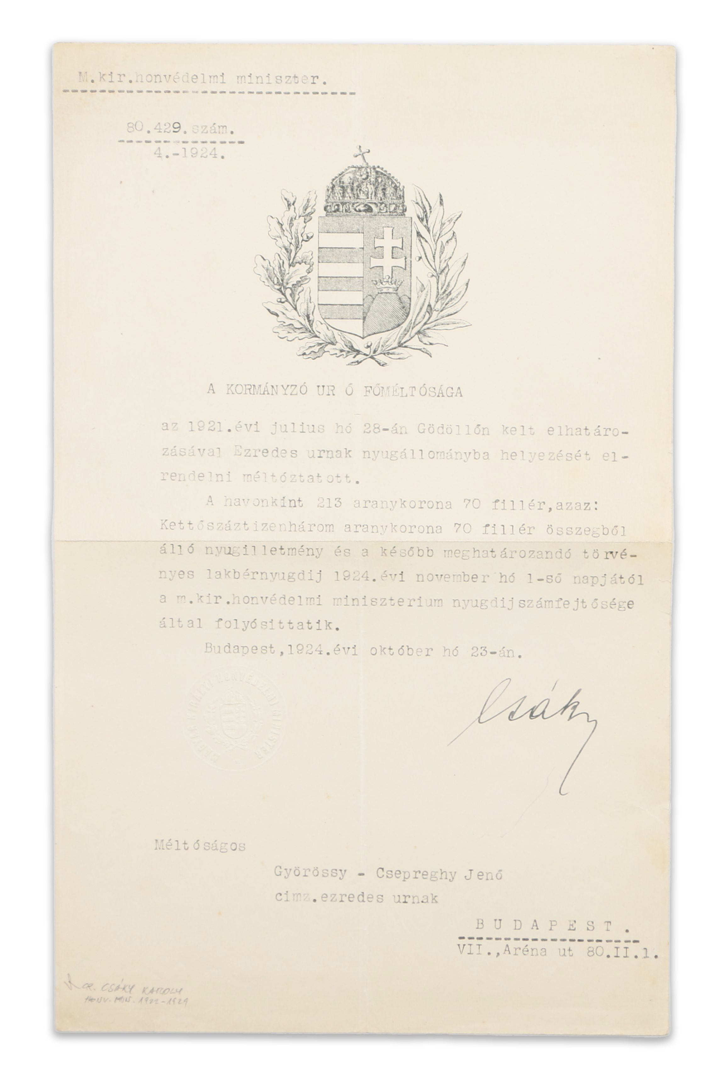 Gróf körösszegi és adorjáni Csáky Károly (1873-1945) tábornok, honvédelmi miniszter beszámolója Vitéz nagybányai Horthy Miklósnak (1868-1957), miszerint megkezdődött a nyugdíjilletmény és a lakbérnyugdíj folyósítása az I. világháborúban tanúsított bátorságáért Ezüst Katonai Érdeméremben részesült Győrössy-Csepreghy Jenő (1879-?) ezredes, a hajdani 4. cs. és kir. huszárezred századosa számára. Az ezredes nyugállományba helyezését Horthy rendelte el 1921. július 28-án.