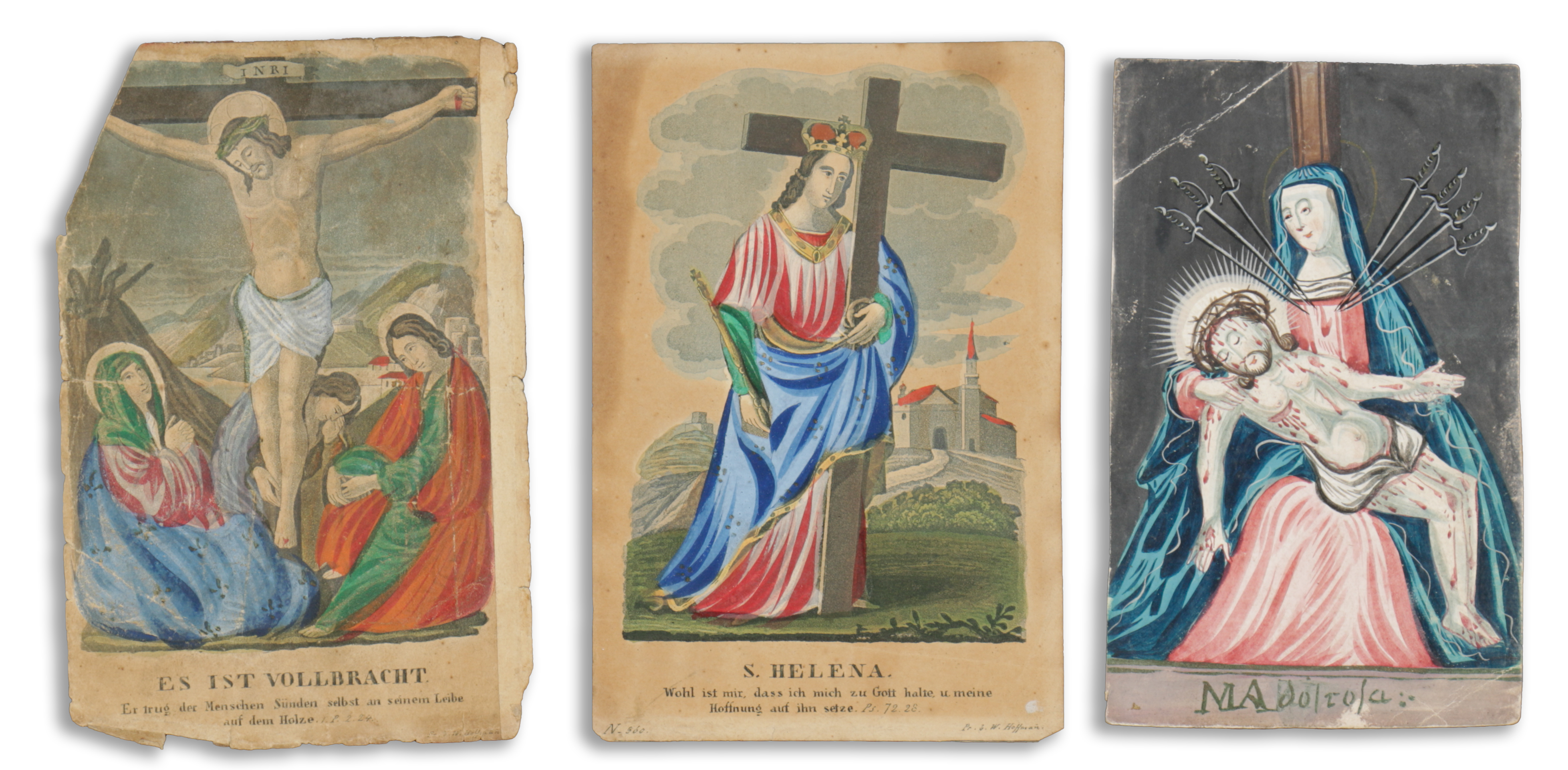 - Es ist vollbracht…Barokk szentkép. Nyomtatott, korabeli színezéssel, jelezve jobbra lent. W. Hoffman. Alul bibliai idézet, Péter 2.24. A jelenet Krisztus siratása a keresztlevétel előtt. Mária, Mária Magdaléna és János tanítvány. Sérült, hiányos. Egy könyv illusztrációja volt, mint a fenti példány. M:8×12 cm.
