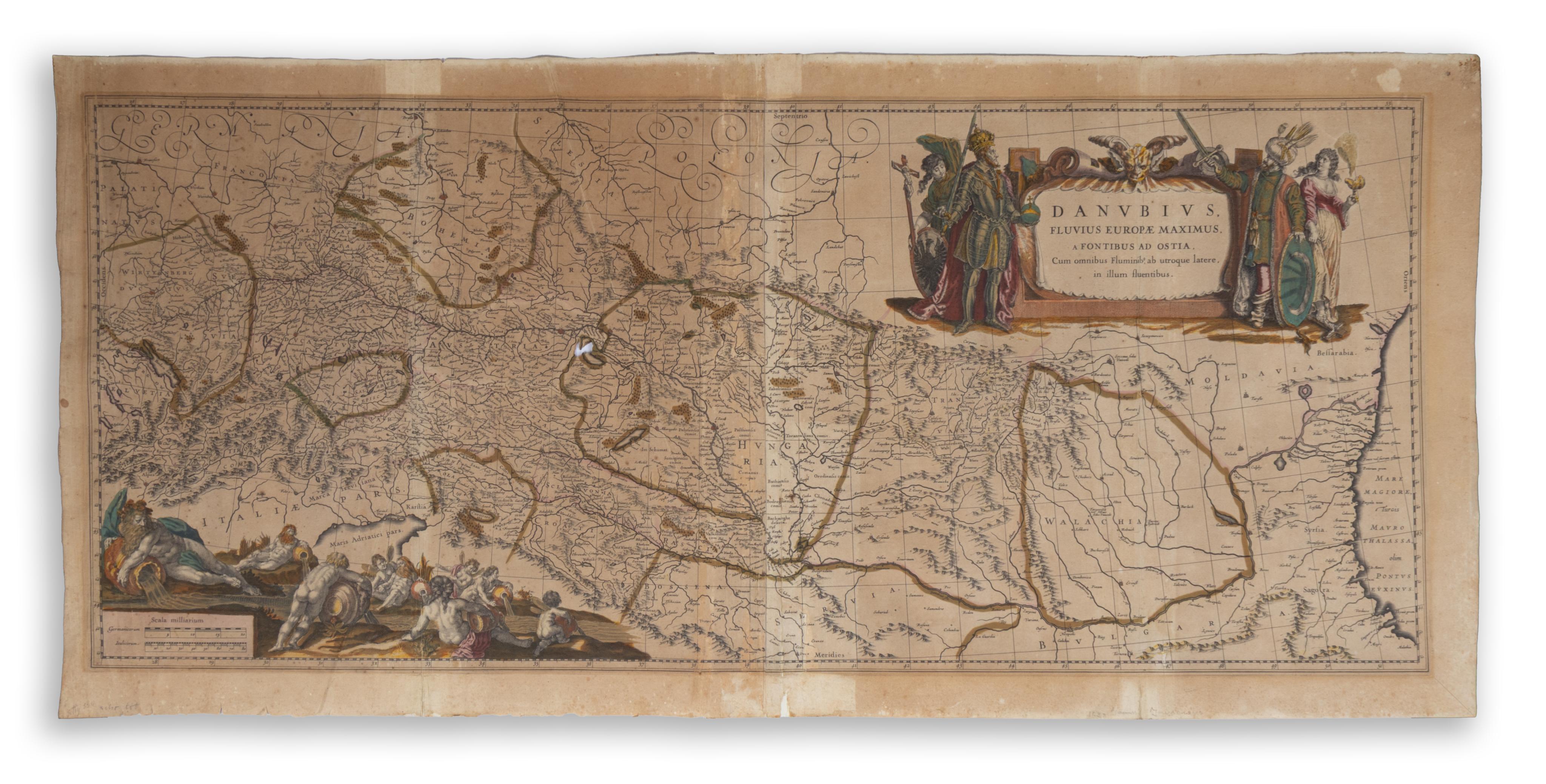 The map, assembled from two sheets, was made by the Dutch Jan Jansson around 1638 and published in Amsterdam around 1688. A beautifully colored, copper-engraved map of the Danube Valley. The ornate cartouche and the scale in the lower left corner are also adorned with a decorative frame enriched with allegorical figures and landscapes.