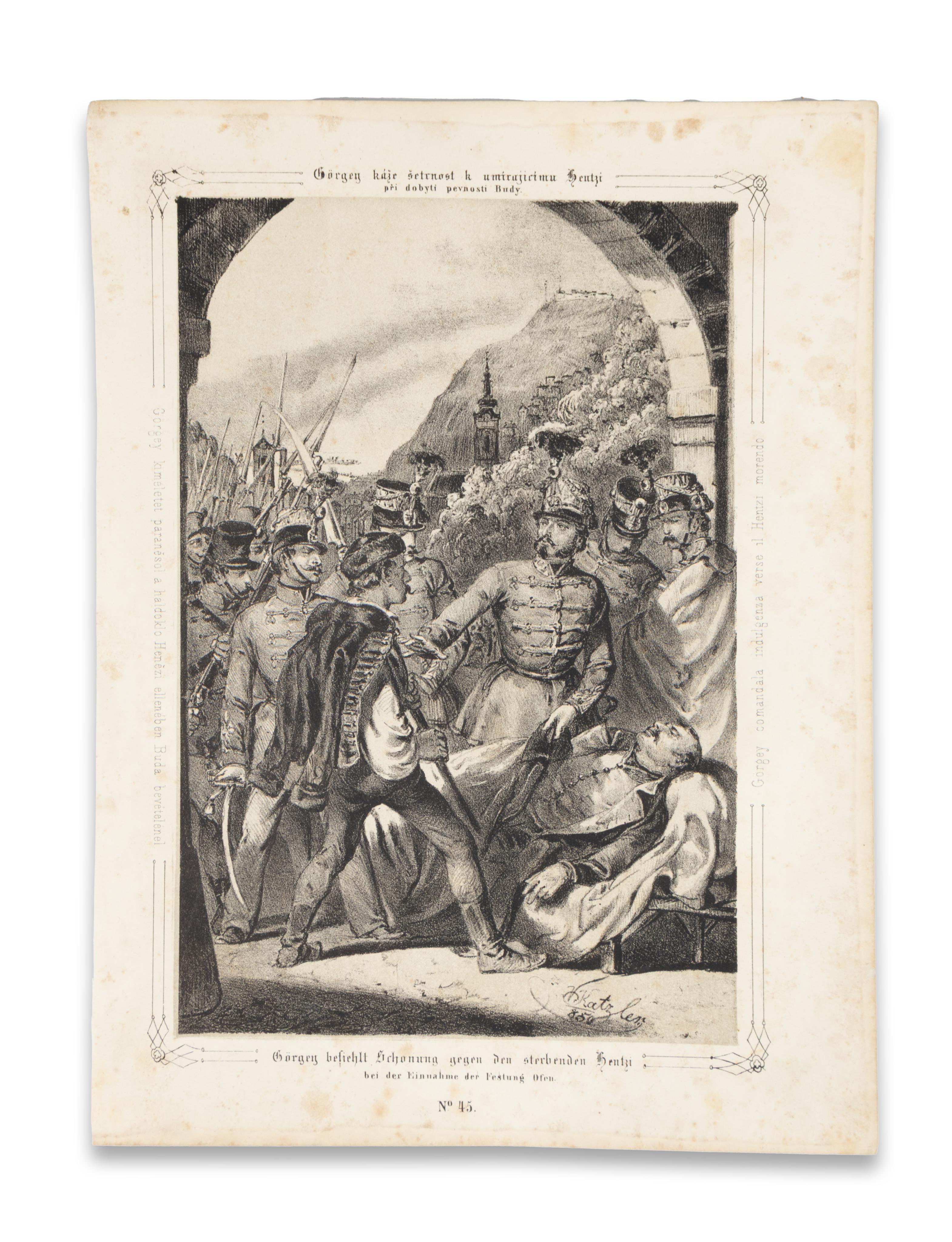 The title is provided in four languages (German, Hungarian, Italian, and Czech) along the four sides of the image. The print is plate number 45 from the second part of Anton Ziegler’s Vaterländische Bilder-Chronik aus der Geschichte des österreichischen Kaiserstaates (Patriotic Pictorial Chronicle from the History of the Austrian Imperial State), published by Benko in Vienna, 1850. This second part contains a description of the 1848–1849 events in Hungary, illustrated with 28 cityscapes (including Buda, Buda and Pest, Bratislava, Prague, Vienna, Belgrade, Trieste, Graz, Innsbruck, etc.), as well as 56 historical genre scenes and battle paintings.