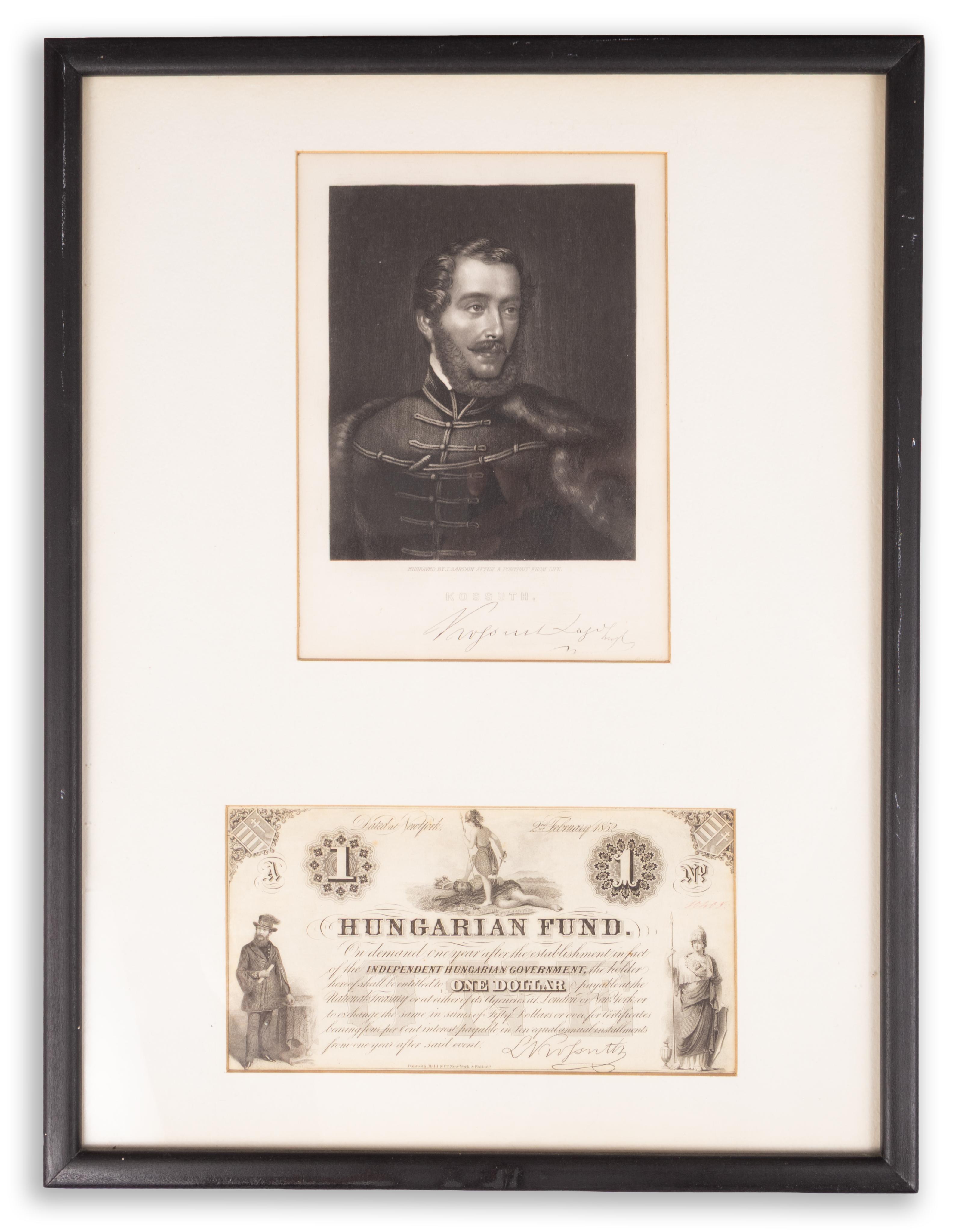 Egy közös, modern, üvegezett fakeretben, paszpartuval. Verzójára 176. sorszámmal aukciós cédula angol nyelvű kézírással a fenti két tételről: Kossuth-portrait gift of Trudi 1981, dollar note Purchased Fr. Mihályi 1967.