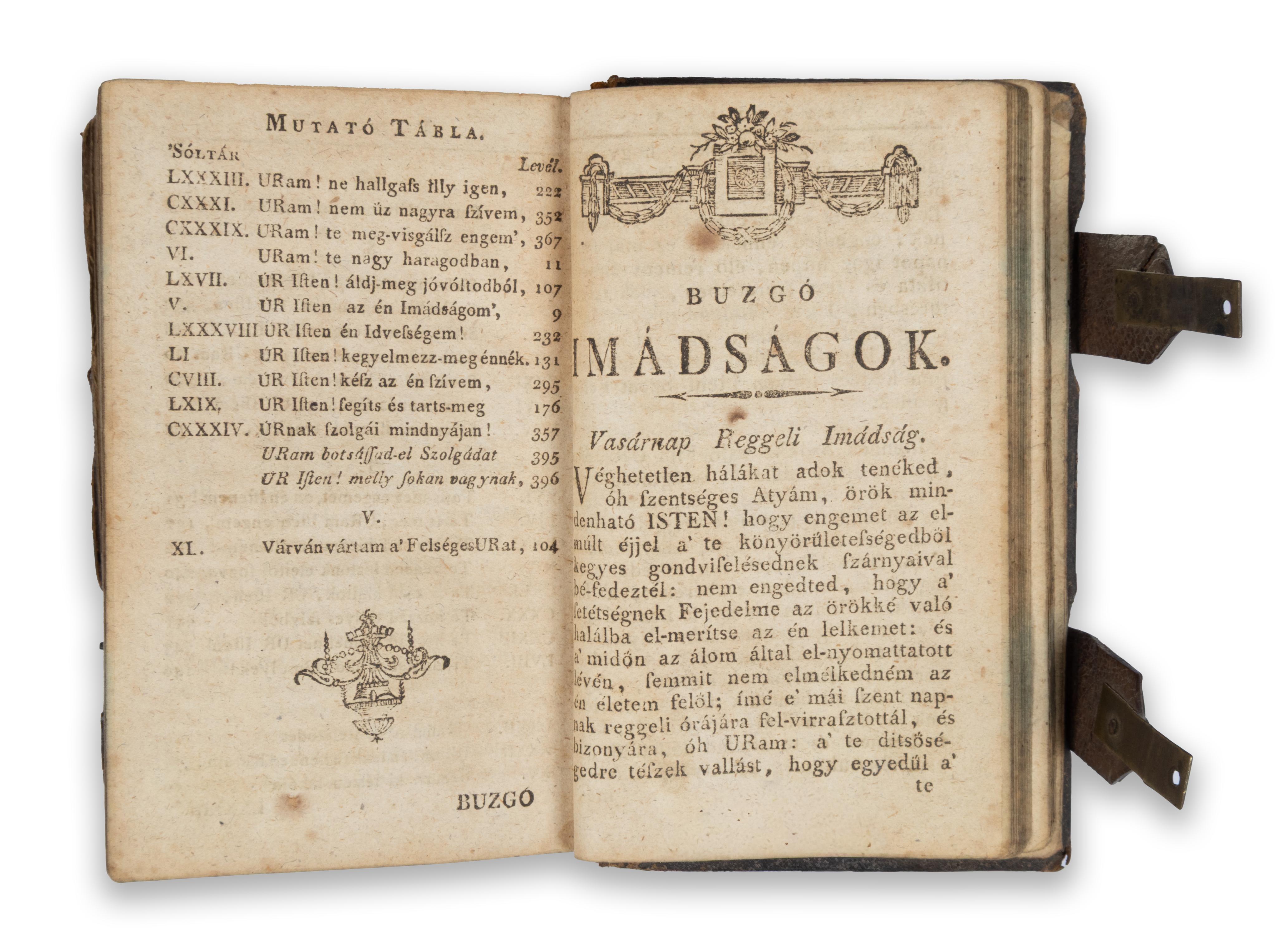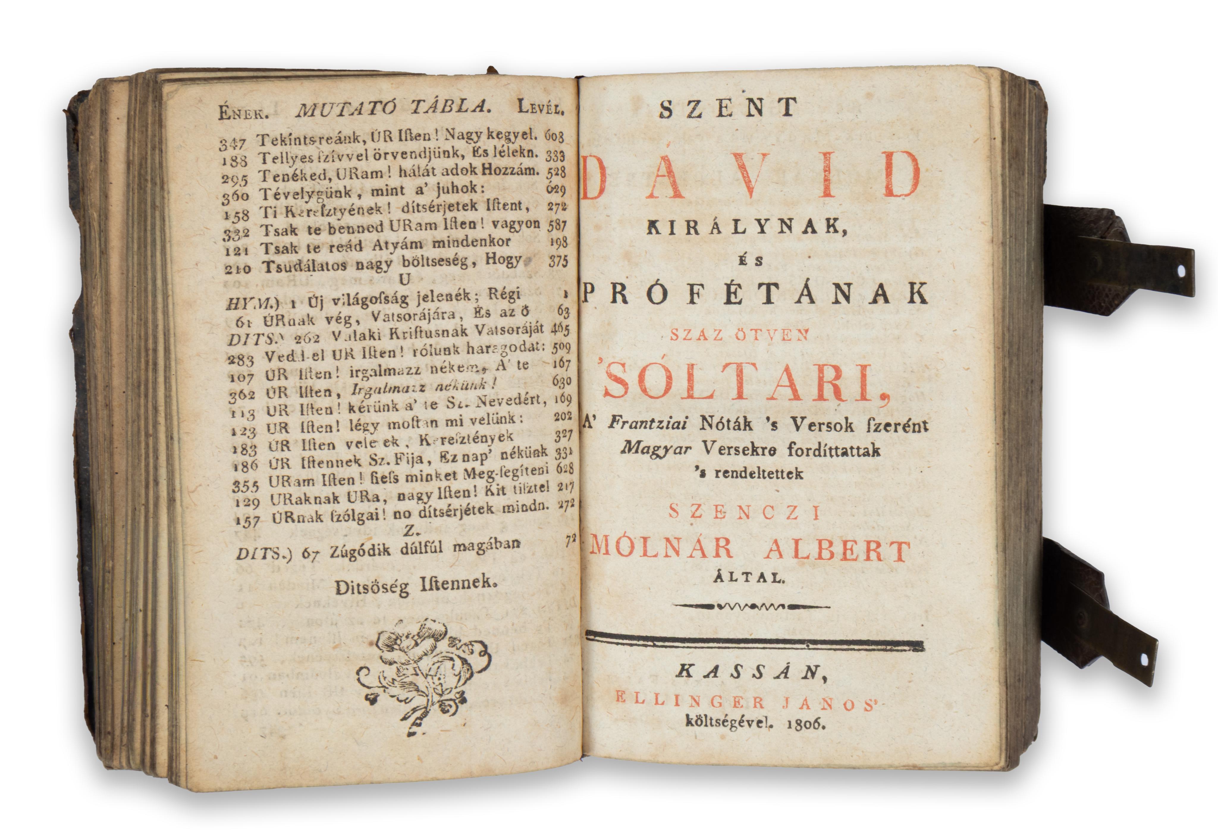 Mögékötve: Szent Dávid királynak, és prófétának száz ötven Sóltári, A’ Francziai Nóták ’s Versok szerént Magyar Versekre fordíttattak ’s rendeltettek Szenczi Mólnár Albert által. Kassán, 1806, Ellinger János. [4] + 412 + [8] p. Végére kötve: Buzgó imádságok. 55 p.