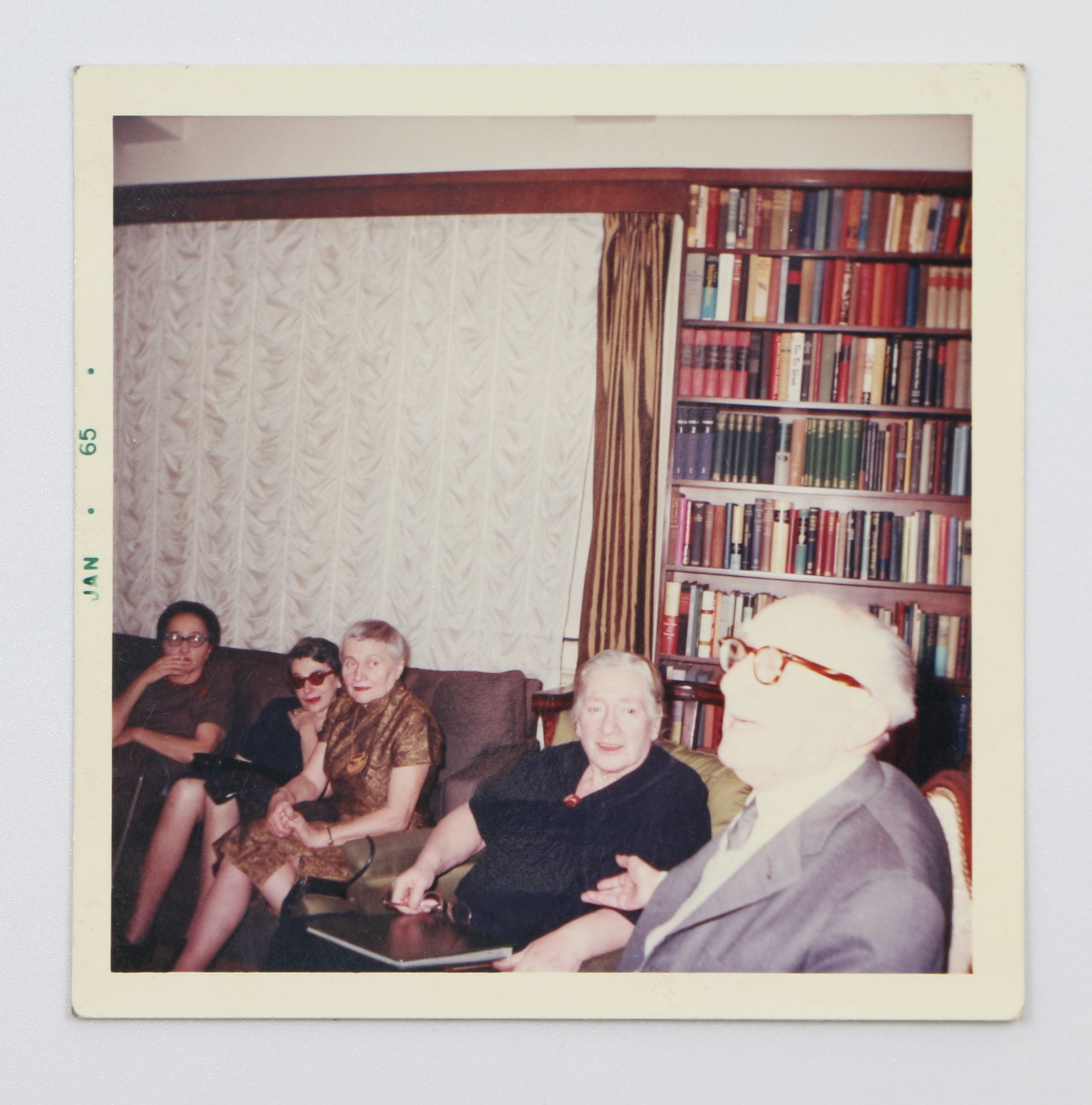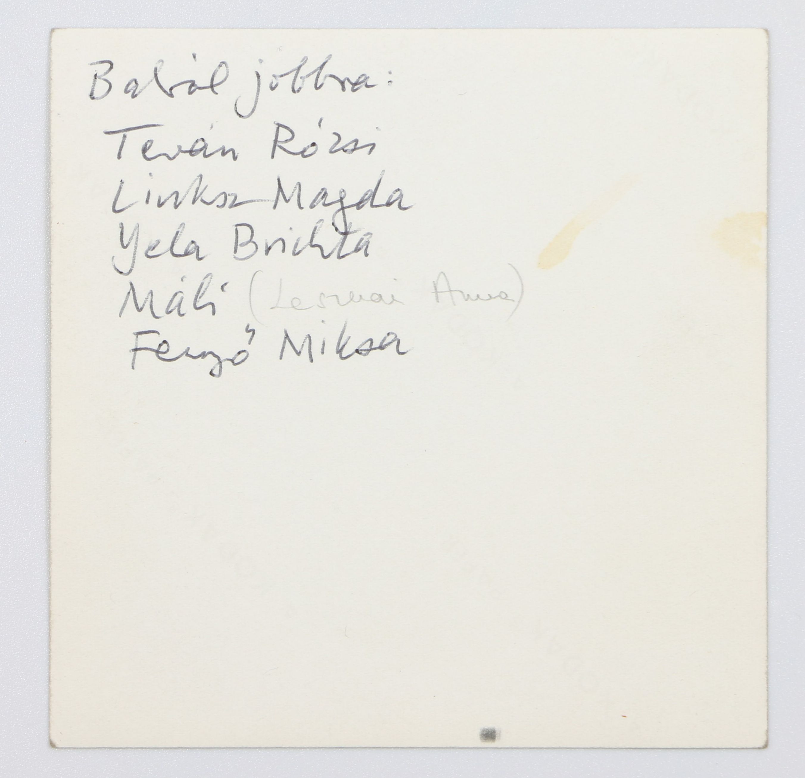 Hozzá: egy színes fénykép 1965 januárjából, amelyen Teván Rózsa, Linksz Magda, Yela Brichta, Lesznai Anna (Máli) és Fenyő Miksa látható.