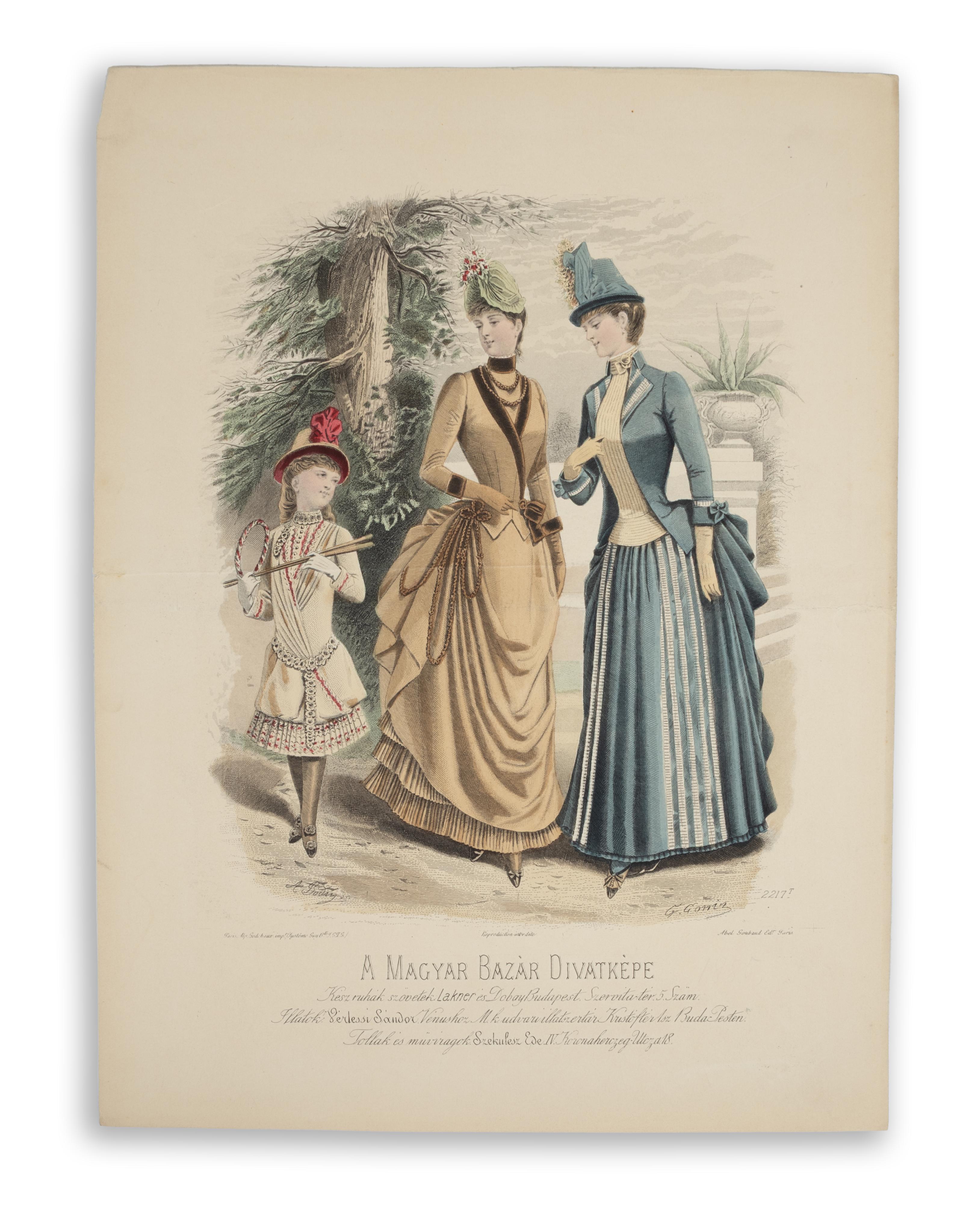 Reproduction interdite. A francia La mode illustrée bureaux du journal magyar feliratos reprodukciója. 1885. Kétoldalt a grafikusok - G. Gronin, A. Bodry - a kiadó és a nyomdász nevével. Jobbra a metszet száma. Alatta a korabeli magyar kereskedők reklámcélzatú megnevezéseivel.