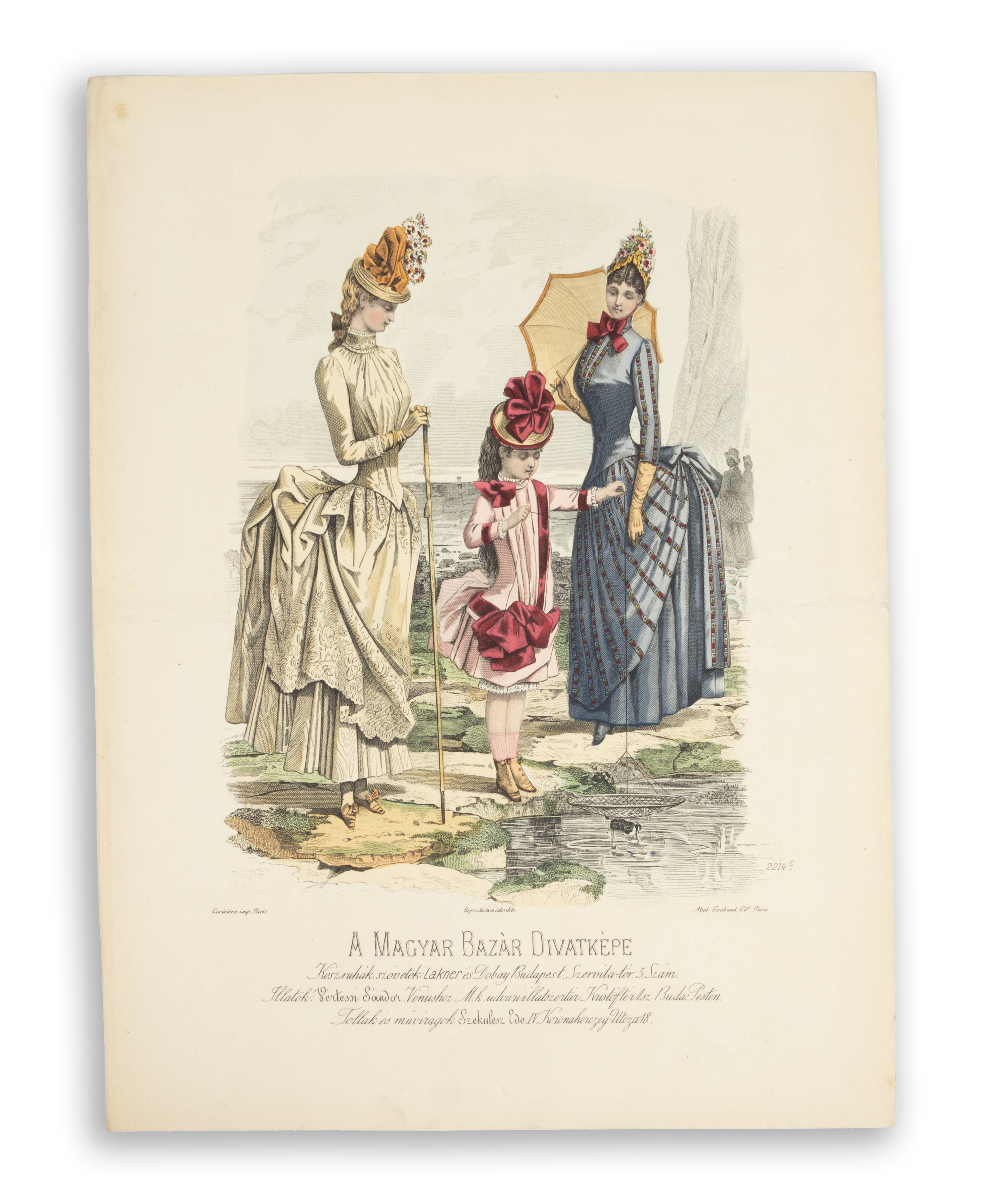 Reproduction interdite. A francia La mode illustrée bureaux du journal magyar feliratos reprodukciója. 1885. Kétoldalt a kiadó és a nyomdász nevével. Jobbra a metszet száma. Alatta a korabeli magyar kereskedők reklámcélzatú megnevezéseivel.