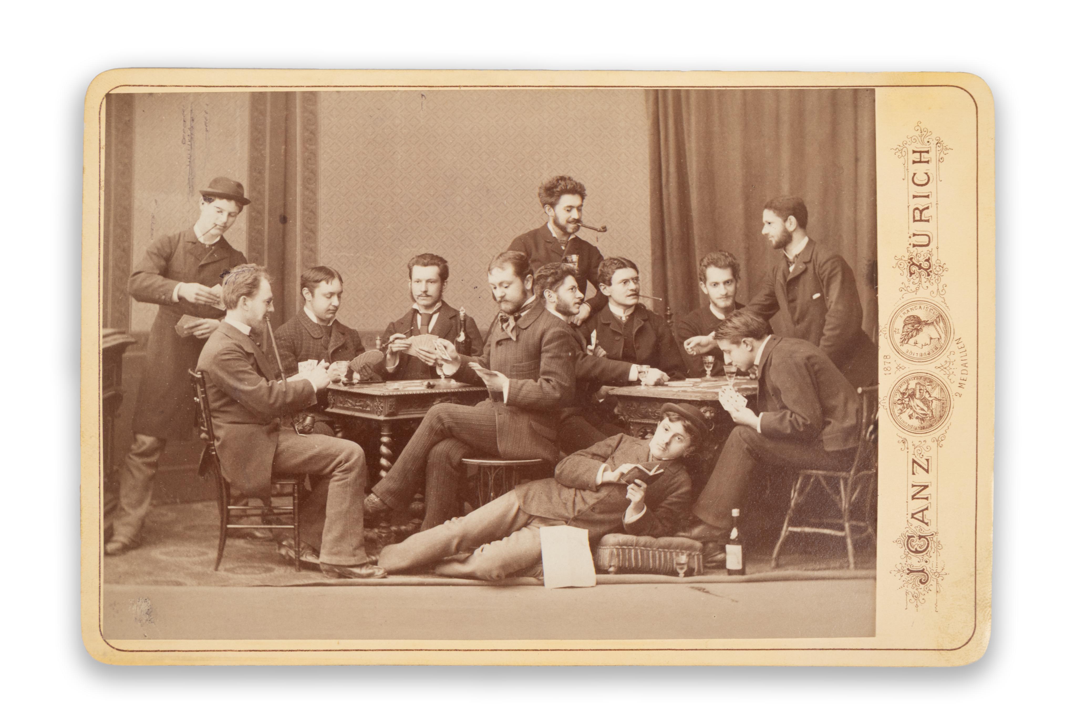 Monochrome studio shot laminated on cardboard. Made before 1890 in the Zurich studio of Johannes Ganz (1821-1886), a Swiss photographer, inventor, film pioneer and entrepreneur. On the back, with the autograph signatures of the 12 young - probably classmates - Hungarian engineers: Pulszky Garibaldi, Kornél Faur, Árpád Menczer, Zsigmond Salzberger, Adolf Zwick, jr. József Petrik?, Elek Dósa?, Asbóth?... A fierce card battle is taking place in the staged scene, while cigars and drinks are being smoked.