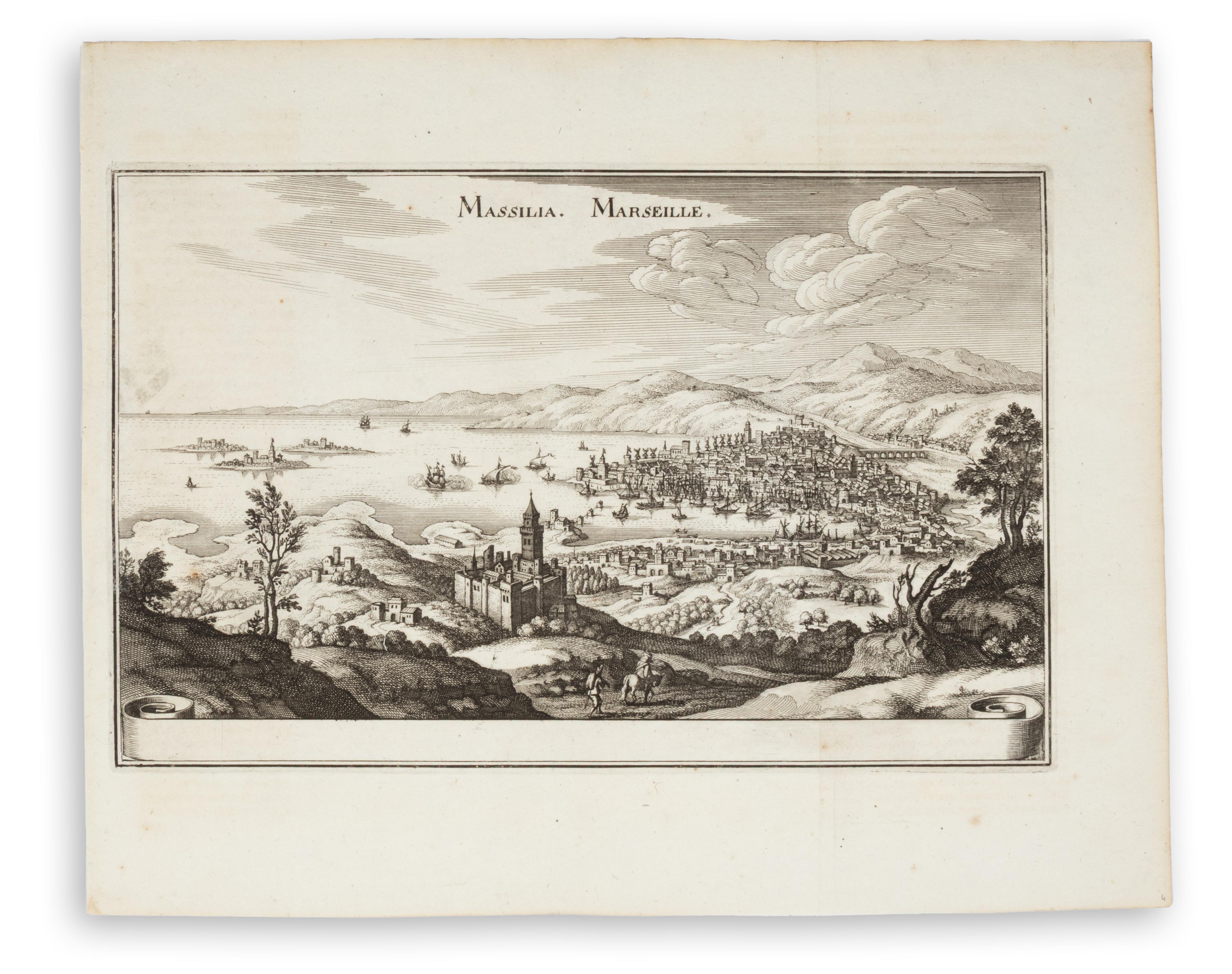 Részletgazdag látkép Marseille városáról és a Lioni-öbölről madártávlatból. Idősebb Matthäus Merian (1593–1650) Theatrum Europaeum című művéből, mely a német nyelvterület és egész Európa politikai és katonai eseményeit dokumentáló, Frankfurt am Mainban 1633 és 1738 között megjelent monumentális, huszonegy kötetes történeti krónika. A Theatrum több száz rézmetszetet tartalmaz Merian és műhelye munkáiból, köztük térképeket, csatatervrajzokat, városlátképeket és allegorikus címlapképeket, amelyek drámai erővel jelenítik meg a történelmi eseményeket.