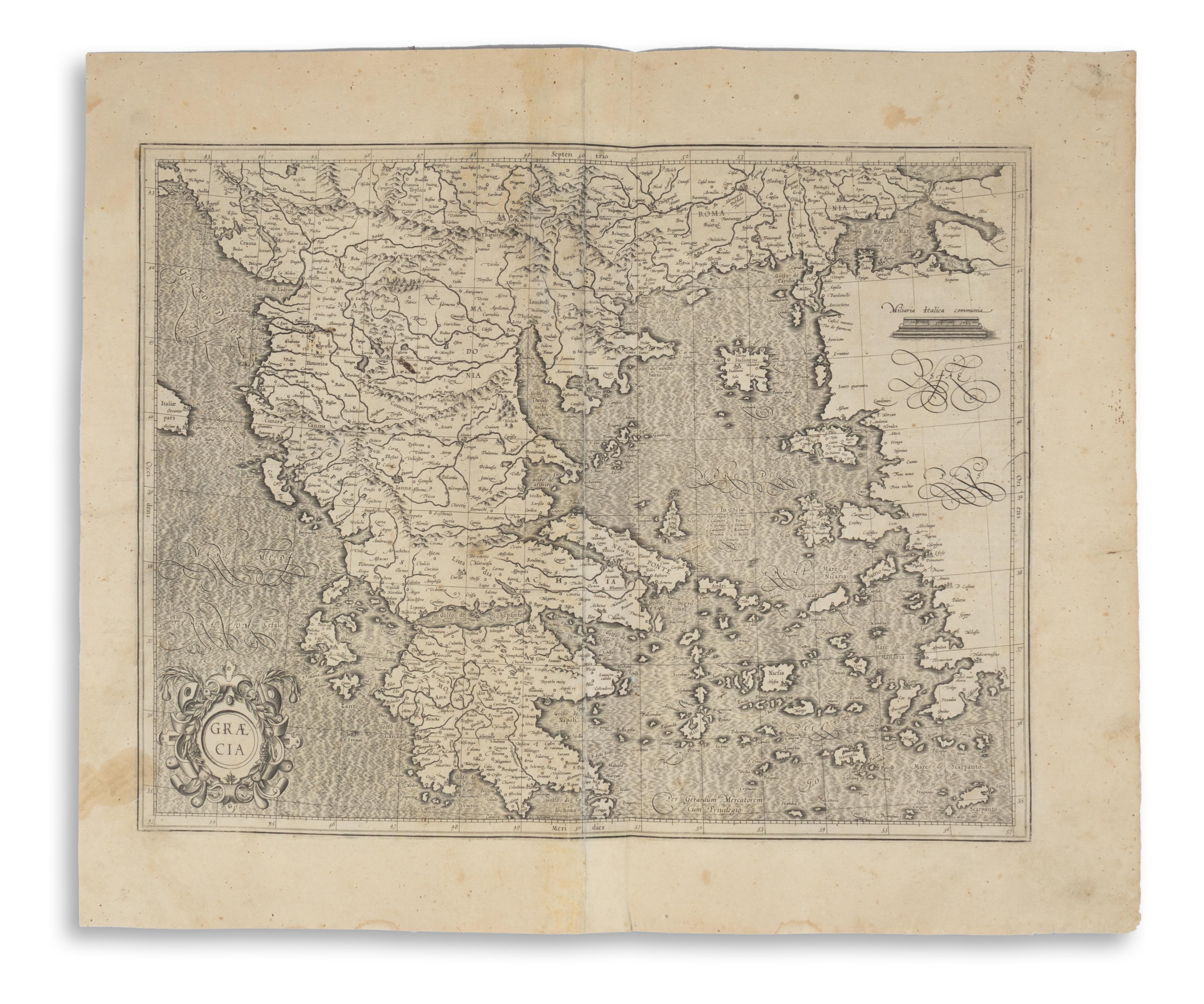 The map is one of the earliest modern maps of Greece to appear in a commercial atlas. From an early French edition of Mercator-Hondius Atlas. Orig. copper-engraving with ornamental title-cartouche.