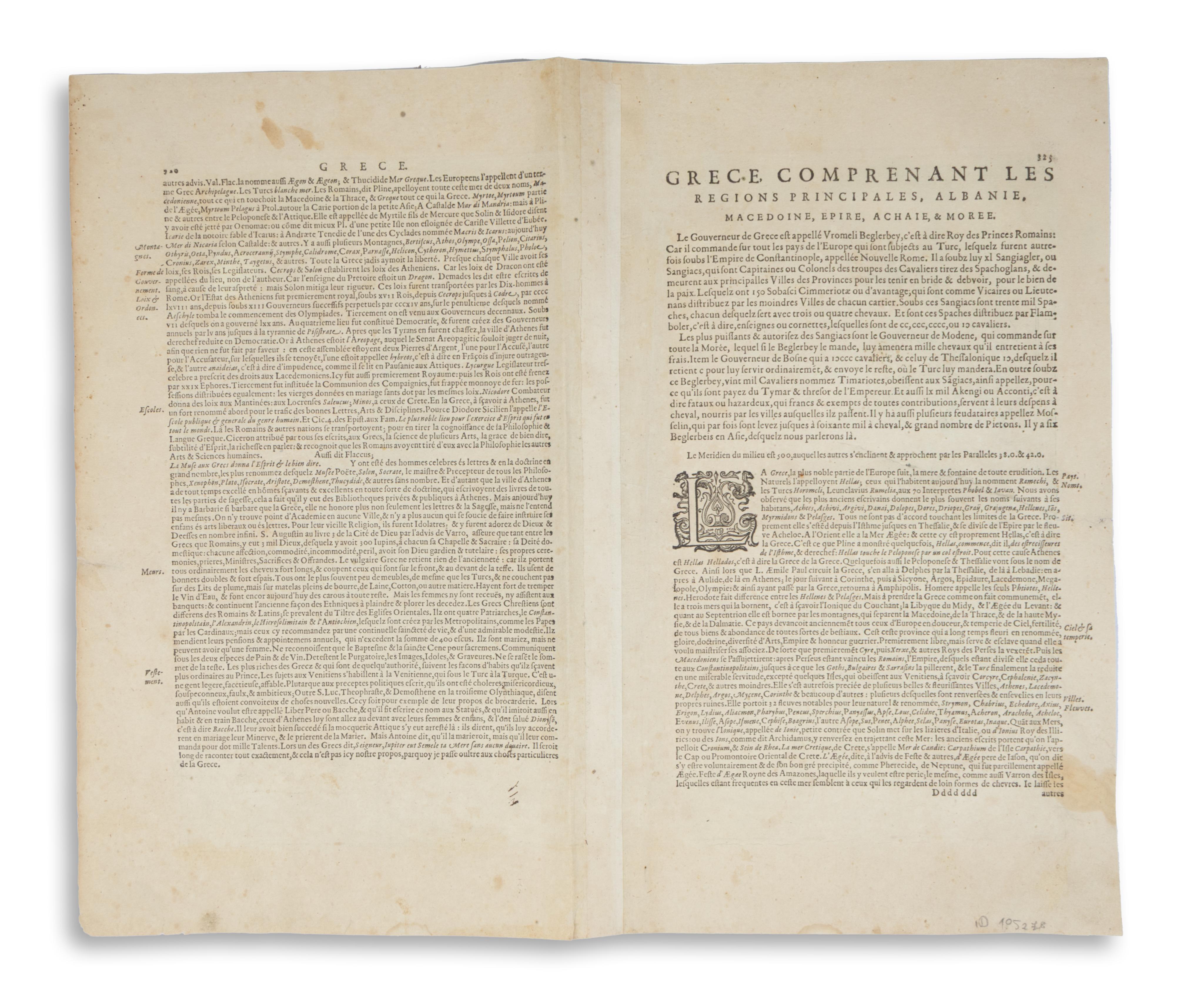 In good condition, with occasional waterstains. French text on the verso, page numbers 325-326, "Dddddddd", reinforced along the fold.