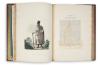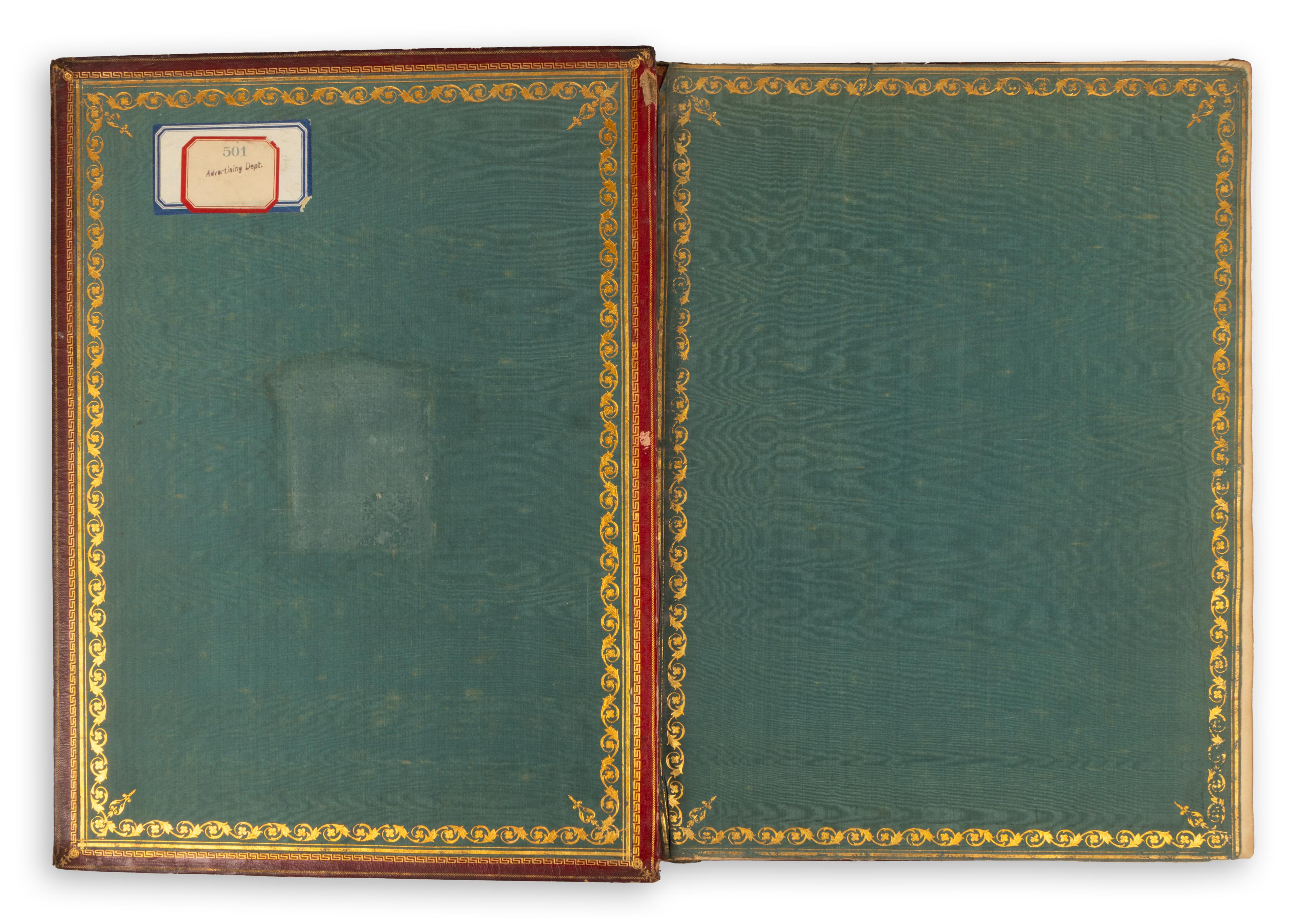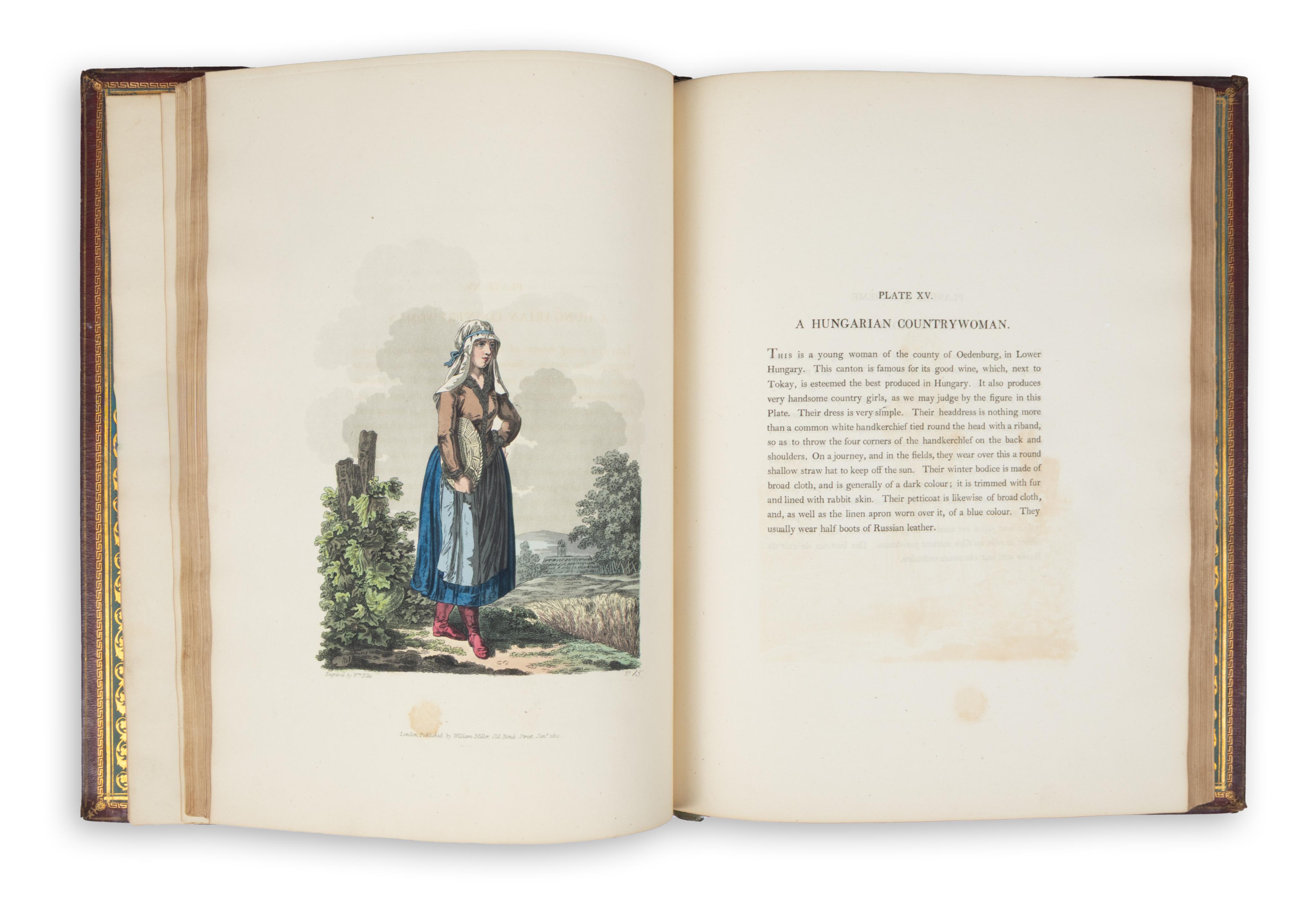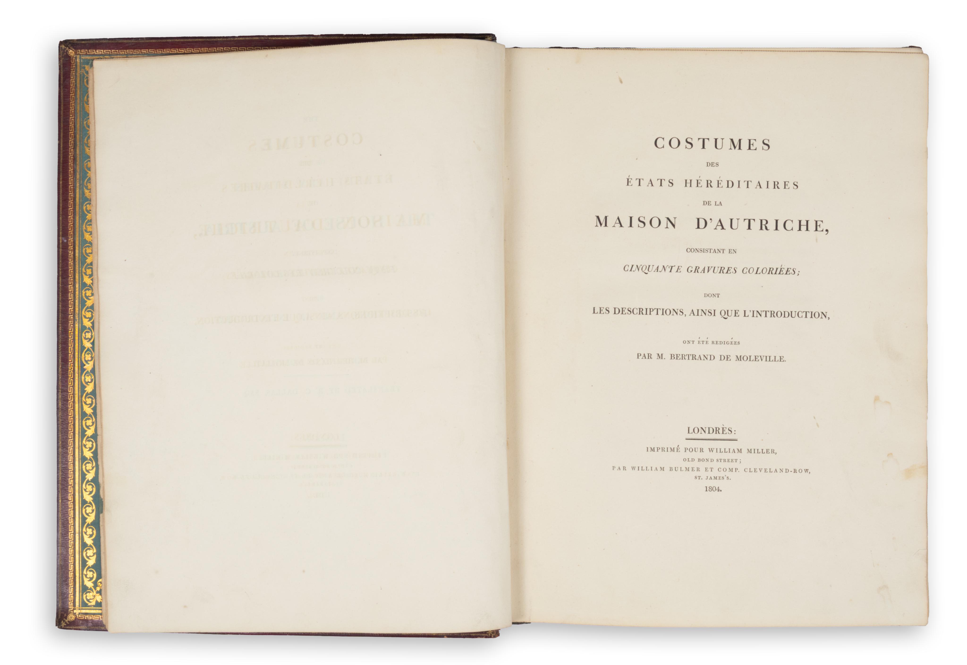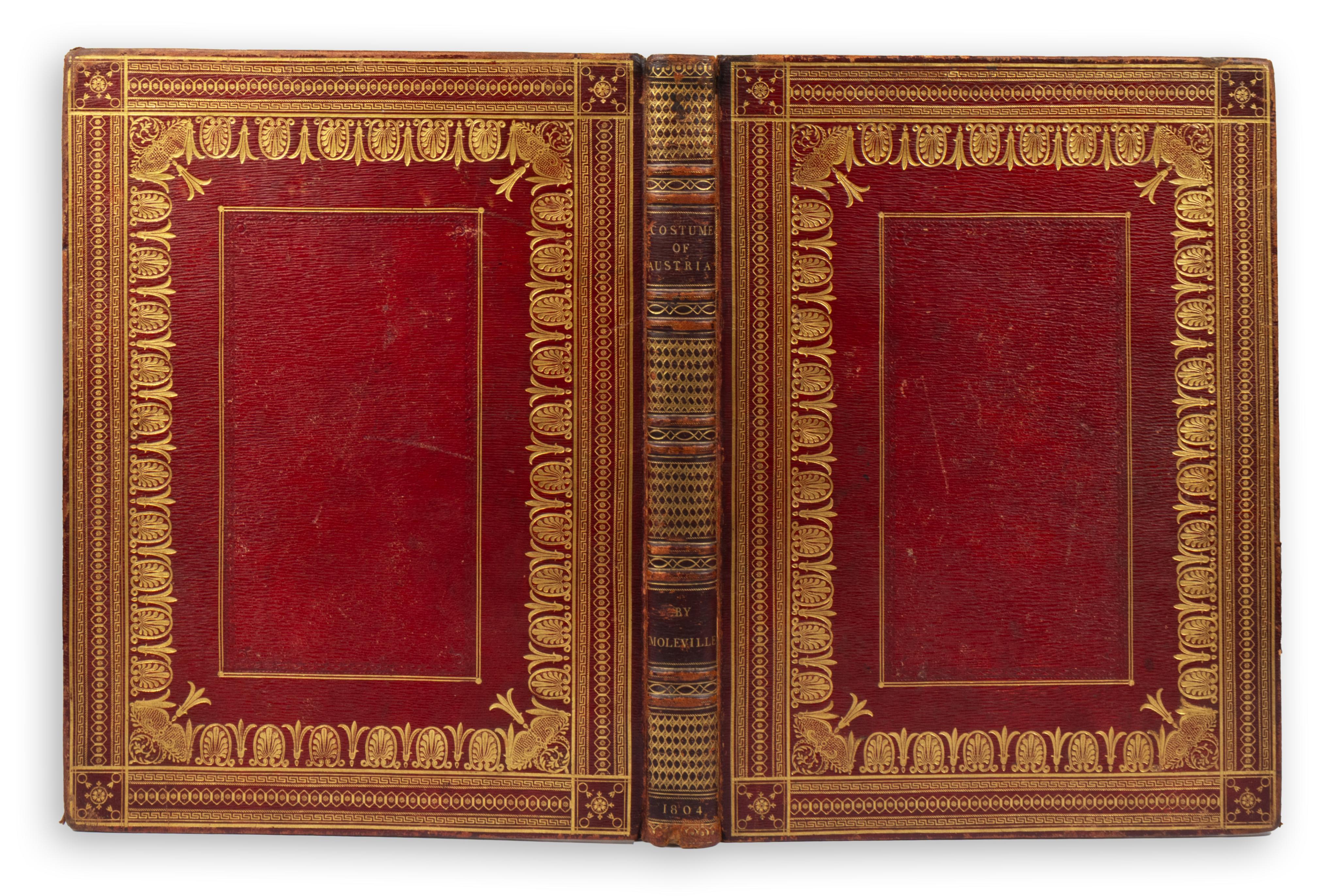 Kiadói, bordó, egész maroquin kötésben bordázott és aranyozott gerinccel, - Costume of Austria by Moleville 1804 - felirattal. A táblákon gazdagon aranyozott, keretezett és levelekkel díszített vaknyomásos mintákkal. Belül selyem előzéklapokkal, a táblák belső élein is aranyozott sormintával. Minimális kopásoktól és elszíneződésektől eltekintve, komplett, gyönyörű bibliofil kötet. Táblaverzón két vignetta. Folio: 365 x 260 mm.