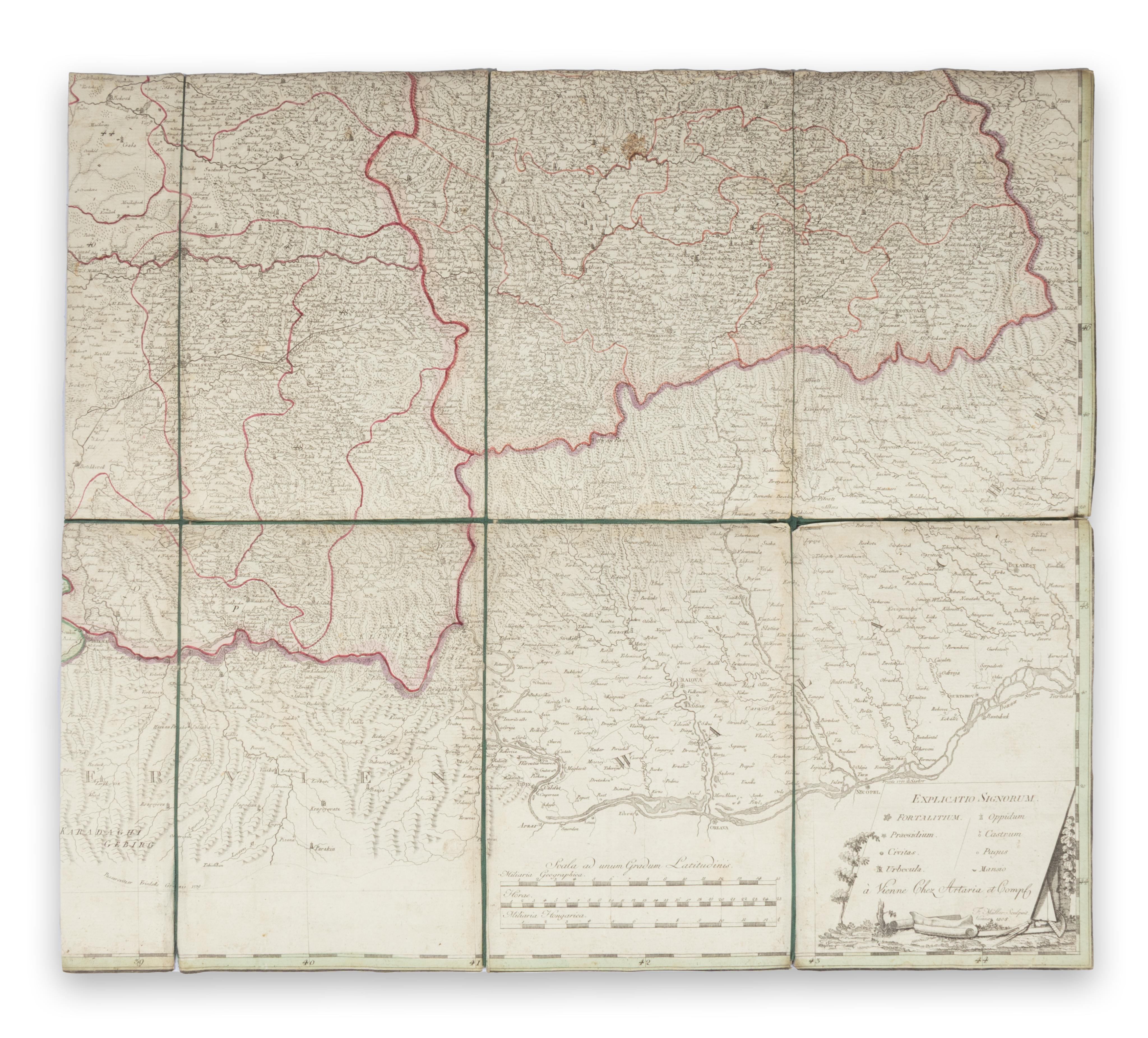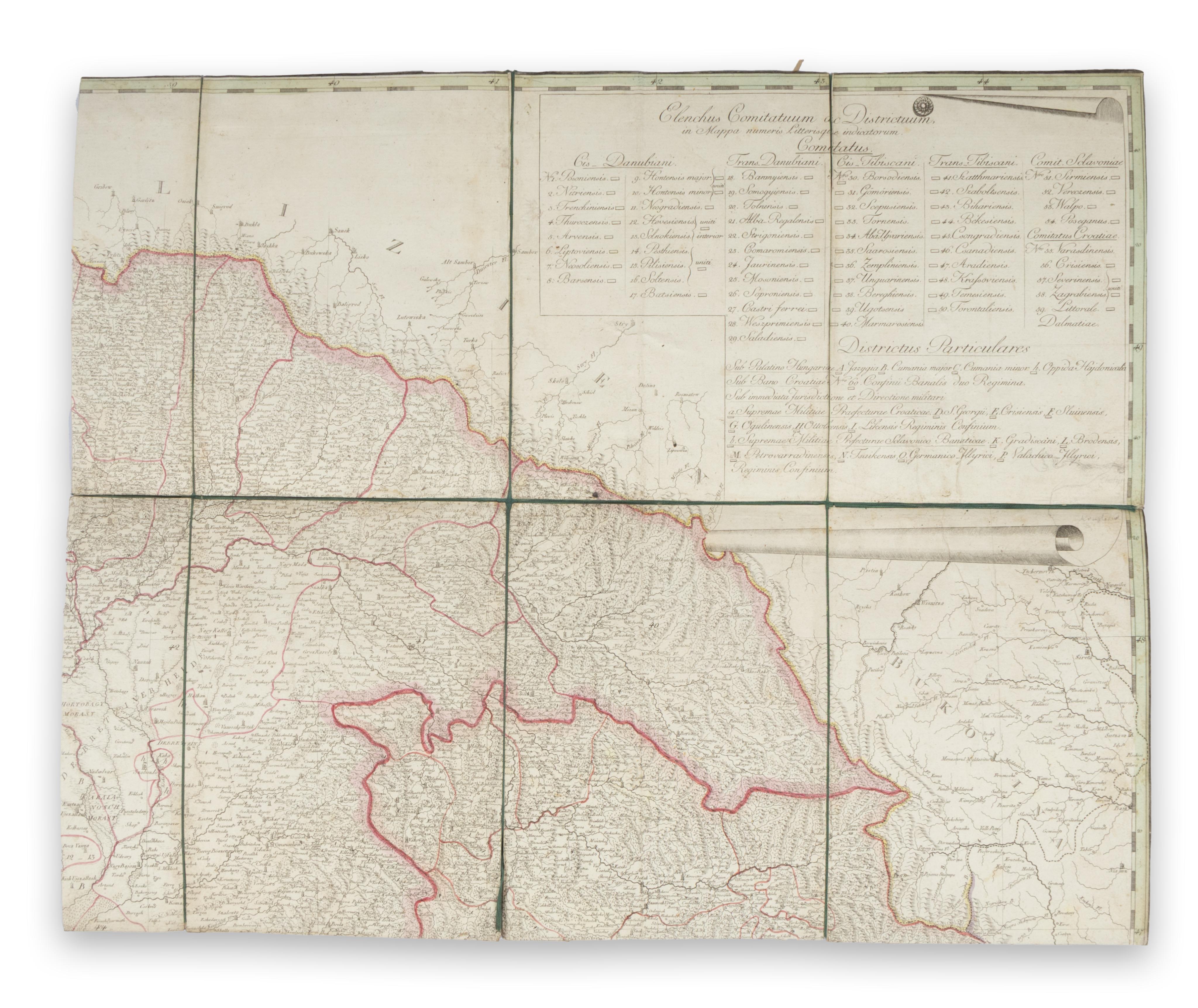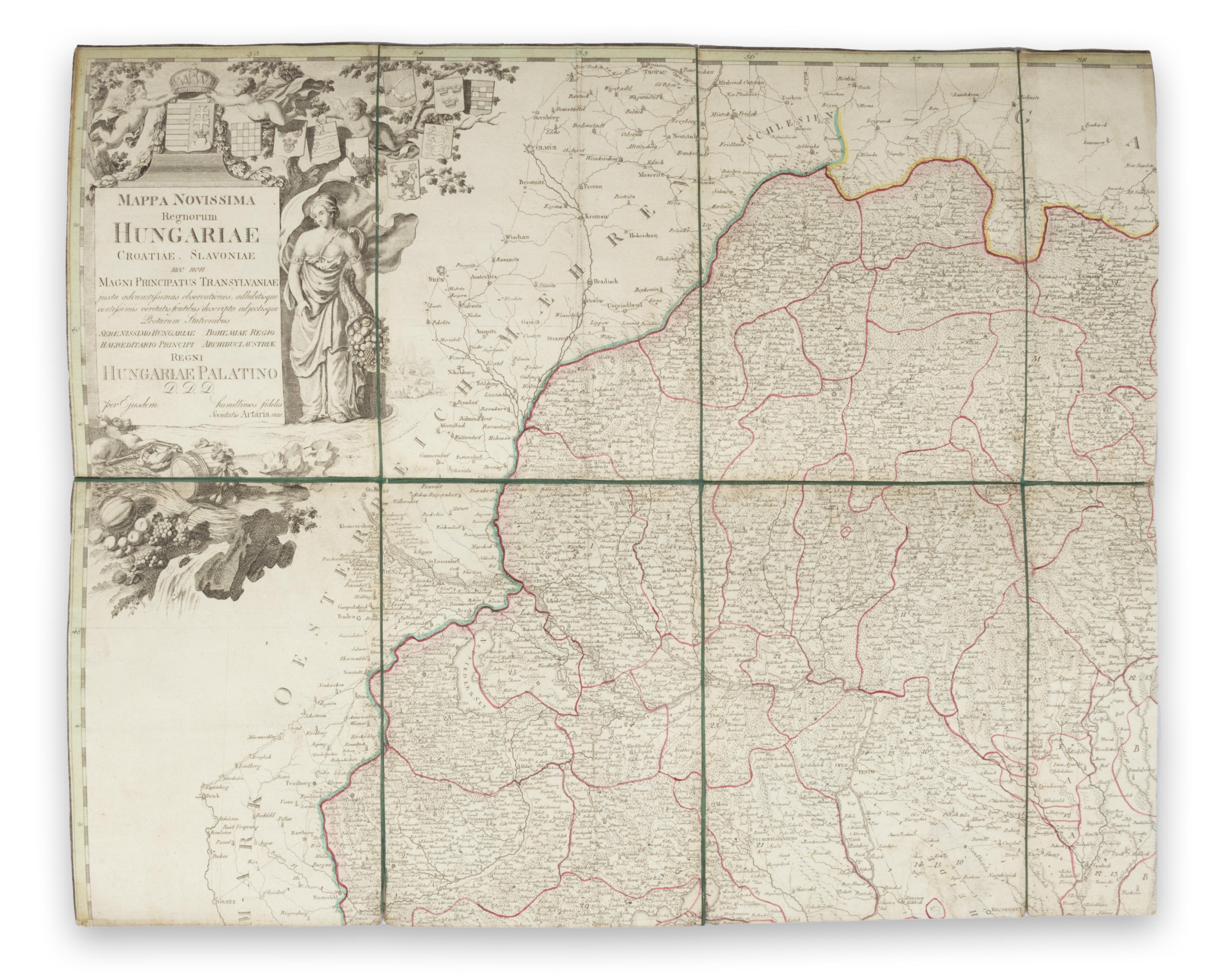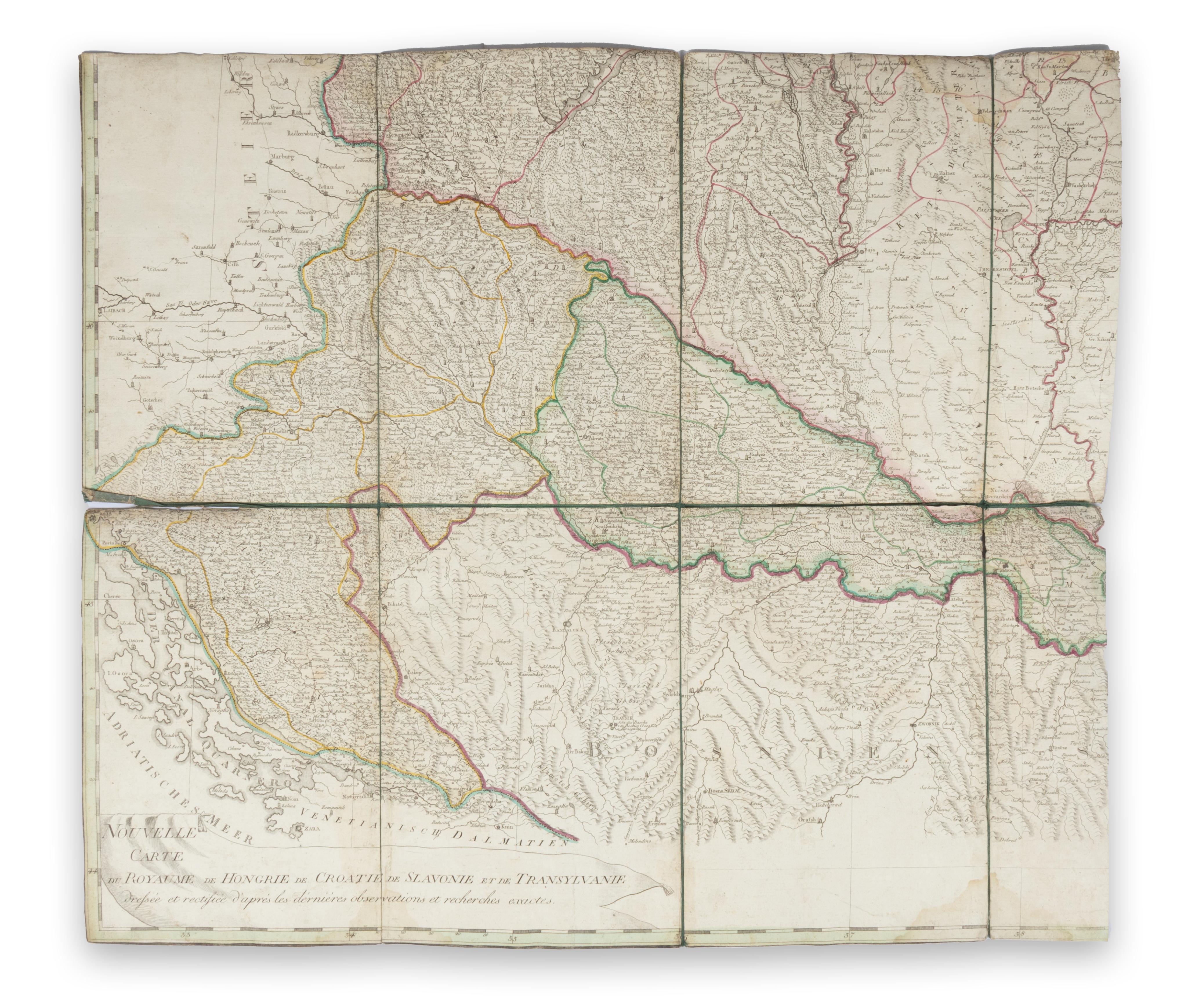 Rare. First published in 1792, here with only the date changed. 'It undoubtedly belonged to the best cartographic representations of Hungary of its time' (Dörflinger). – Somewhat stained in parts; occasional small losses (defects). Trimmed to/into the border, segmented, and mounted on marbled paper. Total size approx. 100 x 118 cm; not joined.