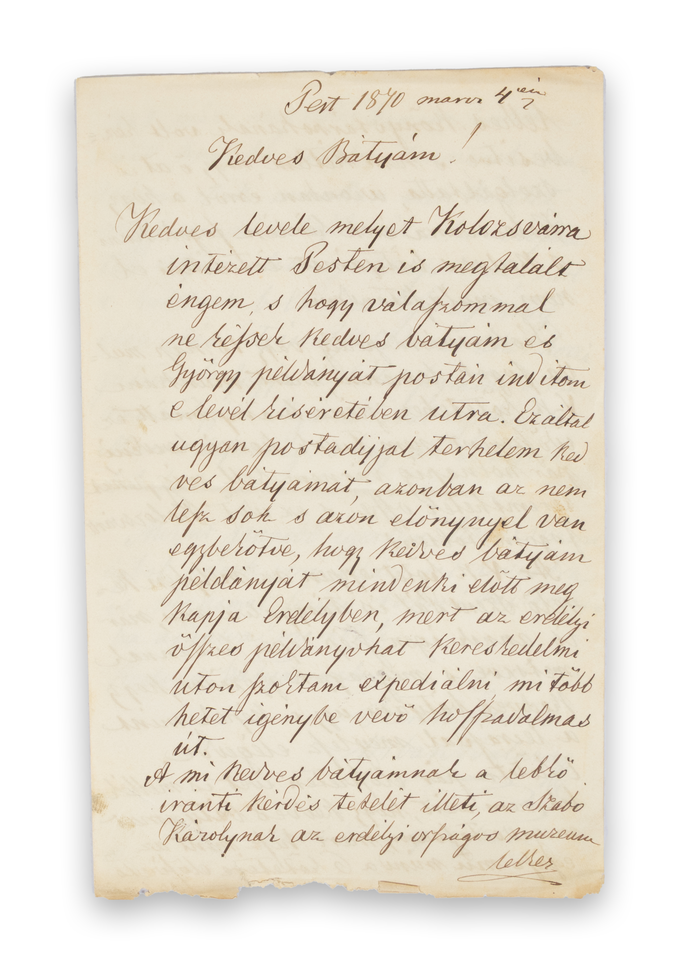 Egy hajtott levélen három beírt oldal, kelt: "Pest 1870. márcz. 4-én...Lakásom Váczi utcza 9. szám"