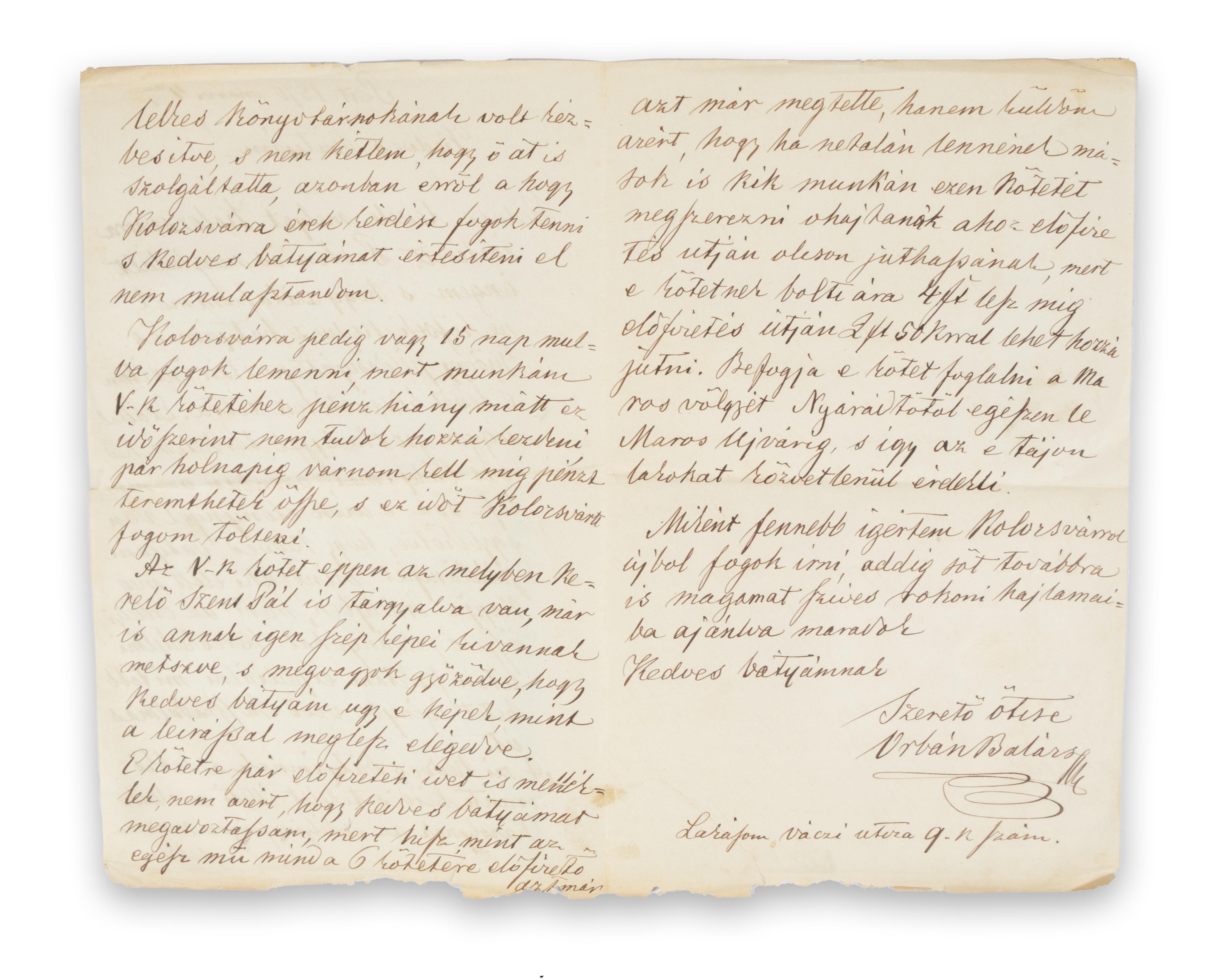 Orbán Balázs kézirat antikvár forgalomban rendkívül ritka, tudomásunk szerint árverésen még nem bukkant fel.