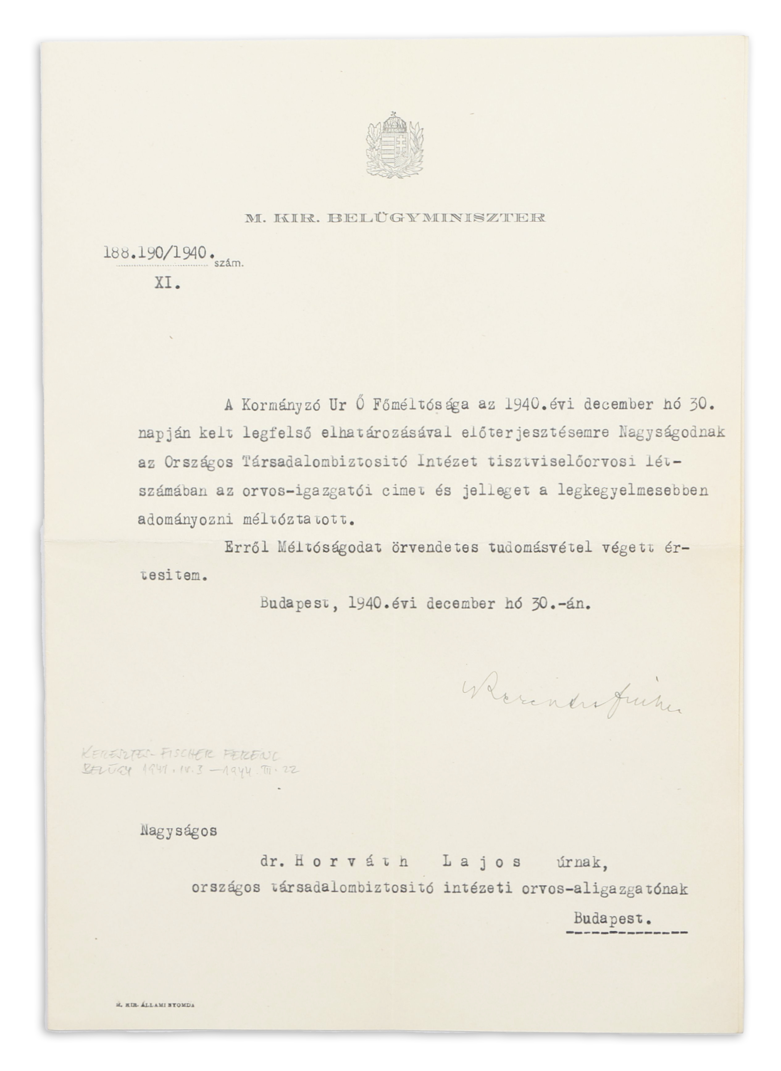 Budapest, 1940. december 30.Keresztes-Fischer Ferenc (1881–1948), az Imrédy-, Teleki-, Bárdossy-, majd a Kállay-kormány belügyminisztere, a kinevezési okiratot dr. Horváth Lajos, Országos Társadalombiztosító Intézet orvos-aligazgató nevére állította ki: „A Kormányzó Úr Ő Főméltósága előterjesztésemre Nagyságodnak az orvos-igazgatói címet és jelleget a legkegyelmesebben adományozni méltóztatott.” Horváth Lajos (1895–1972) fogorvos, egyetemi magántanár több fogászat tárgyú könyv szerzője volt, 1940–1944 között pedig a Fogorvosok Lapjának szerkesztőjeként is tevékenykedett. Az 1927. évi XXI. törvénycikkel létrejött Országos Társadalombiztosító Intézet fő feladata a társadalombiztosítás rendszer átszervezése volt.