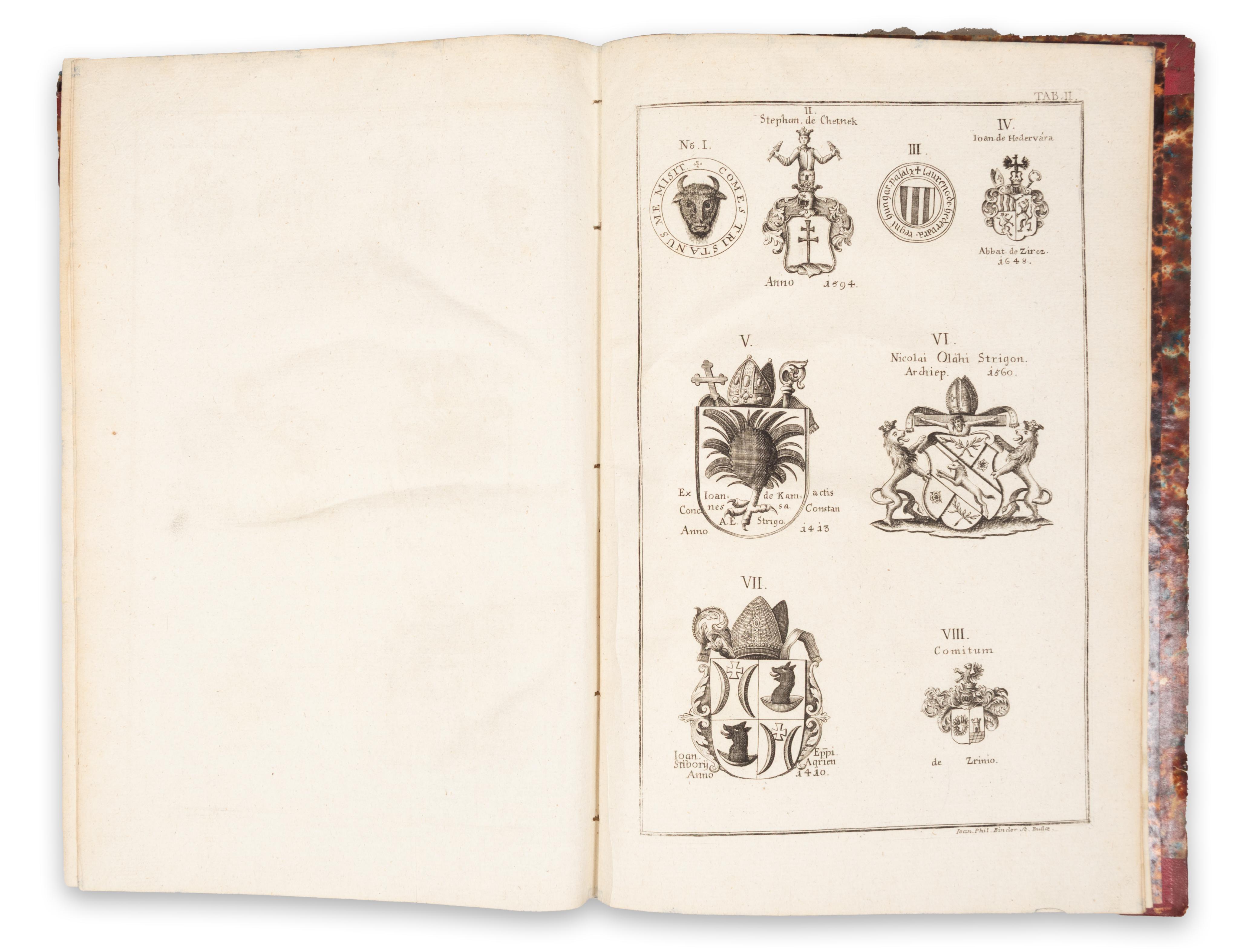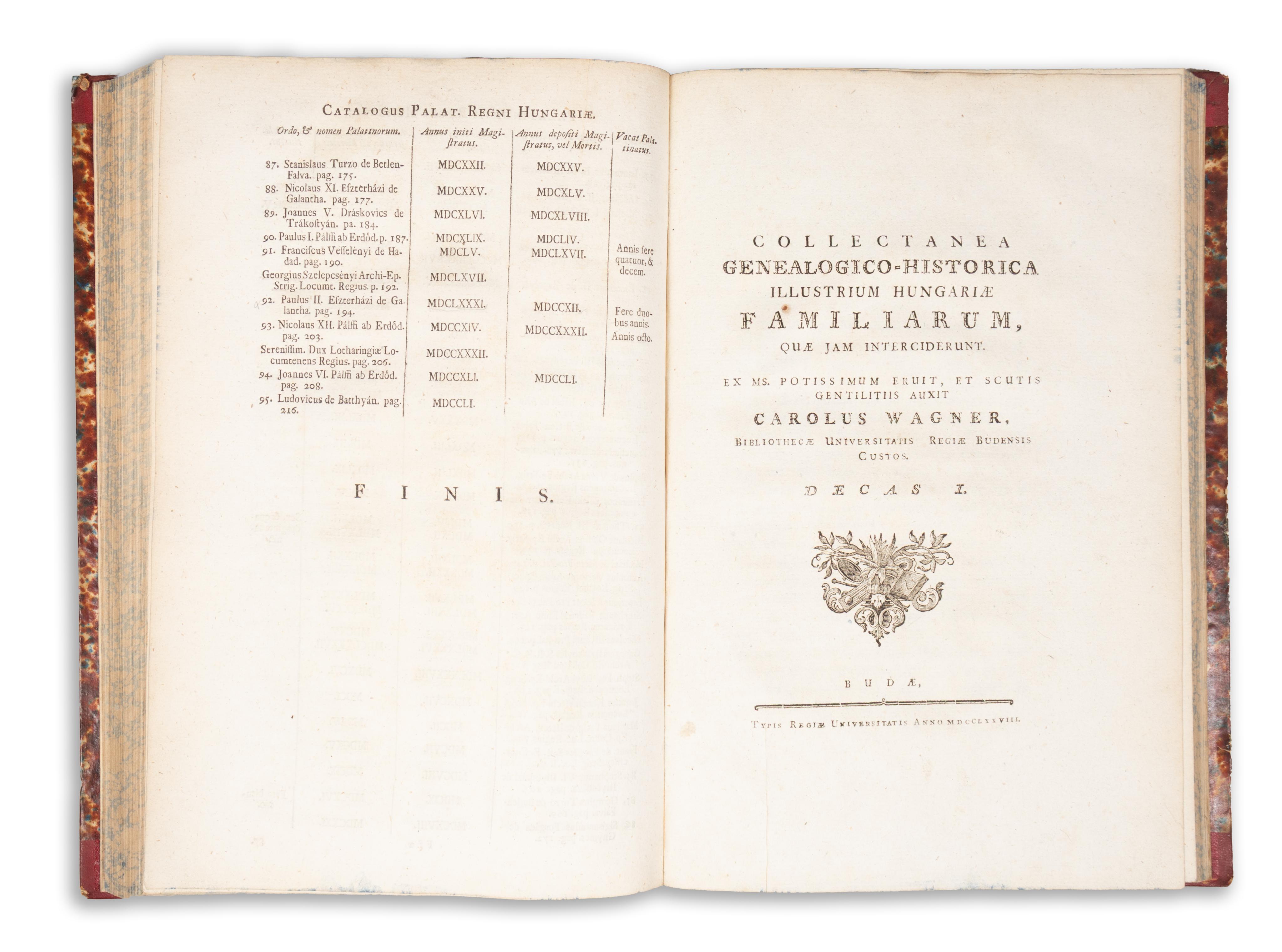 First edition of Károly Wagner's work presenting the most important Hungarian noble families. Wagner (1732–1790) was a Jesuit monk, historian, and professor of heraldry and sigillography.