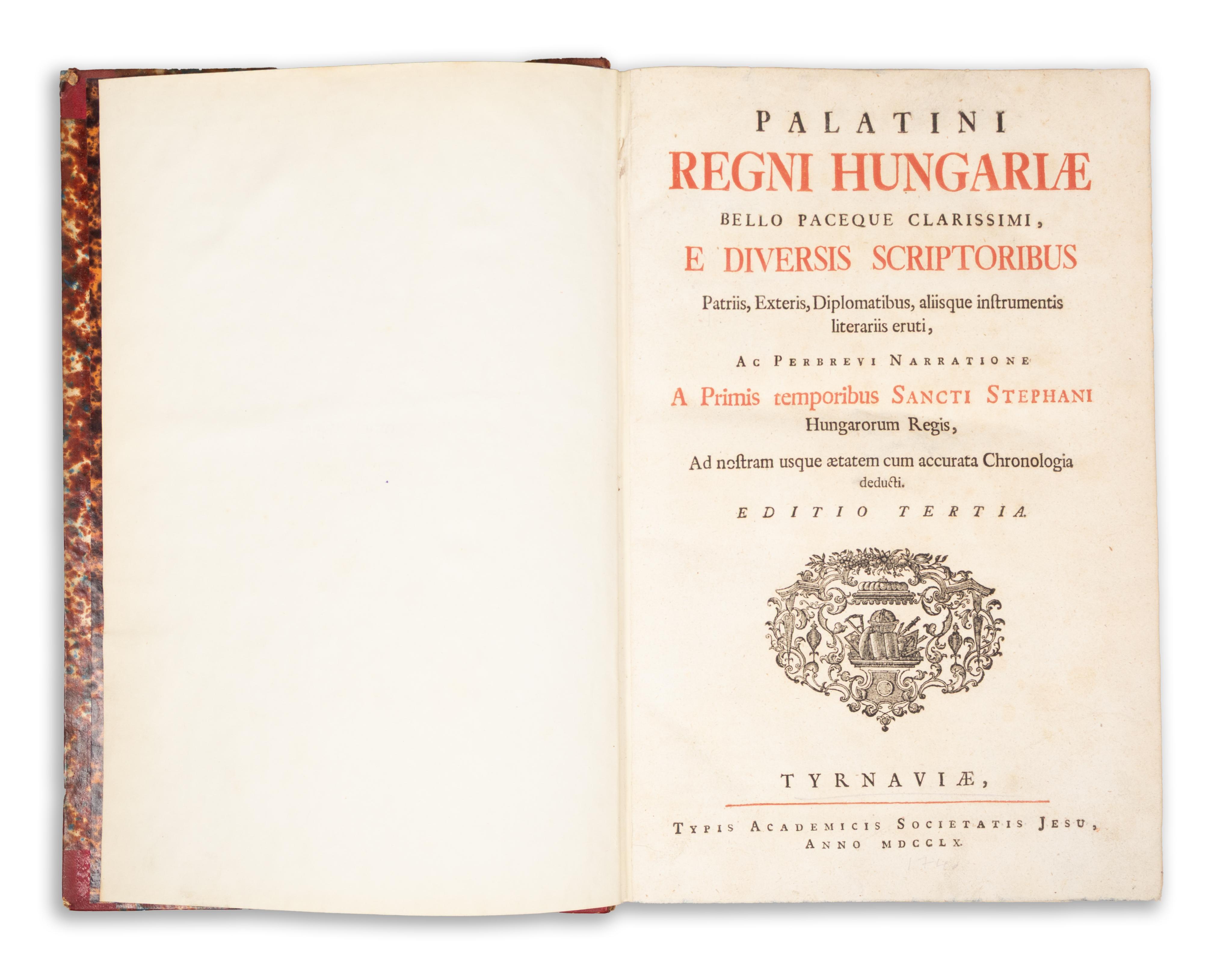 [Nagyszombat] Tyrnaviae, Typis Academis Societatis Jesu, 1760Palatini Regni Hungariae bello paceque clarissimi, e diversis scriptoribus patriis, exteris, diplomatibus, aliisque instrumentis literariis eruti, ac perbrevi narratione a primis temporibus sancti Stephani Hungarorum regis, ad nostram usque aetatem cum accurata chronologia deducti. Editio tertia.