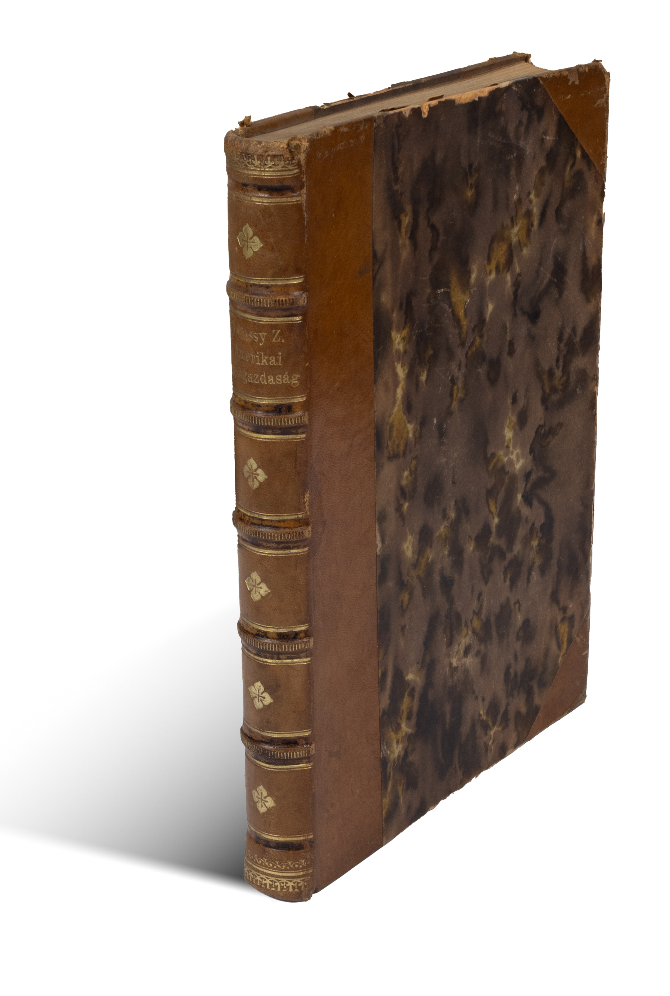 Korabeli bordázott gerincű és aranyozott félbőr kötésben, erezett, festett lapszélekkel. Kissé kopott, de így szép bibliofil kötés. A címlapon elmosódott bélyegző.