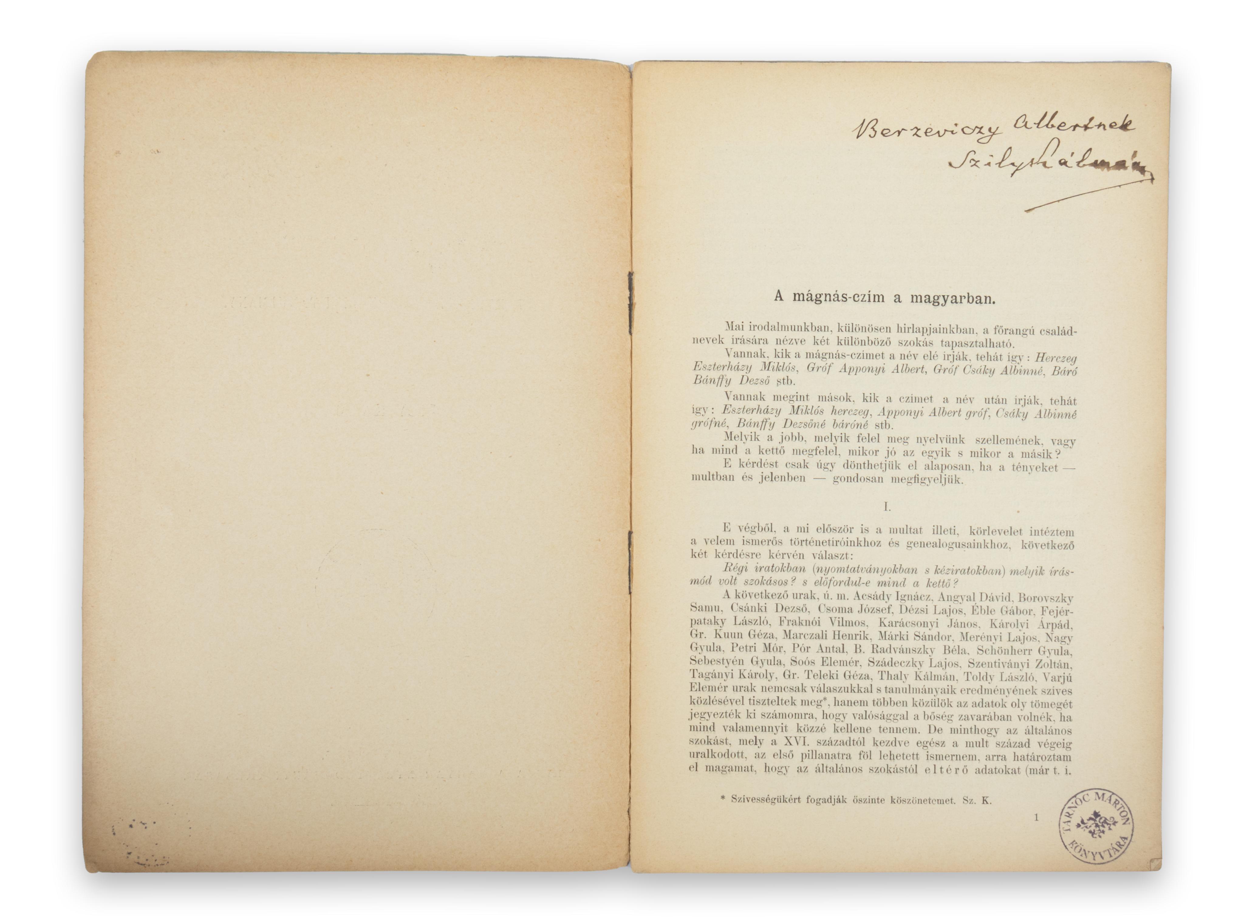 18 p. Az első oldalon a szerző dedikációja Berzeviczy Albertnek. Berzeviczy Albert (1853–1936) politikus, történetíró, a Magyar Tudományos Akadémia, a Kisfaludy Társaság elnöke, és a Magyar Olimpiai Bizottság elnöke.