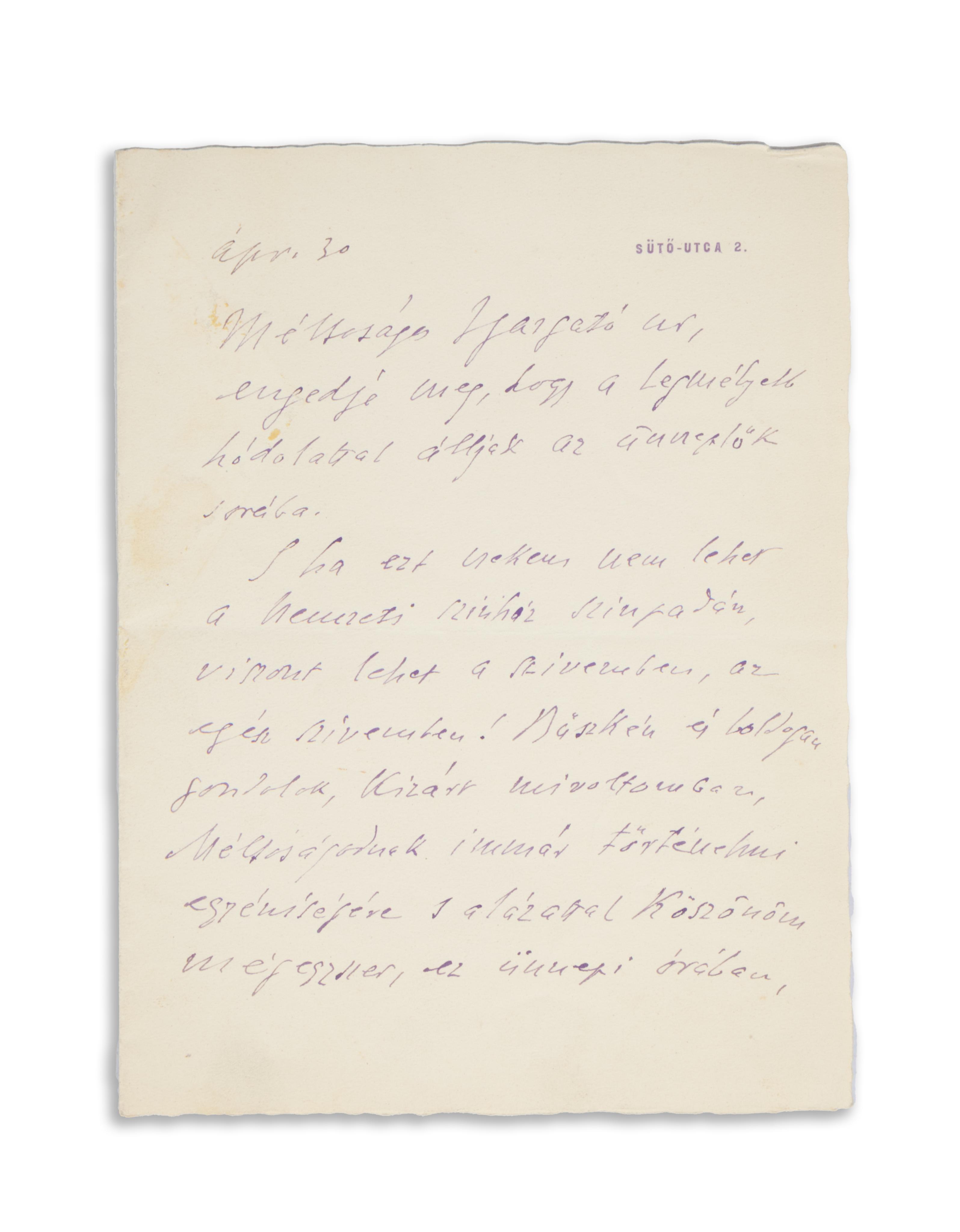Kézirat, 2 fol. 2 beírt oldal, Szomory "Sütő-utca 2." fejléces papírján. Hajtás nyoma, az első lapon egészen halvány és apró foltosodással. Nagyon jó állapotban.