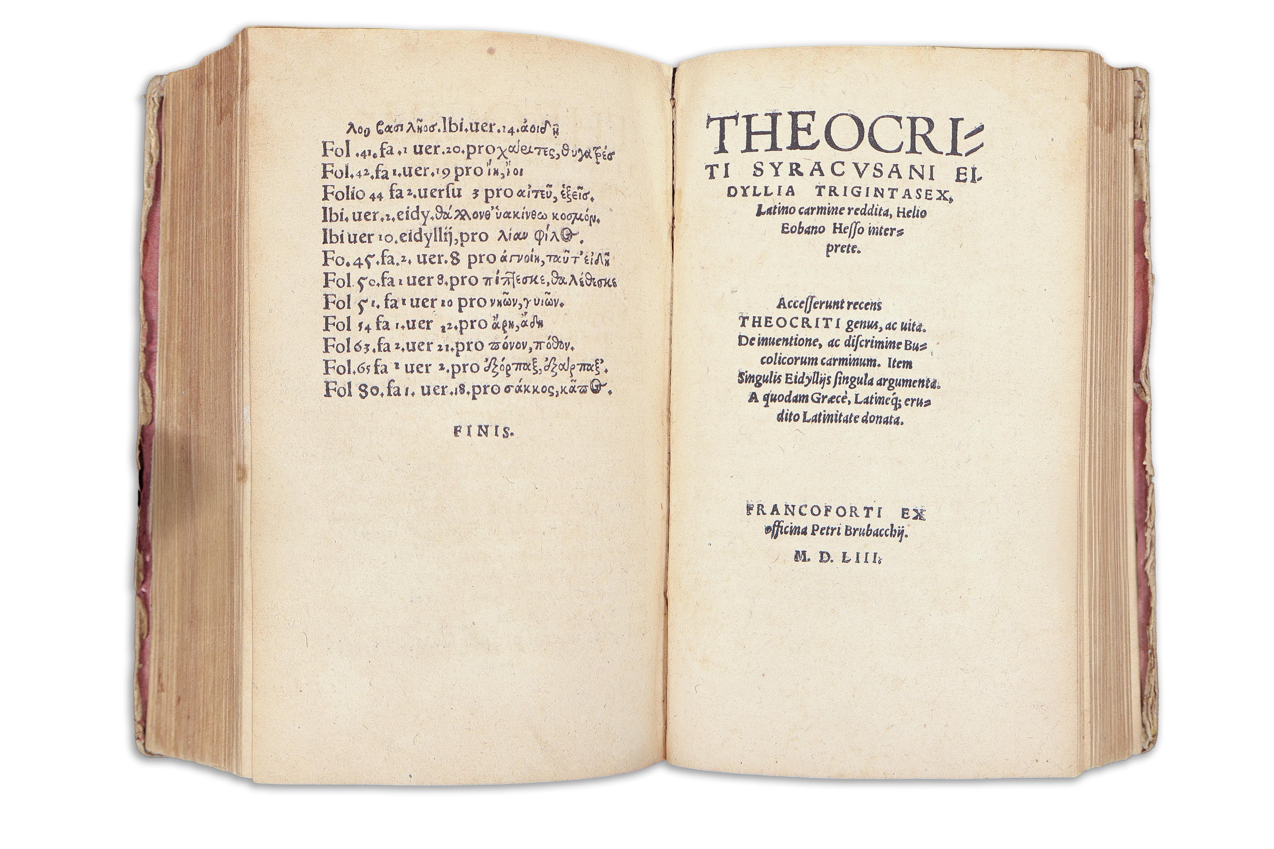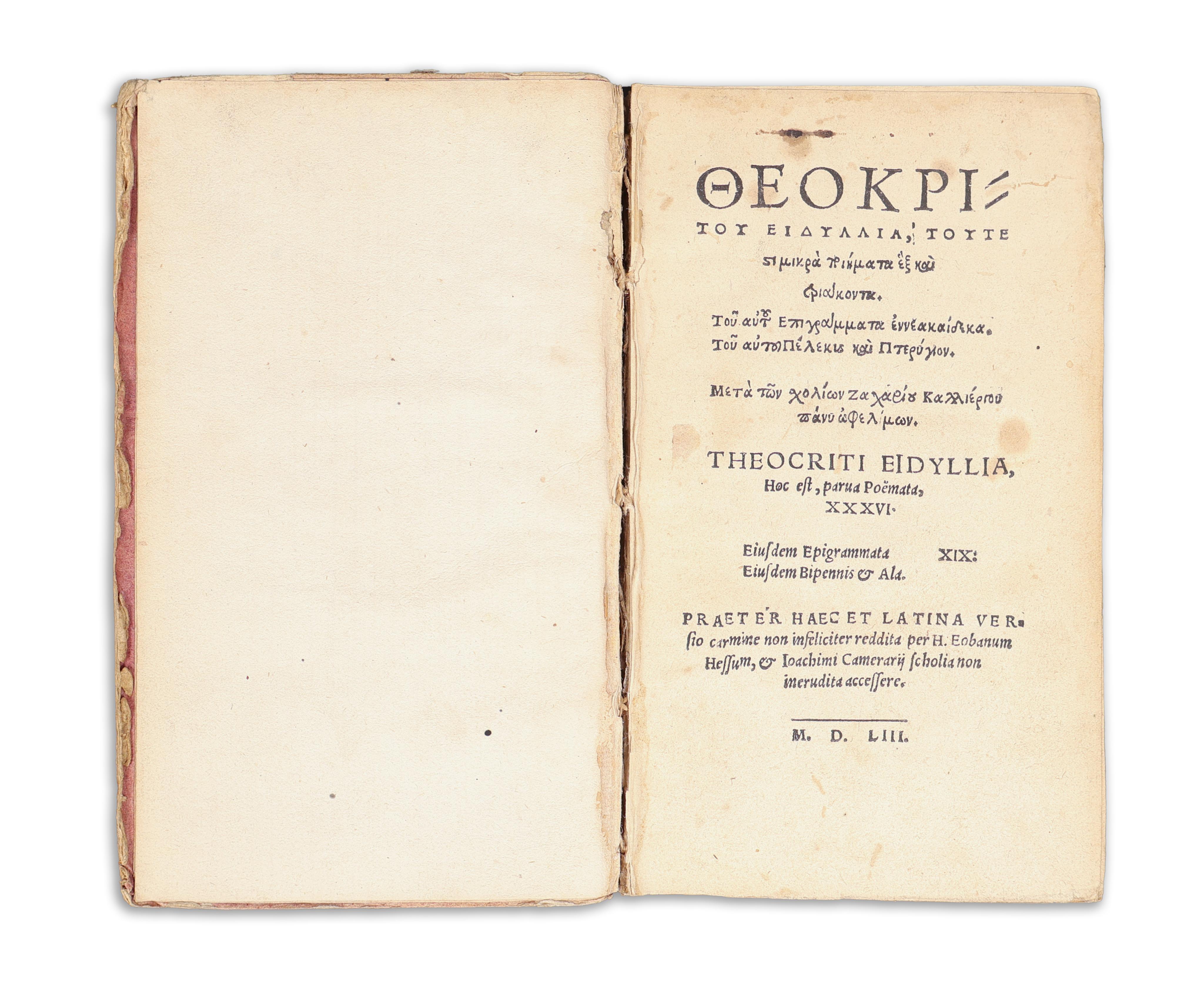 Francofurti, 1553. Ex officina Petri Brubacchii.Theokritu Eidyllia, Tutesti, mikra poiēmata hex kai triakonta. Tu aytu Epigrammata enneakaideka. Tu aytu Pelekys kai Pterygion. Meta tōn scholiōn Zachariu Kalliergu ... Theocriti Eidyllia, Hoc est, parua Poëmata, XXXVI. Eiusdem Epigrammata XIX. Eiusdem Bipennis et Ala. Prater haec et latina versio carmine non infeliciter reddita per H.Eobanum Hessum, et Ioachimi Camerarij scholia non inerudita accessere.